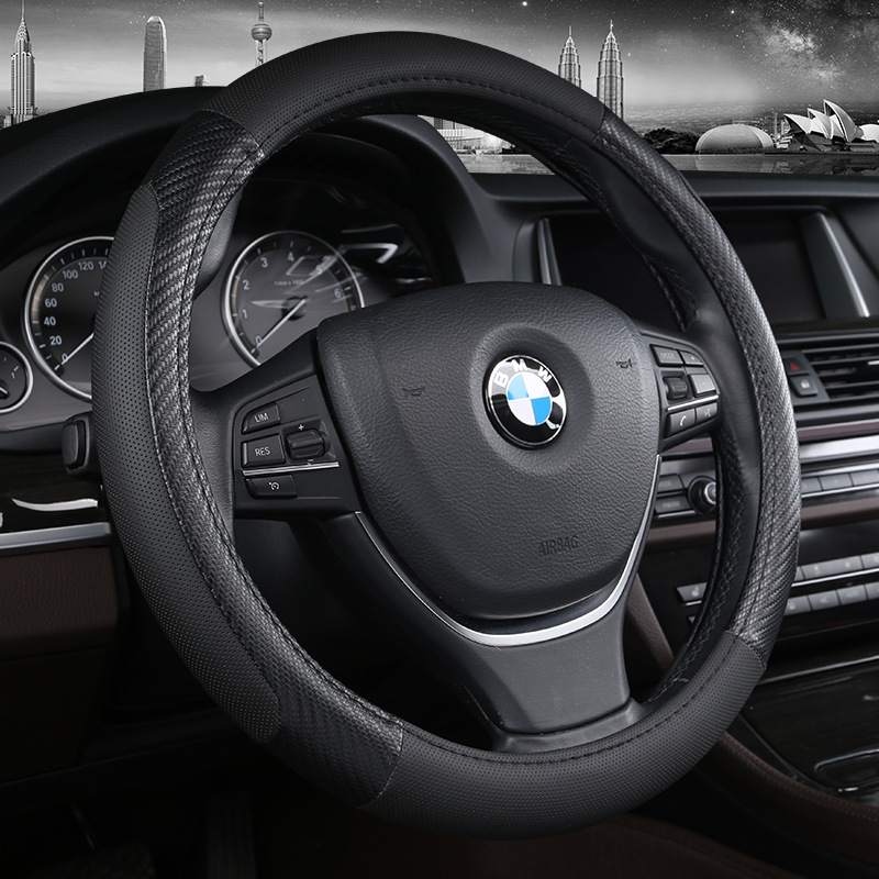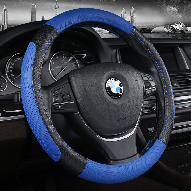 크로스 보더 뉴 카 스티어링 휠 커버 2 색 스티칭 미끄럼 방지 통기성 가죽 탄소 섬유 4 계절 자동차 핸들 커버 도매스토어 가기
