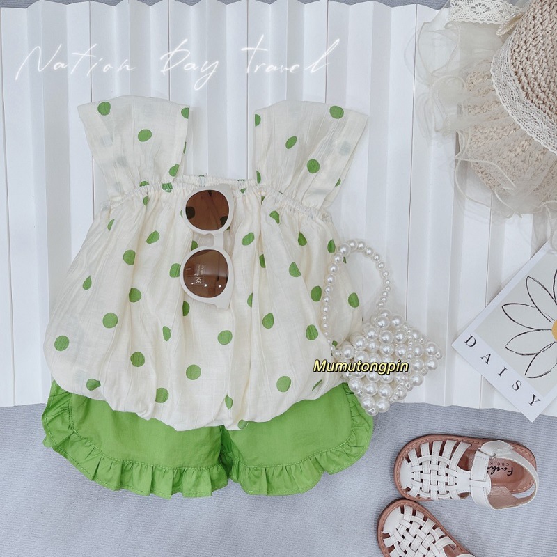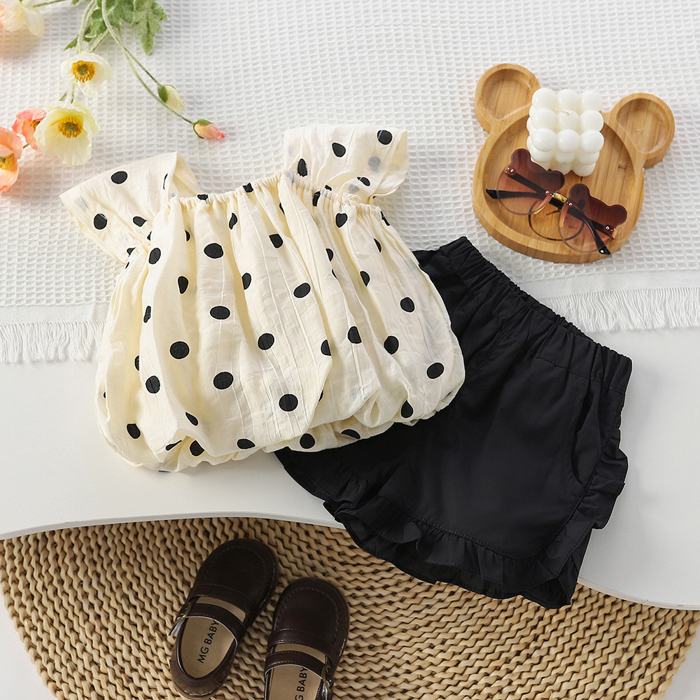 S 스타일 여자 한국 물방울 무늬 세트 멜빵 + 반바지 유행 세트 패션 쉬폰 투피스 여름스토어 가기