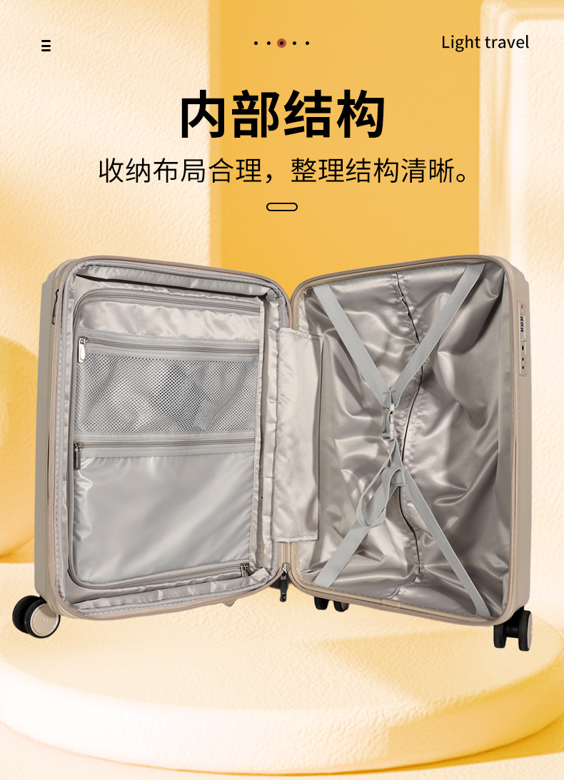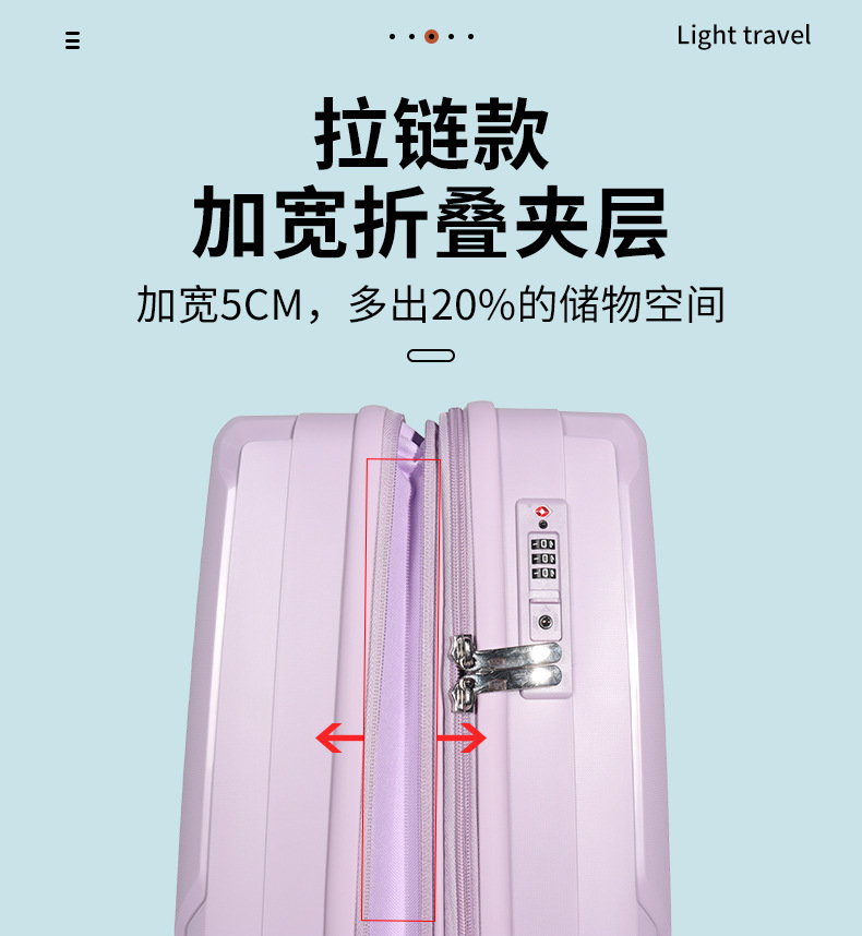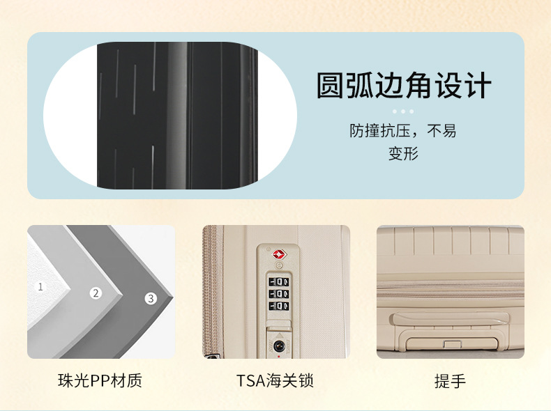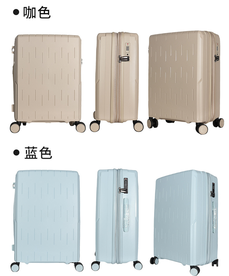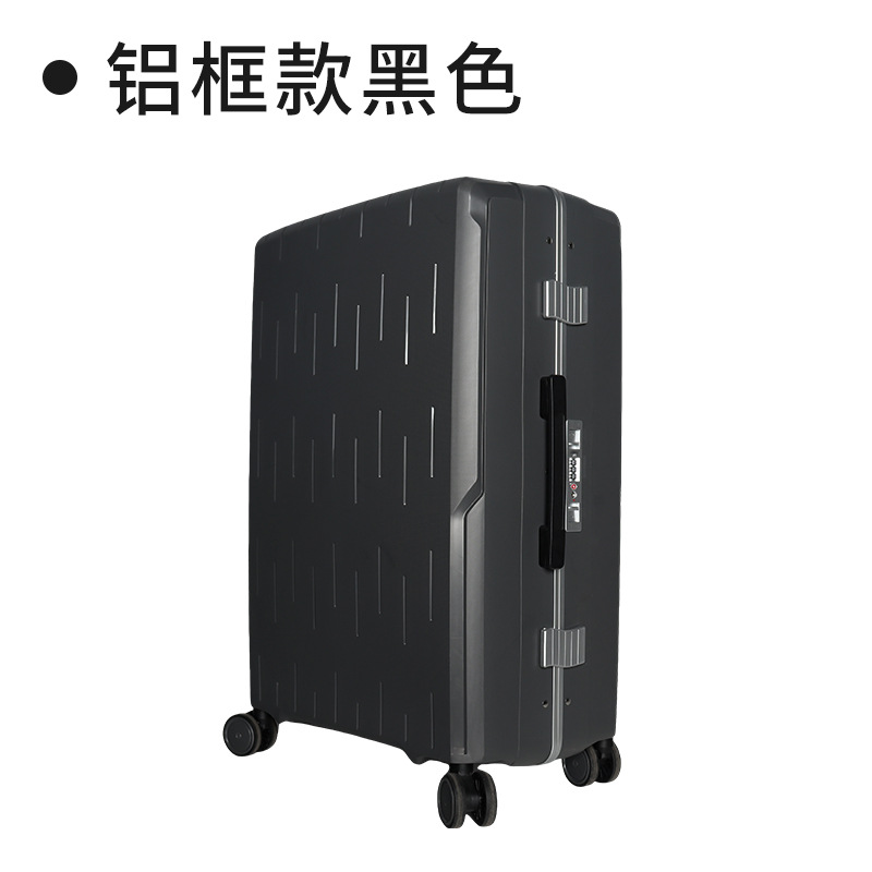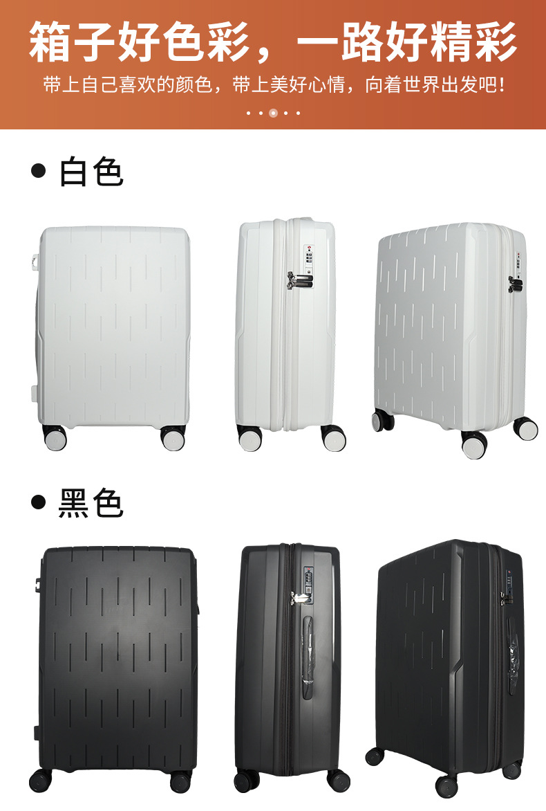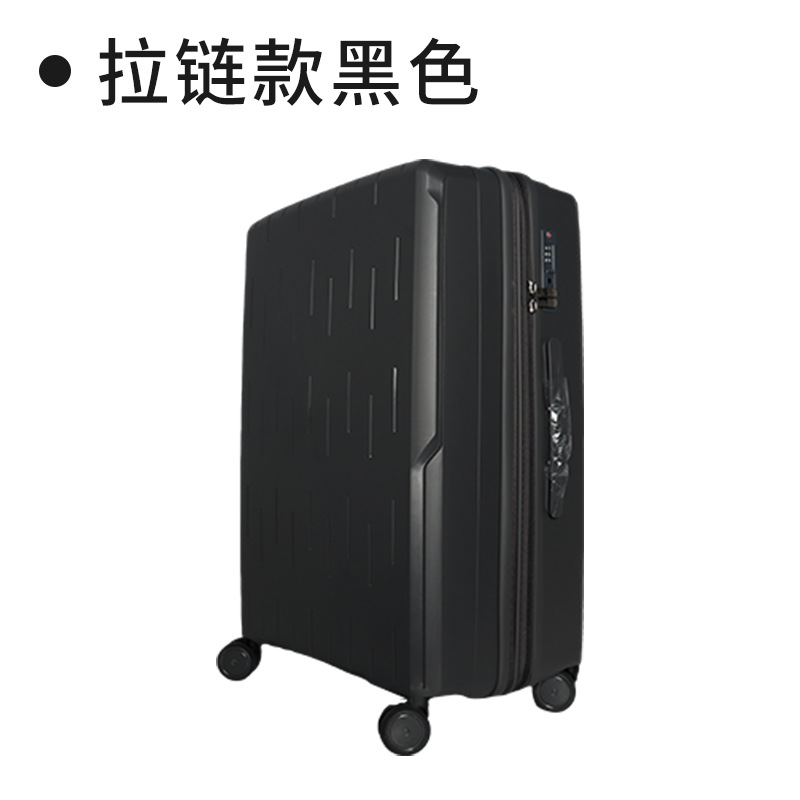 防破损注塑PP材质(新秀丽同等级规格PP材质),防爆拉链,5厘米扩容层,TSA海关密码锁,带挂钩的脚钉,加厚铝合金拉杆,静音万向轮。