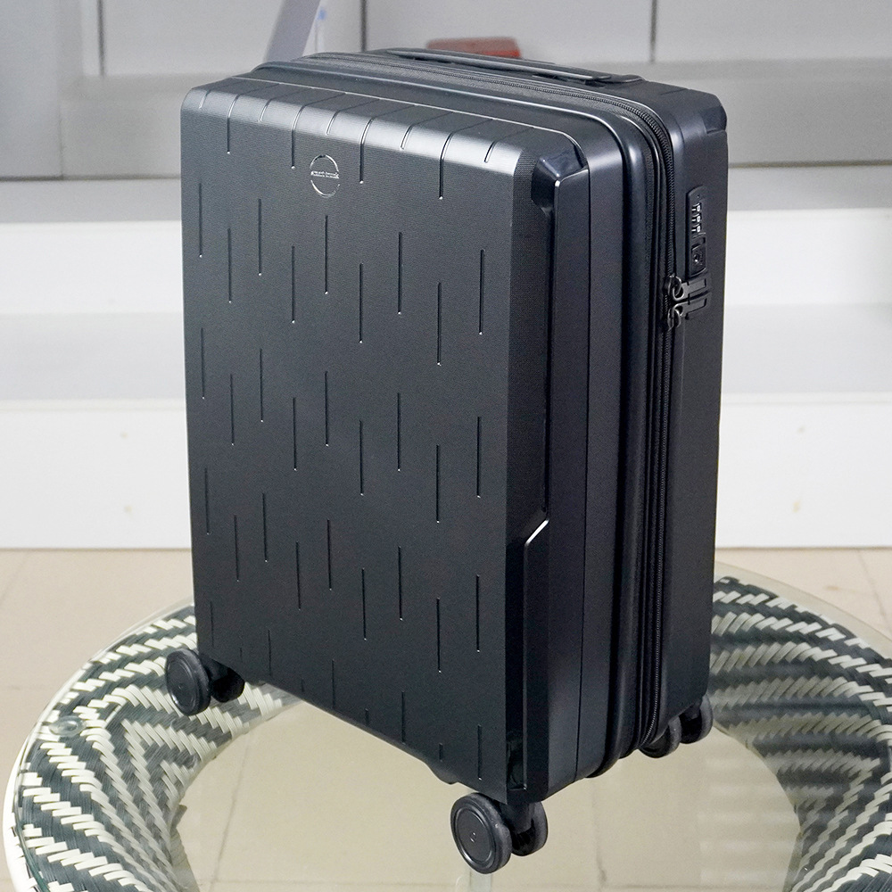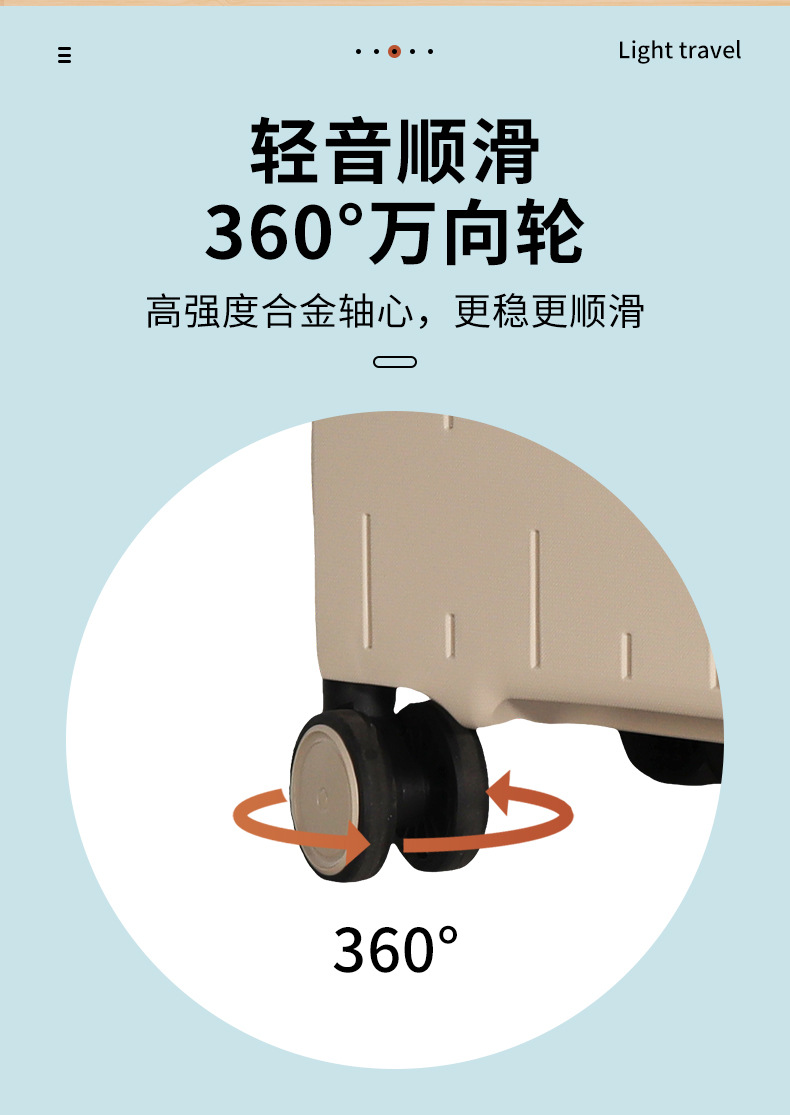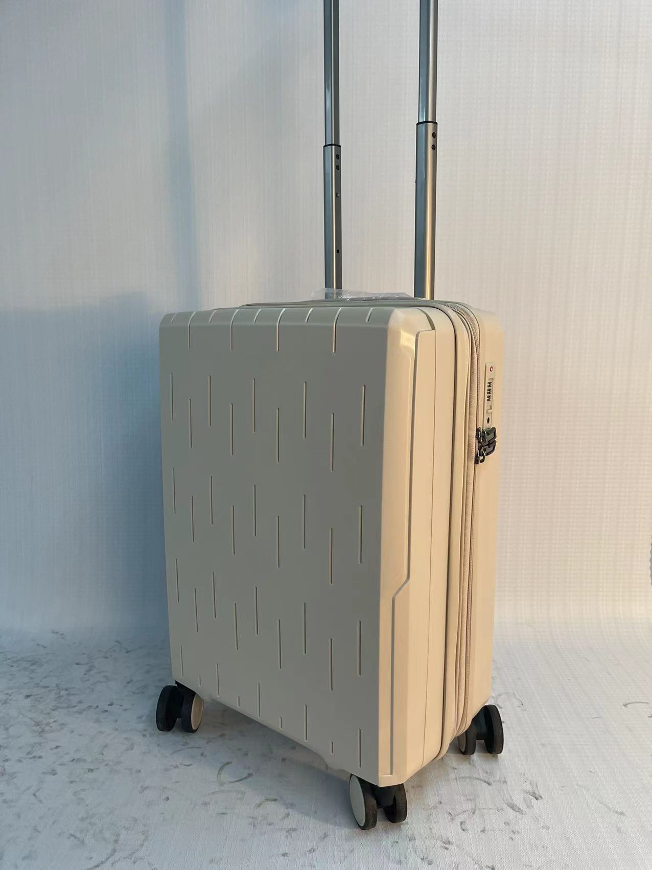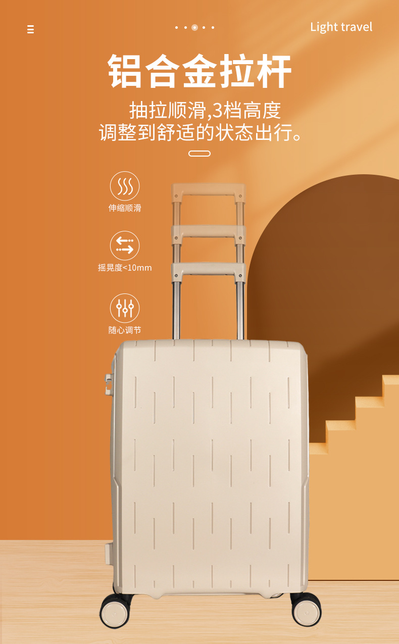防破损注塑PP材质(新秀丽同等级规格PP材质),防爆拉链,5厘米扩容层,TSA海关密码锁,带挂钩的脚钉,加厚铝合金拉杆,静音万向轮。
