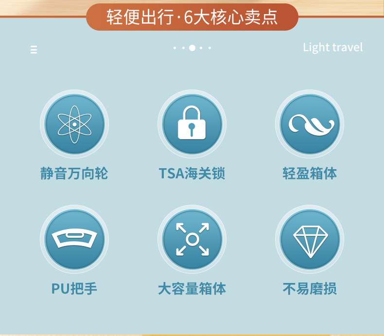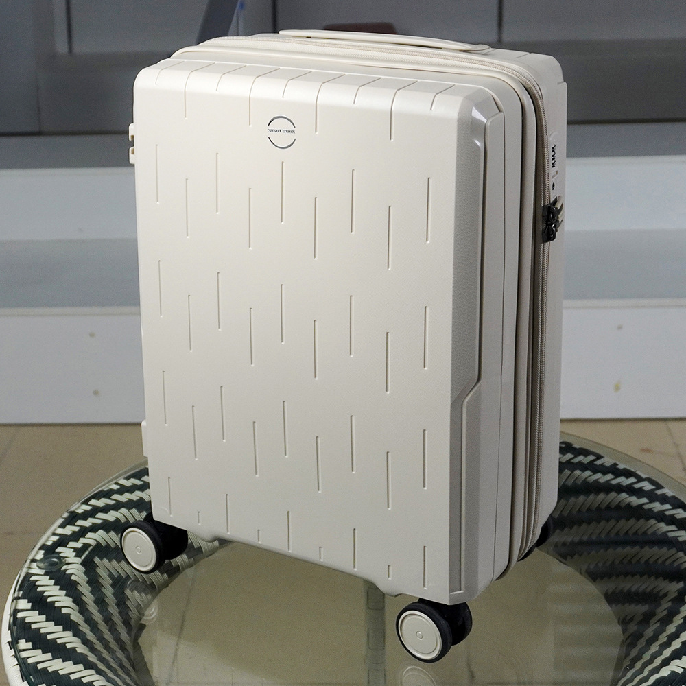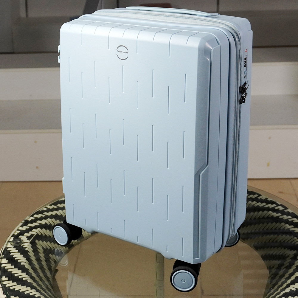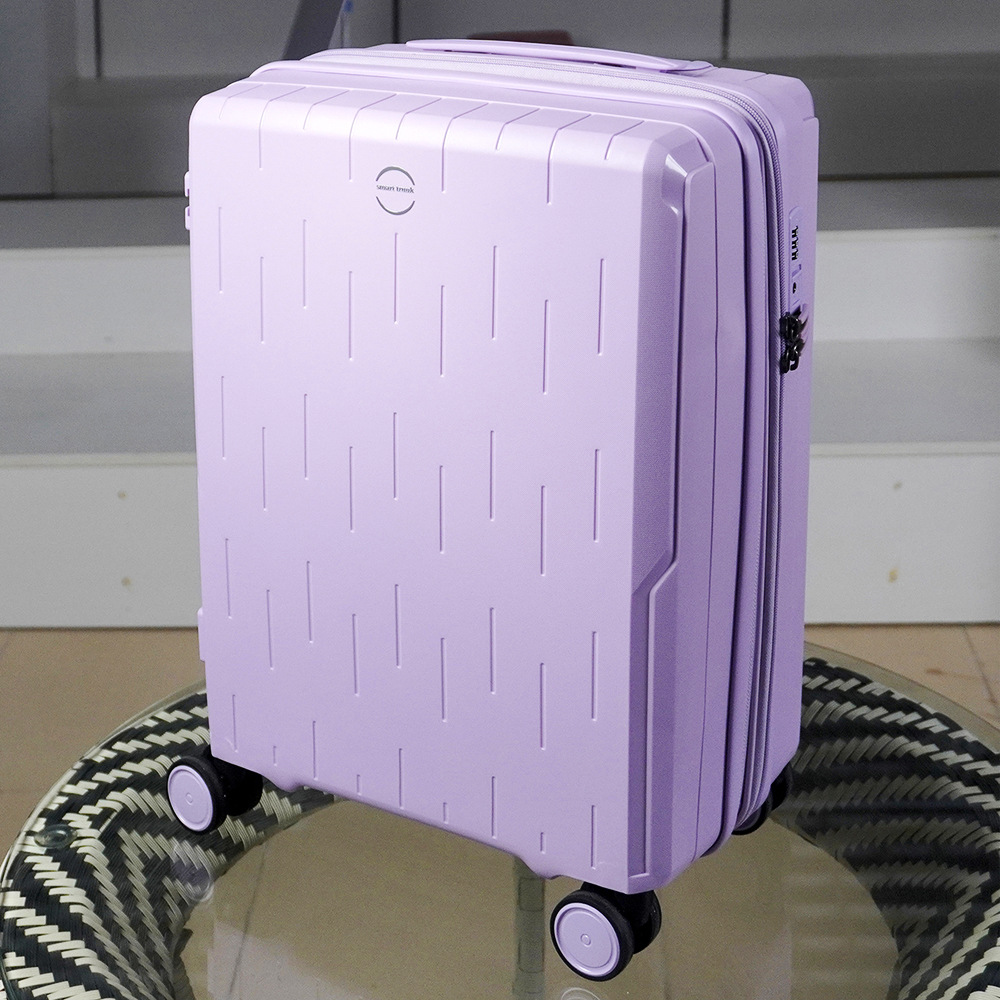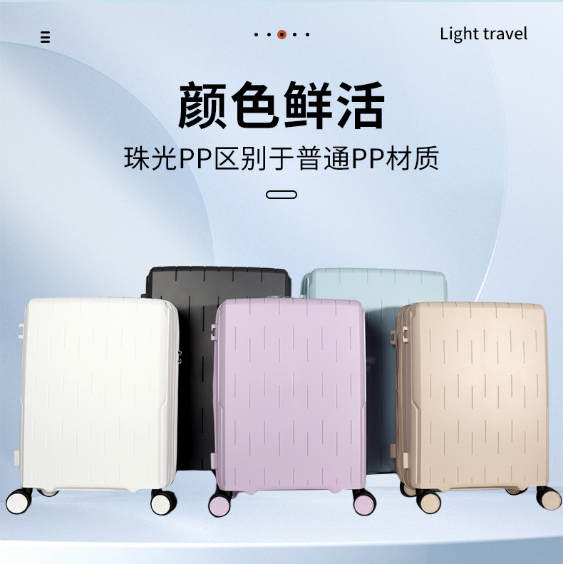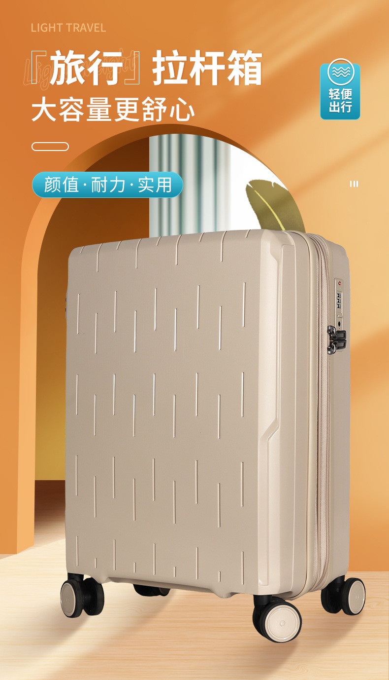 防破损注塑PP材质(新秀丽同等级规格PP材质),防爆拉链,5厘米扩容层,TSA海关密码锁,带挂钩的脚钉,加厚铝合金拉杆,静音万向轮。