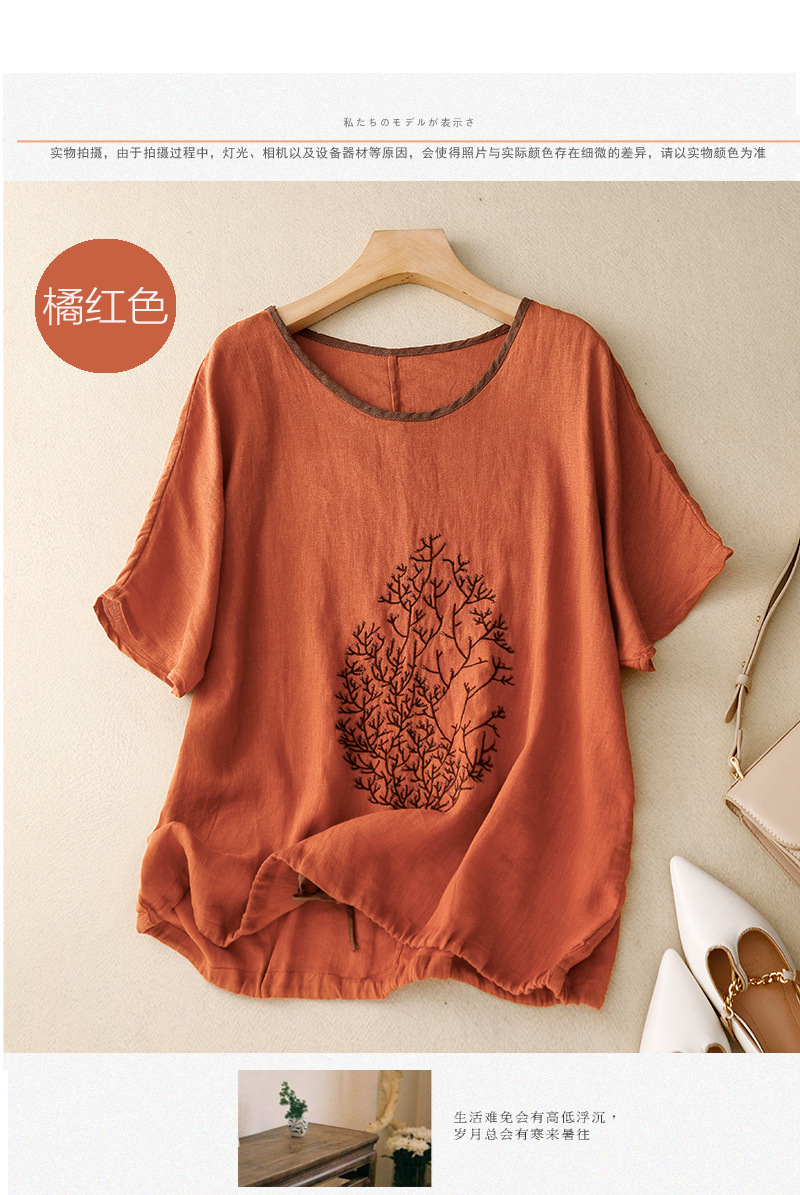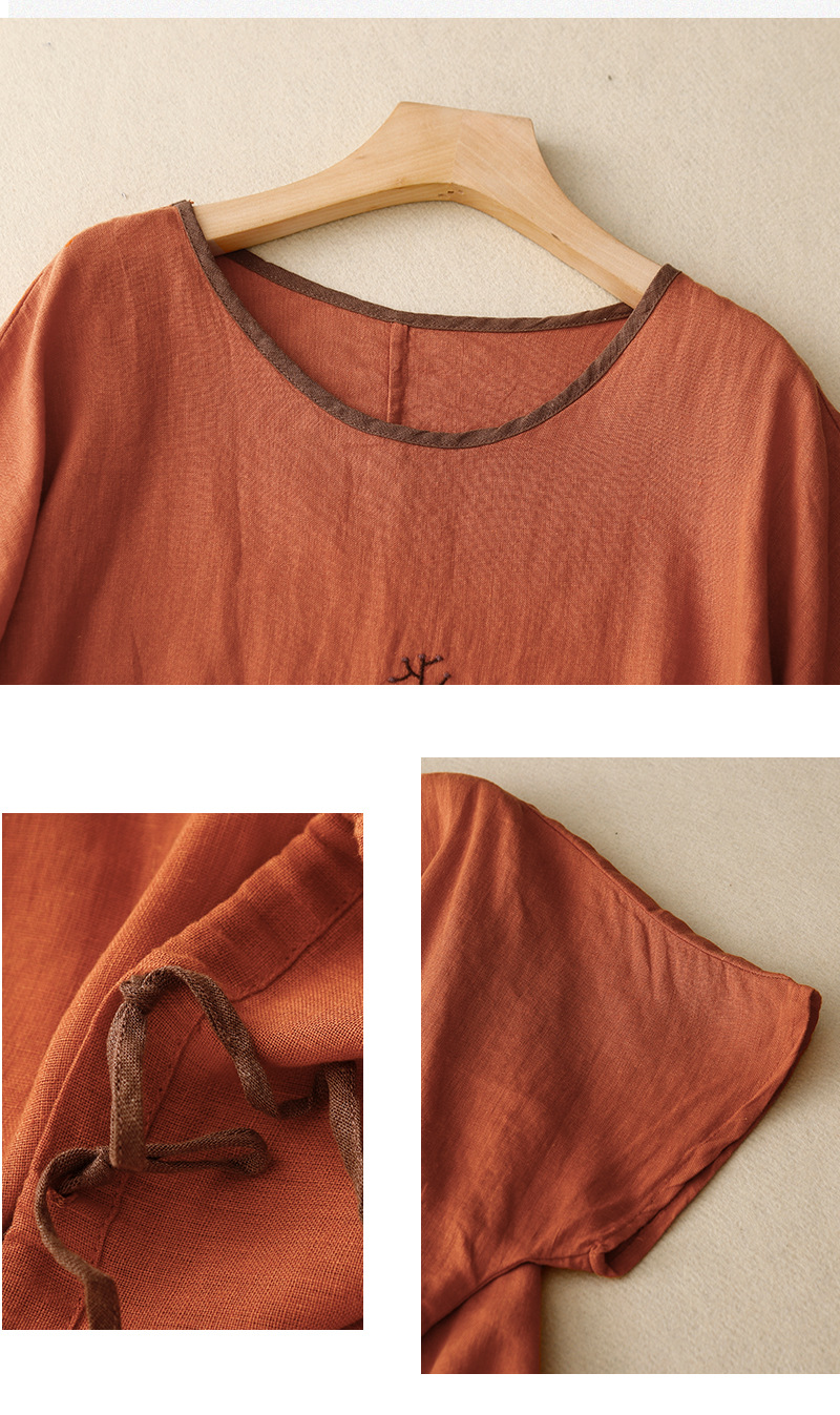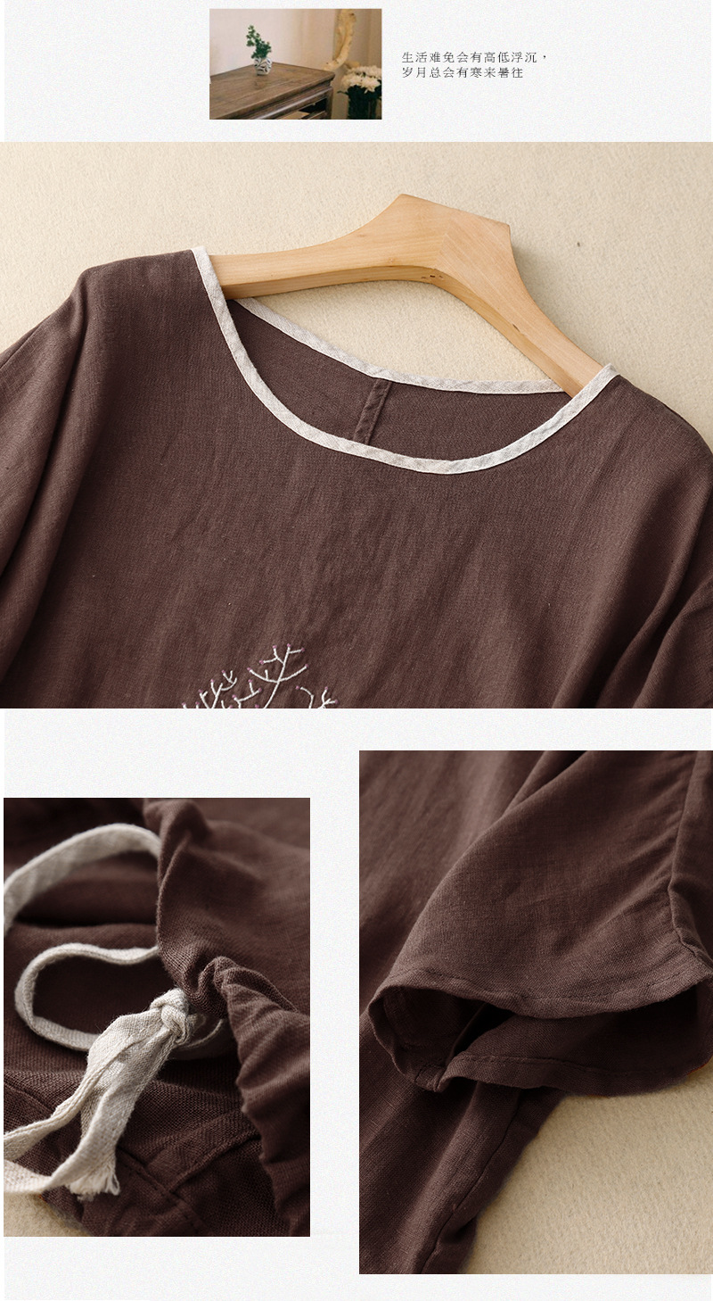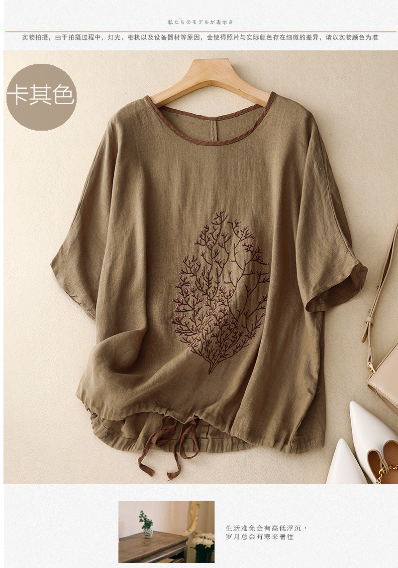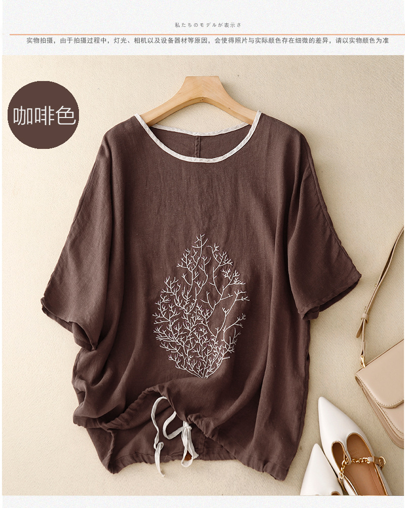 Real Shot 2025 새로운 여름 스타일 문학 느슨한 수 놓은 꽃 면화와 린넨 라운드 넥 반팔 티셔츠 여성 Drawstring 탑 # 9380스토어 가기