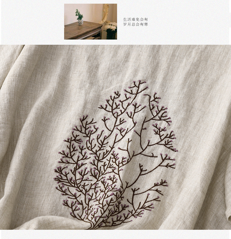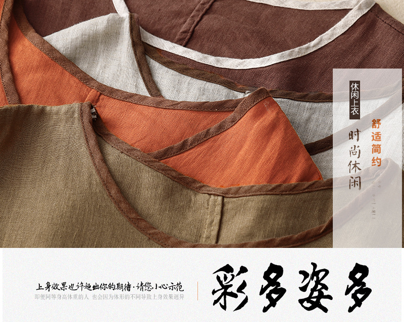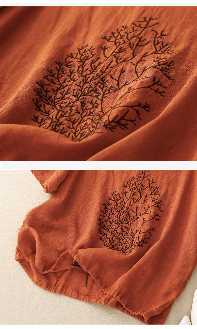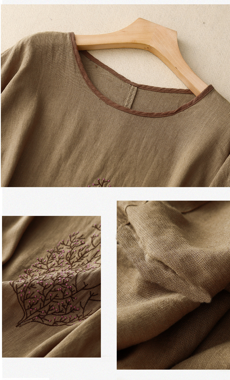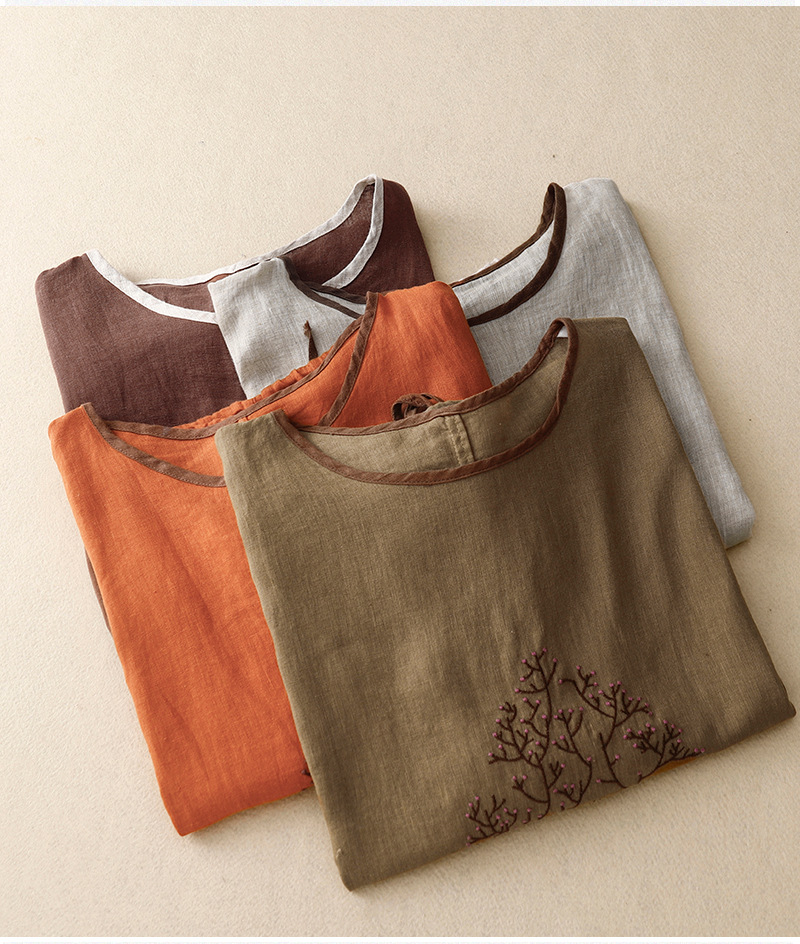 Real Shot 2025 새로운 여름 스타일 문학 느슨한 수 놓은 꽃 면화와 린넨 라운드 넥 반팔 티셔츠 여성 Drawstring 탑 # 9380스토어 가기