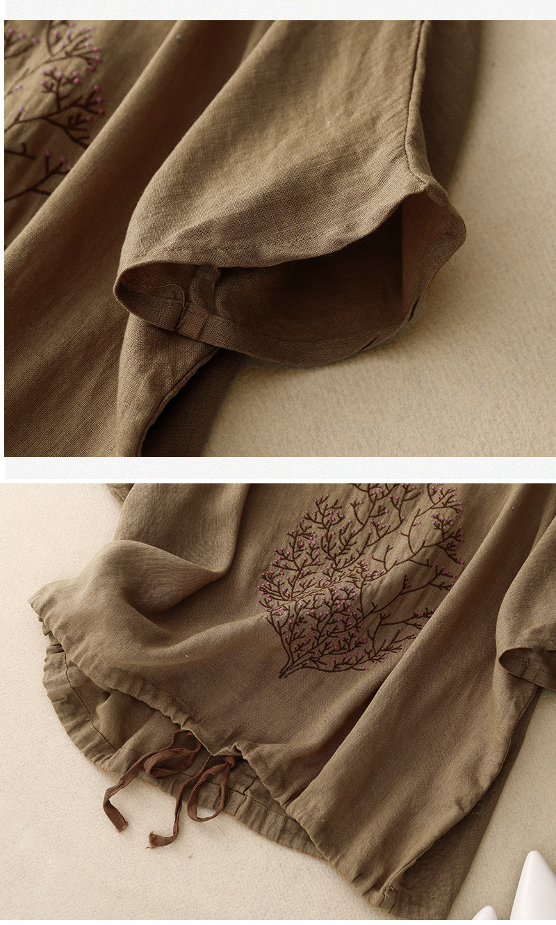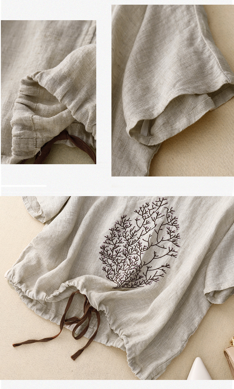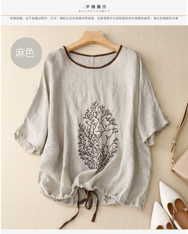 Real Shot 2025 새로운 여름 스타일 문학 느슨한 수 놓은 꽃 면화와 린넨 라운드 넥 반팔 티셔츠 여성 Drawstring 탑 # 9380
