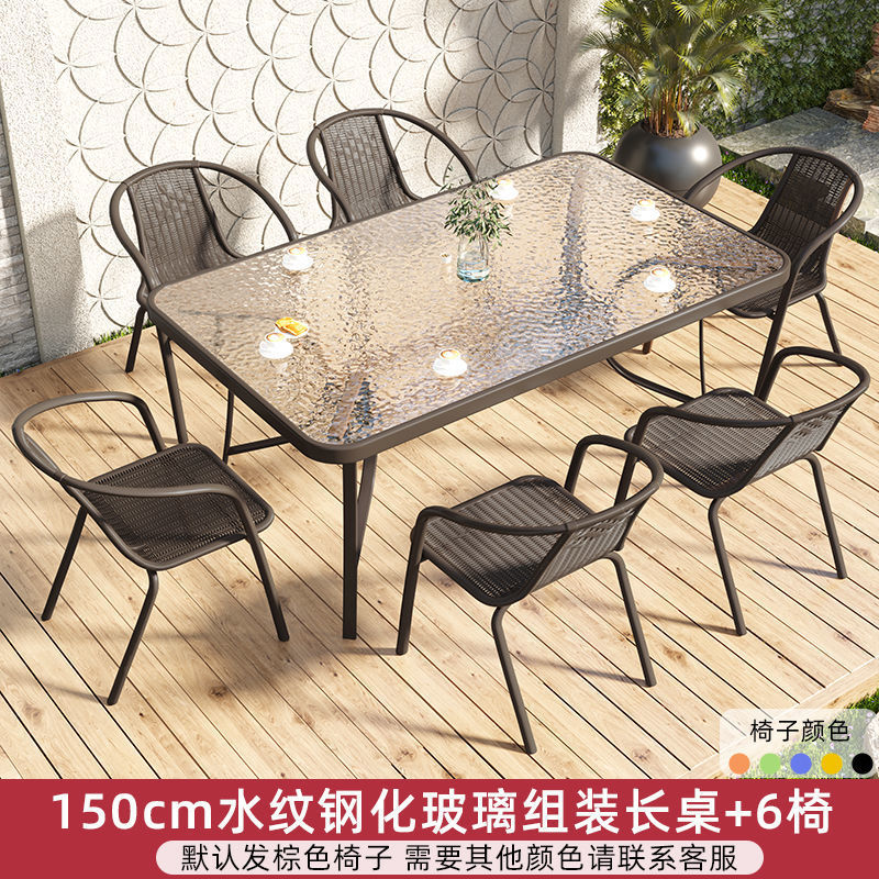 • 150cm 물 패턴 강화 유리 조립 긴 테이블 + 의자 6 개