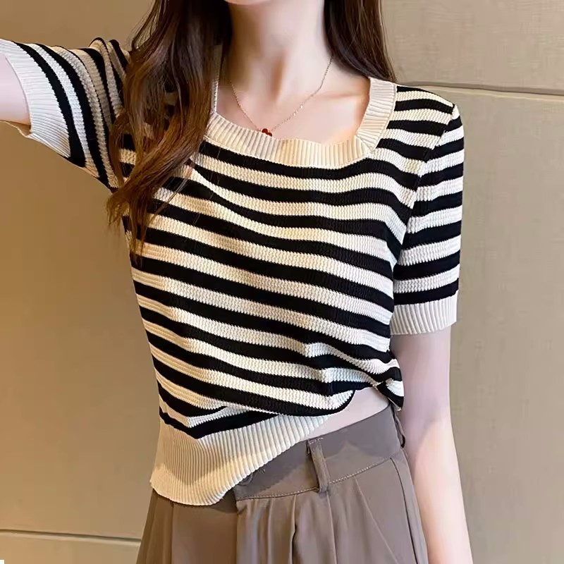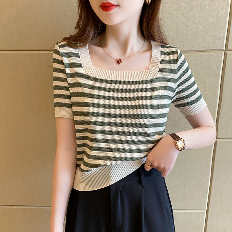 아이스 실크 스트라이프 스웨터 여름 새로운 얇은 스퀘어 넥 짧은 반팔 티셔츠 탑 여성용
