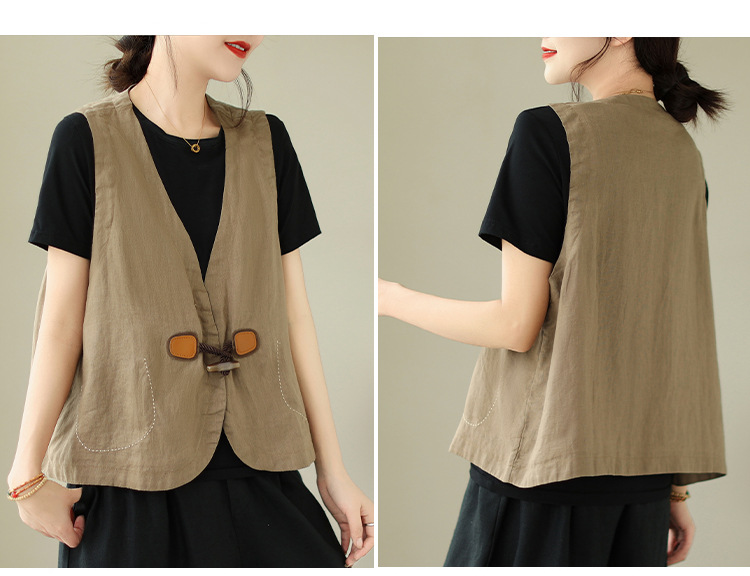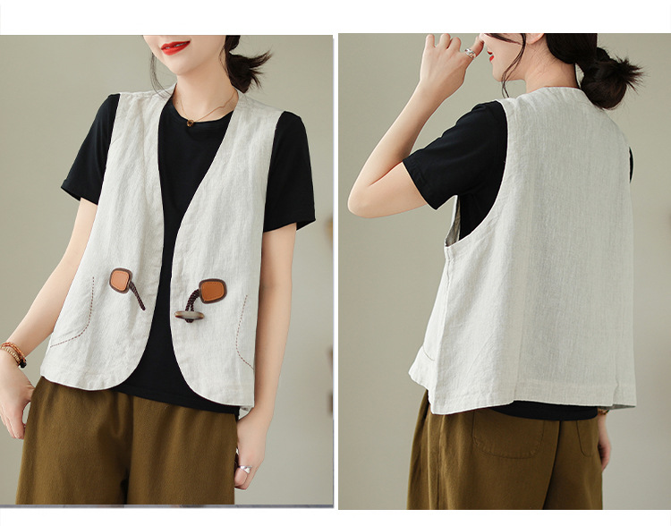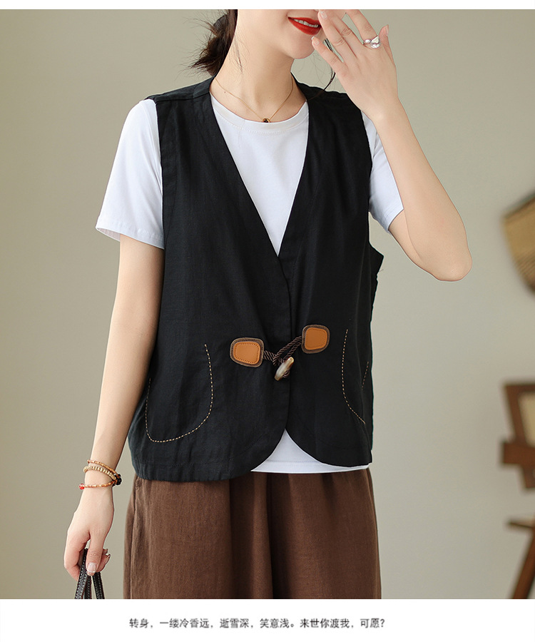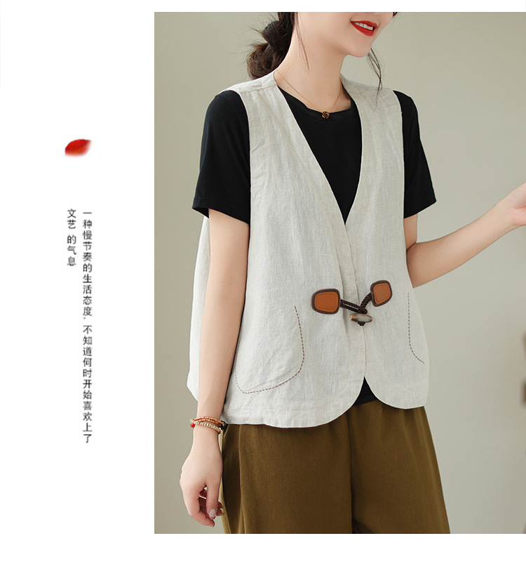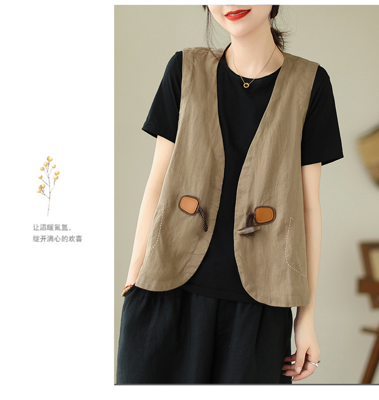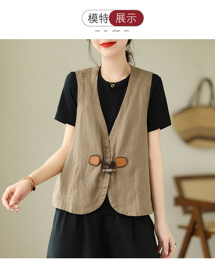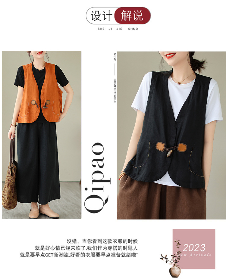 리얼 샷 오리지널 2023 여름 새로운 순수 컬러면 및 린넨 조끼 여성의 느슨한 슬리밍 혼 버클 조끼 바깥 쪽 상단