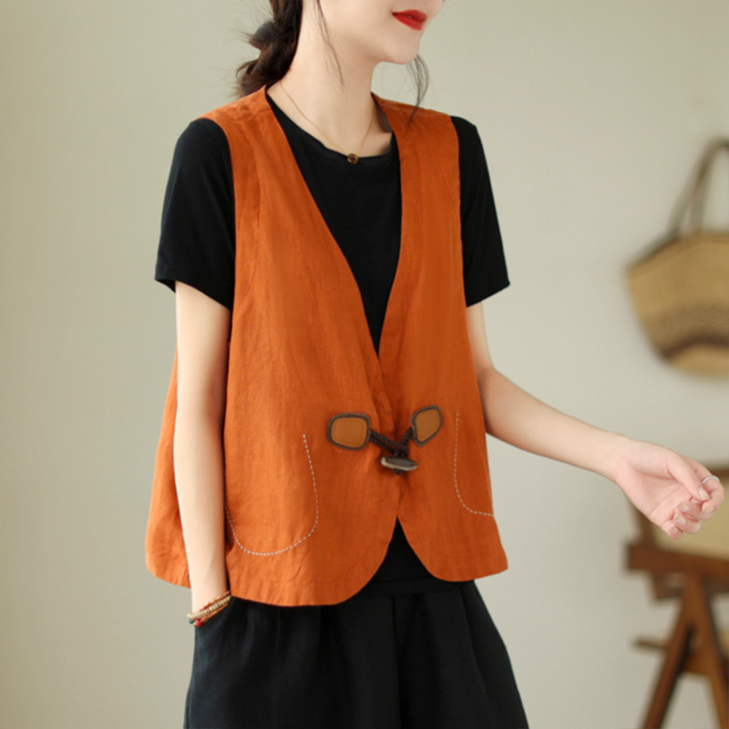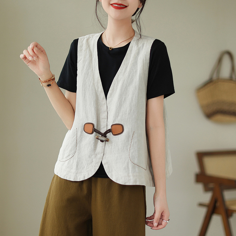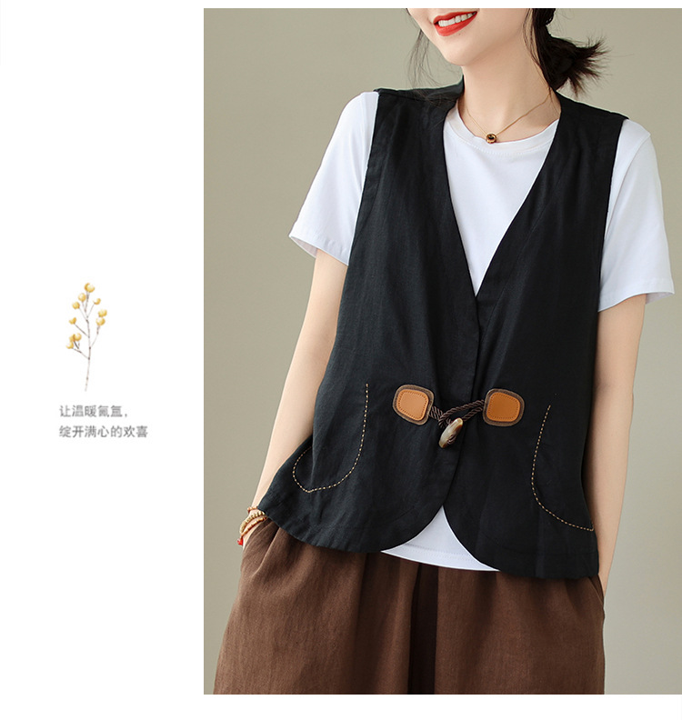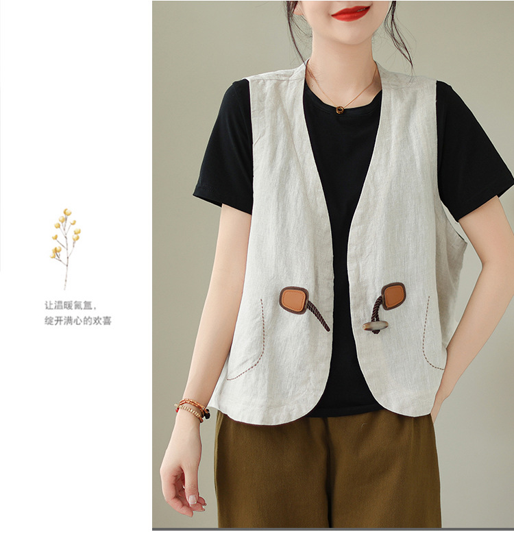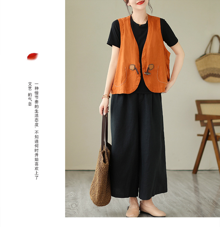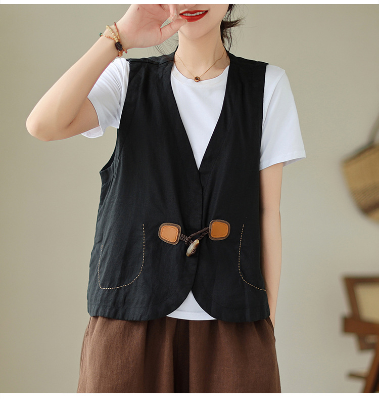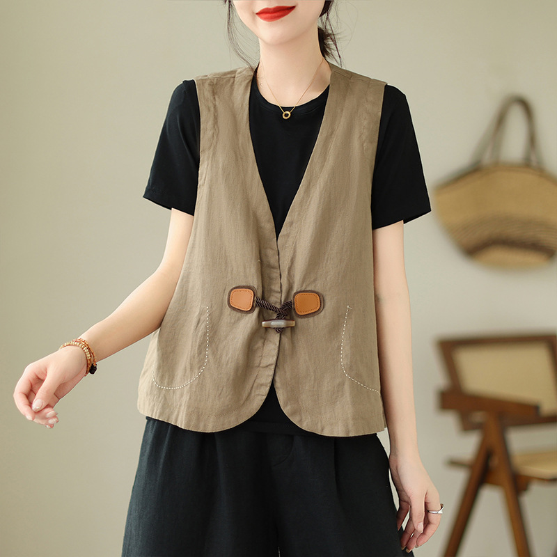 리얼 샷 오리지널 2023 여름 새로운 순수 컬러면 및 린넨 조끼 여성의 느슨한 슬리밍 혼 버클 조끼 바깥 쪽 상단