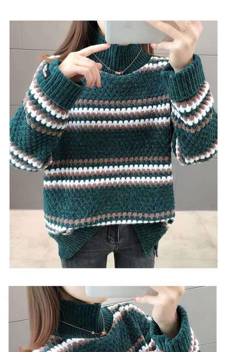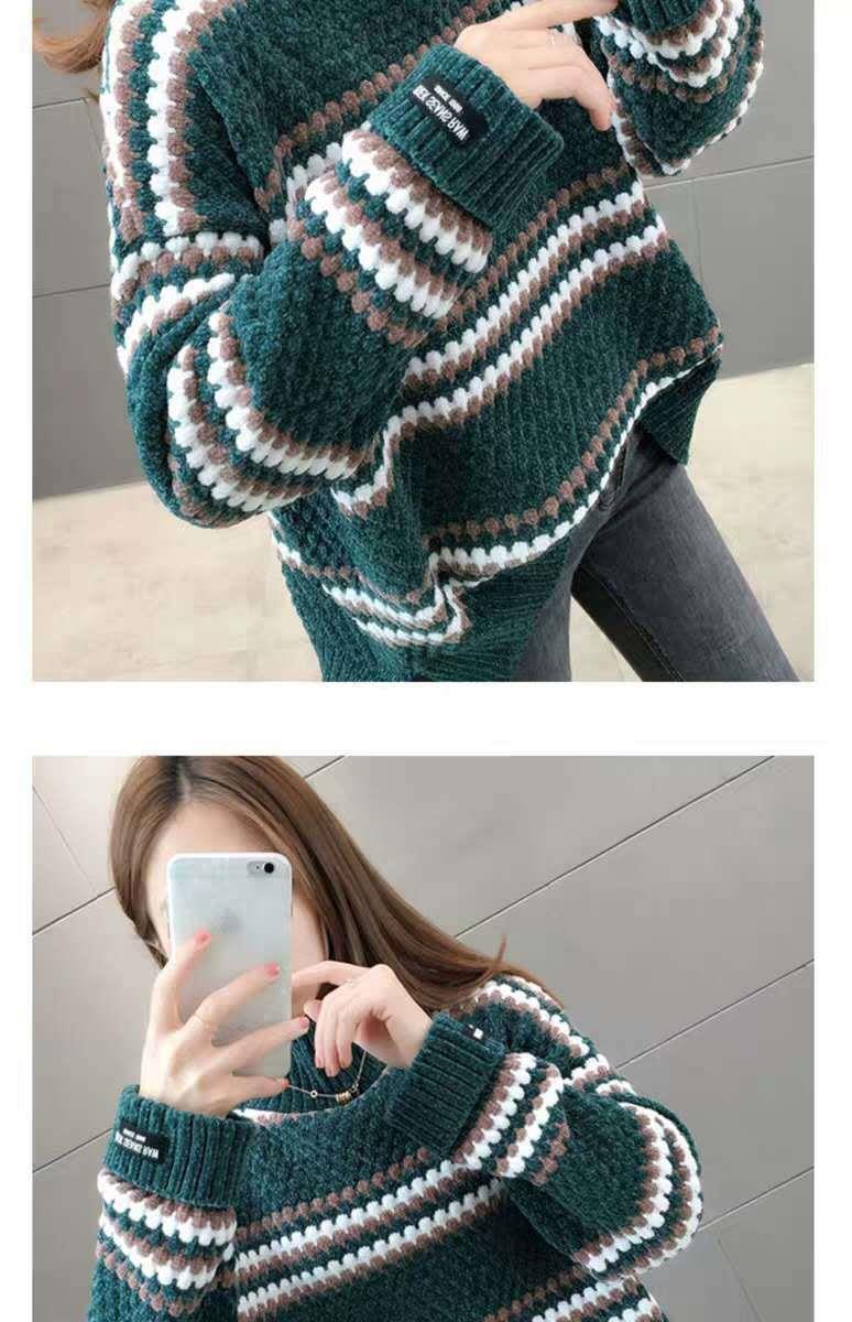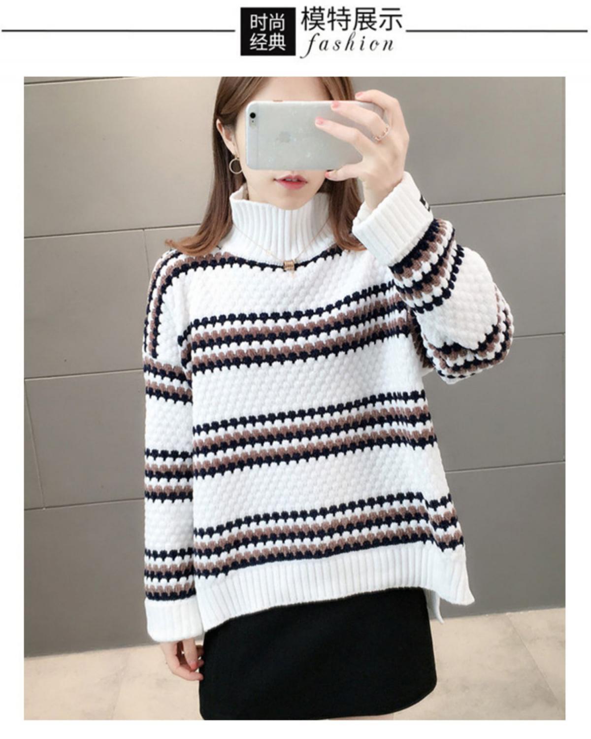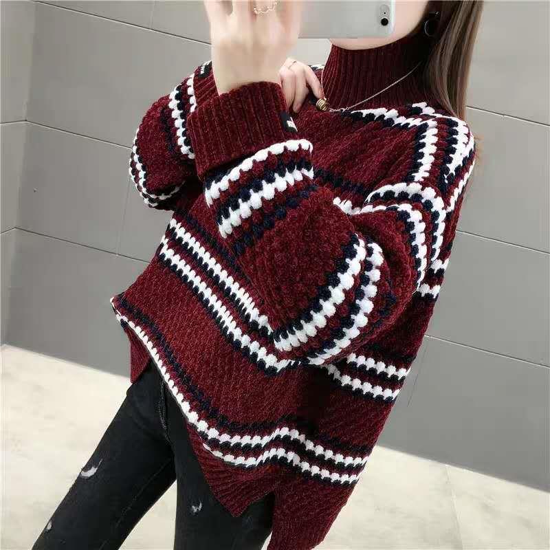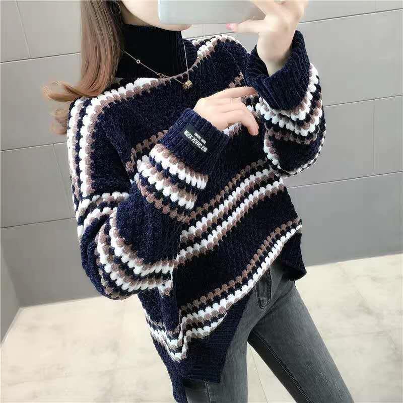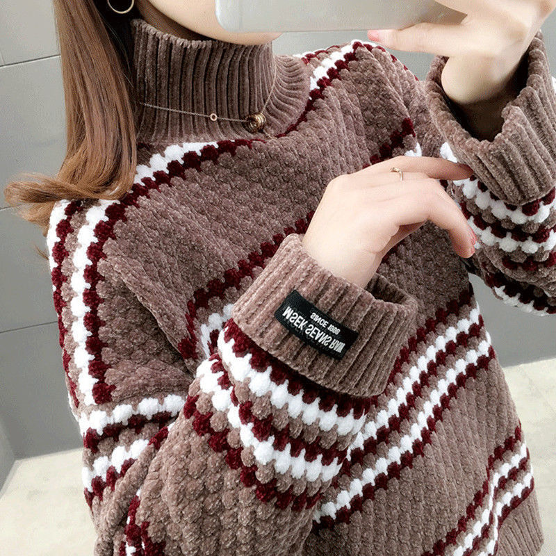 여성용 하이넥 스웨터 가을 겨울 신상 스트라이프 루즈핏 아우터 셔닐 다용도 레이지 스타일 니트 상의스토어 가기