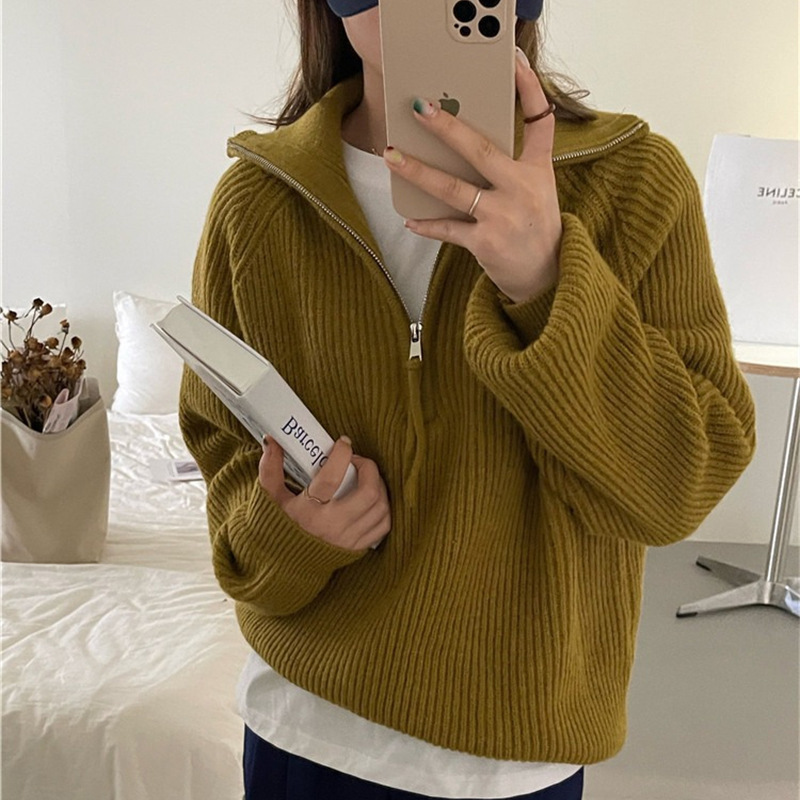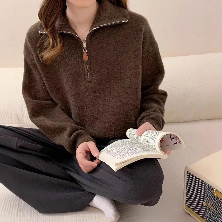 韩国chic秋冬软糯针织上衣女复古麻花半拉链慵懒百搭短款毛衣外套