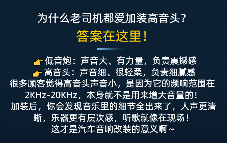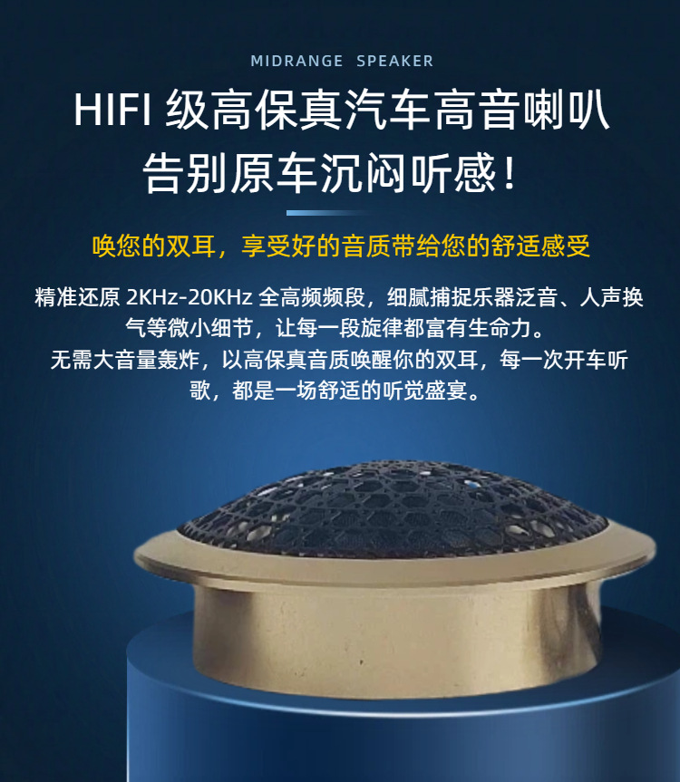 高音单元不是汽车音响的 “可选配件”,而是还原完整音乐的必需品。它不负责 “大声”,只负责 “好听”—— 让音乐从 “能听” 升级到 “耐听、想听”,这就是加高音的核心意义。
