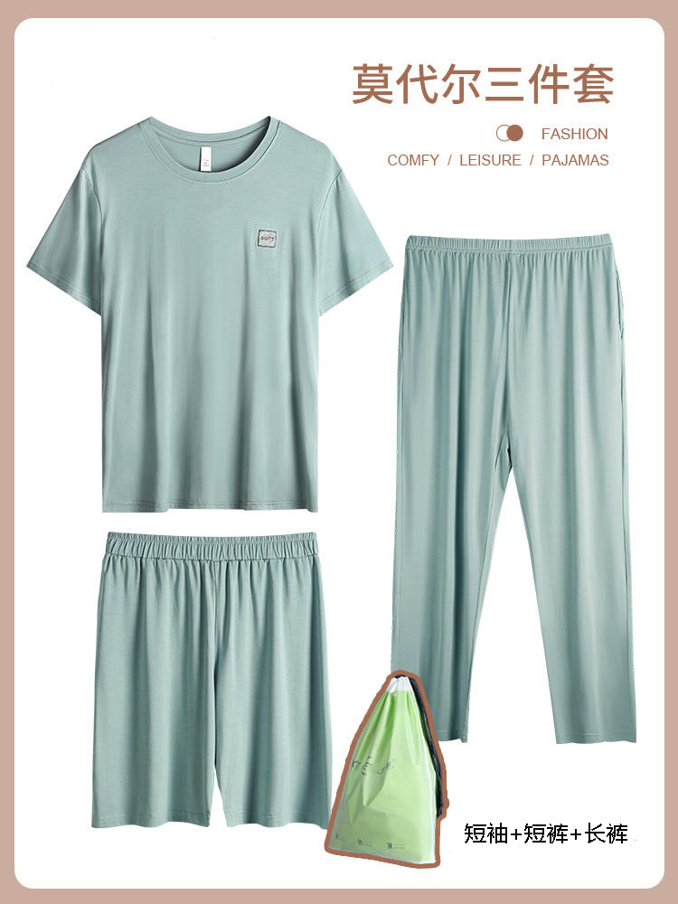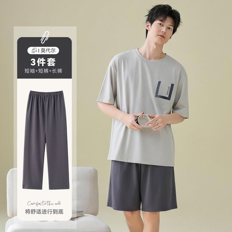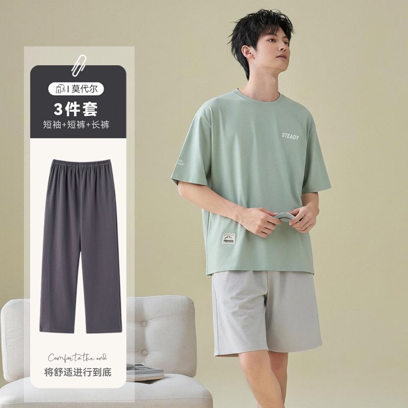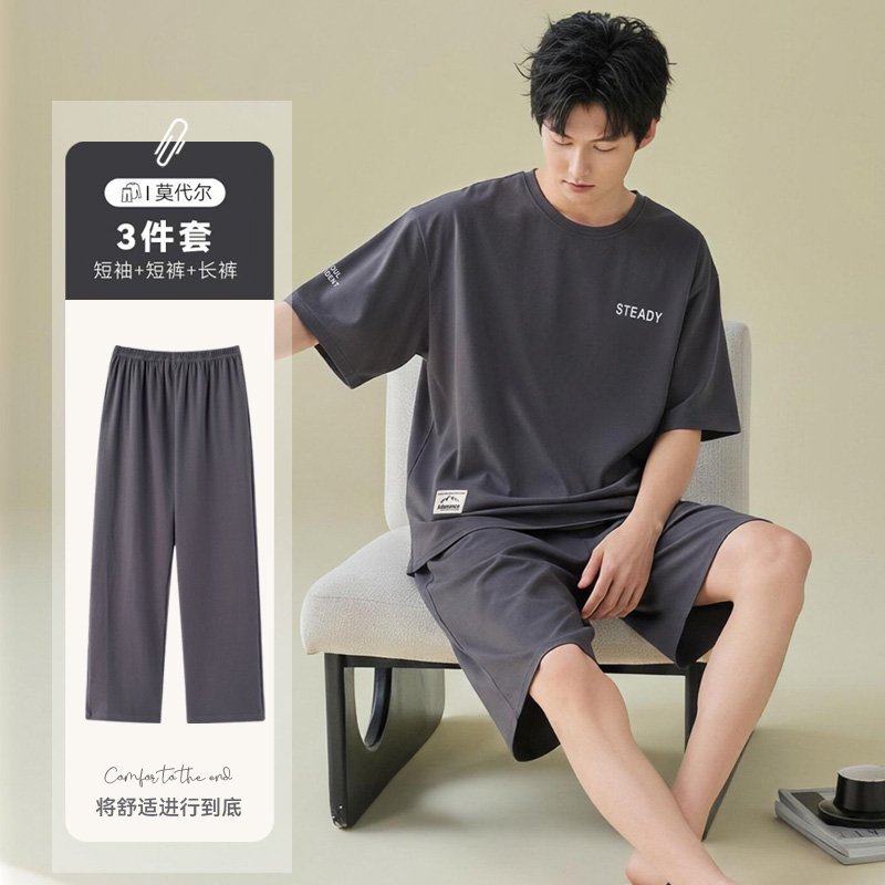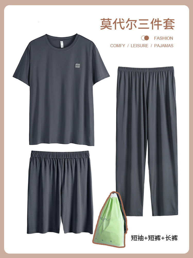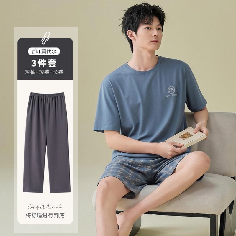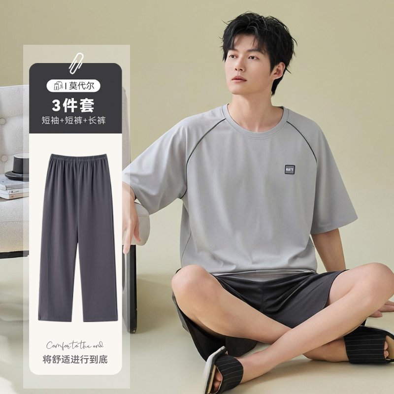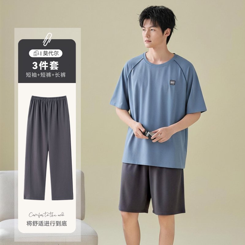 남성용 잠옷 여름용 얇은 아이스 실크 면 반팔 반바지 긴바지 3종 세트 여름용 아이스 실크 시원한 느낌의 홈웨어 남성용