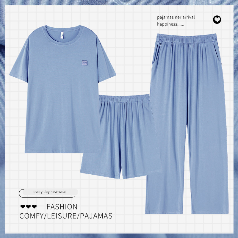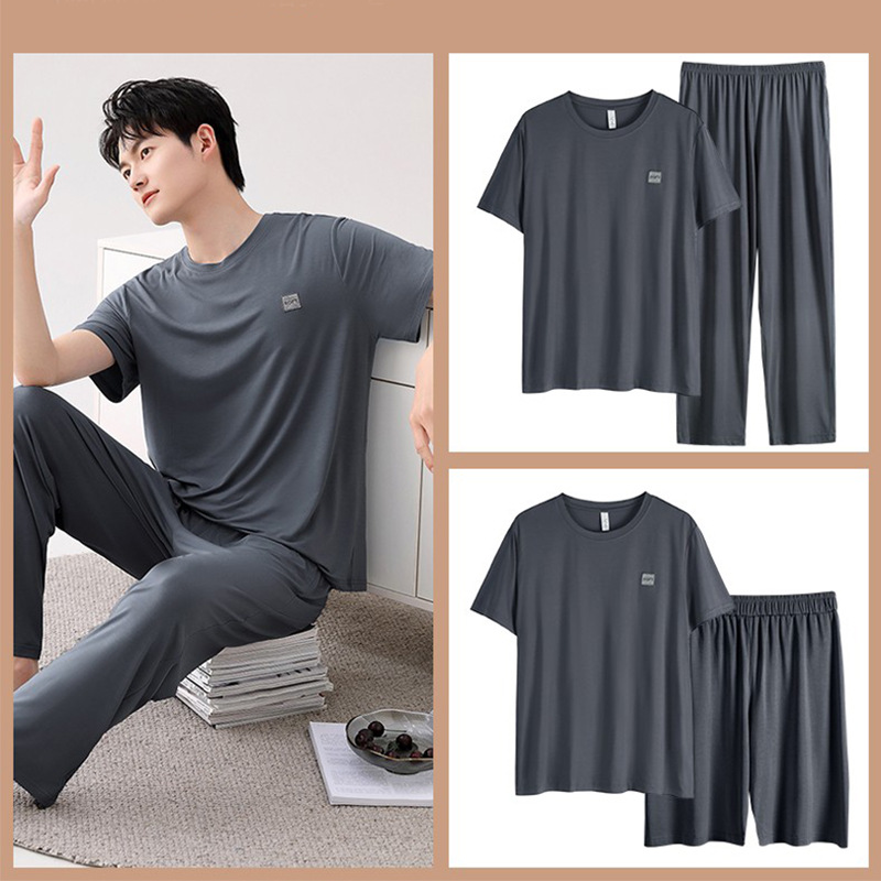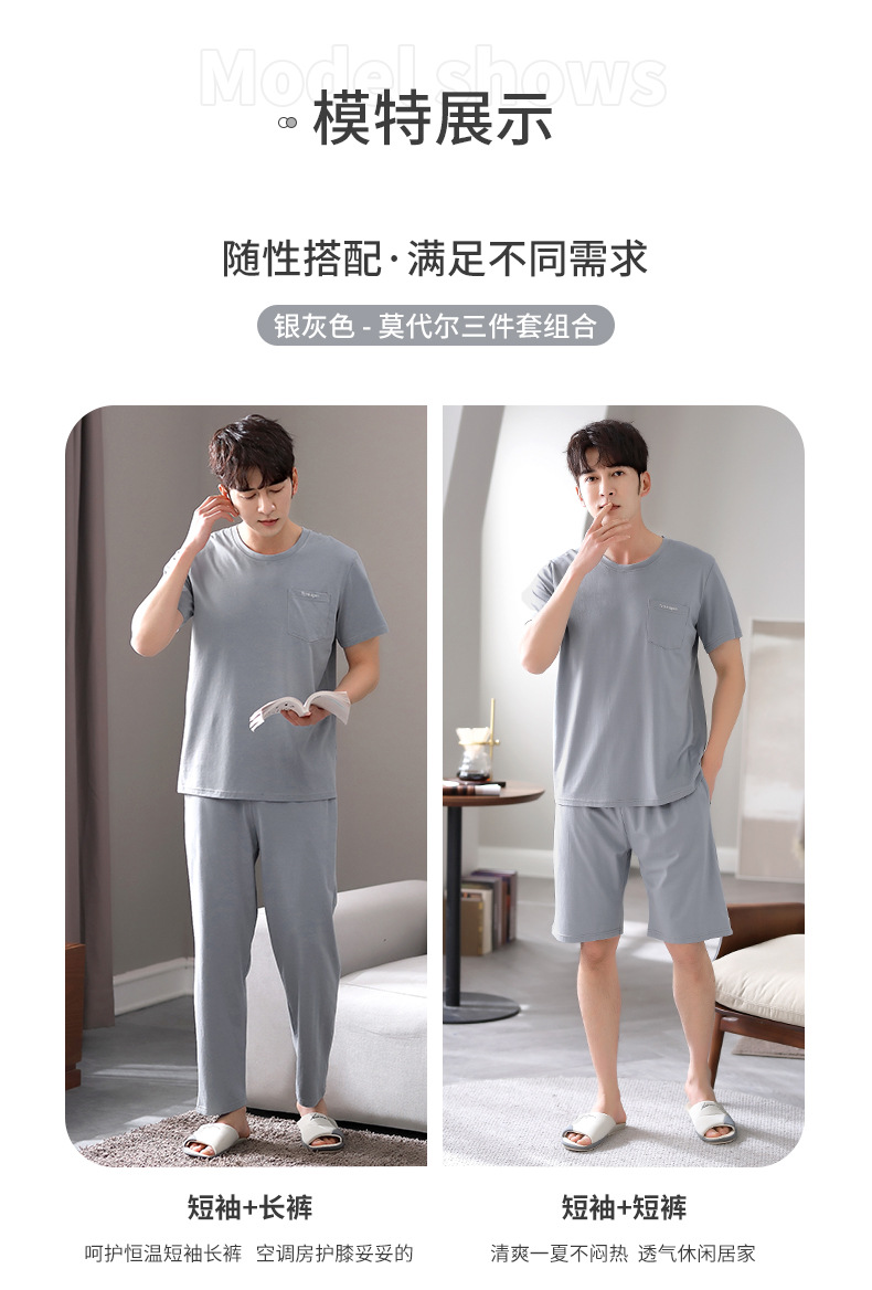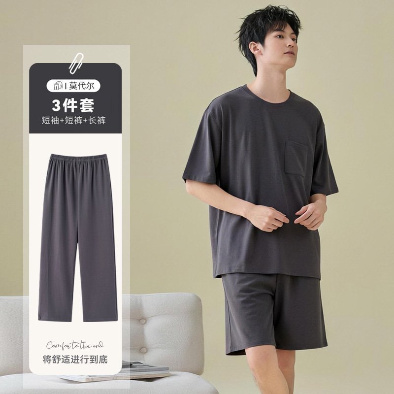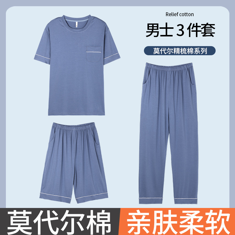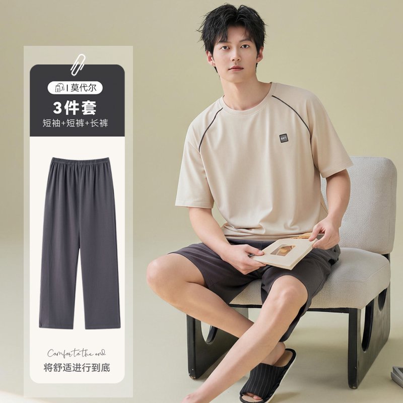 남성용 잠옷 여름용 얇은 아이스 실크 면 반팔 반바지 긴바지 3종 세트 여름용 아이스 실크 시원한 느낌의 홈웨어 남성용