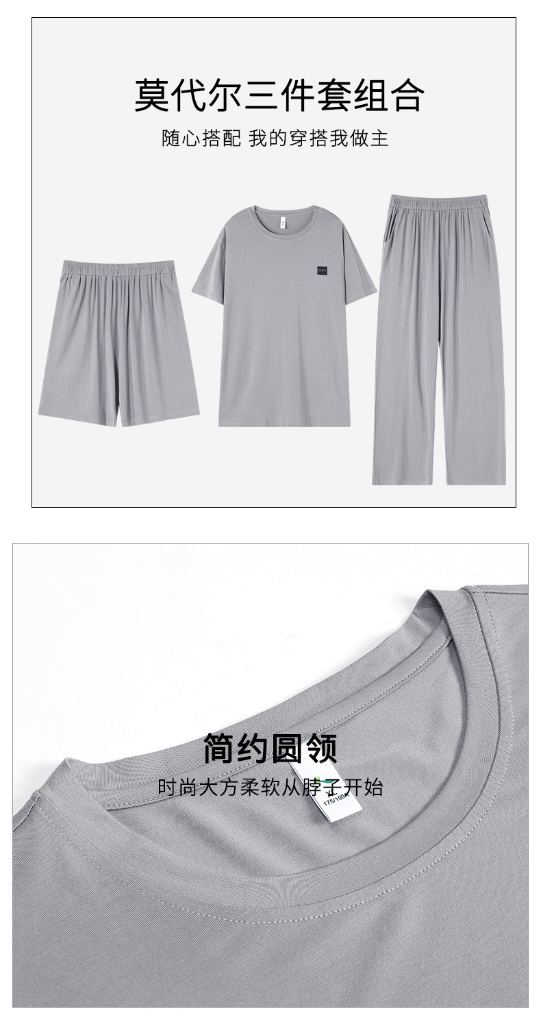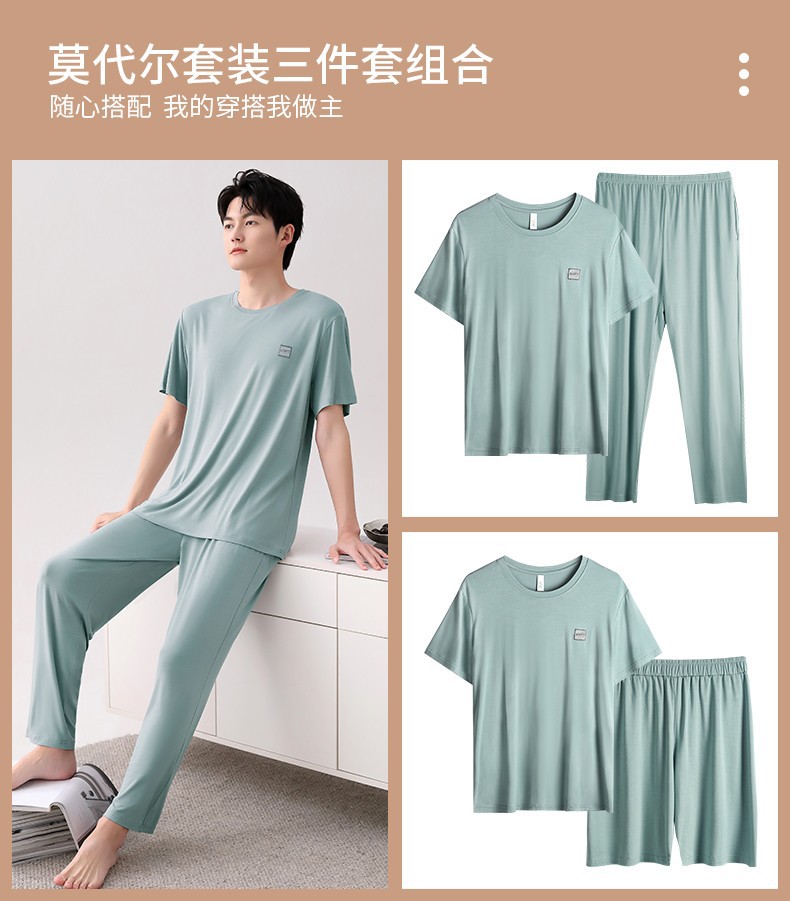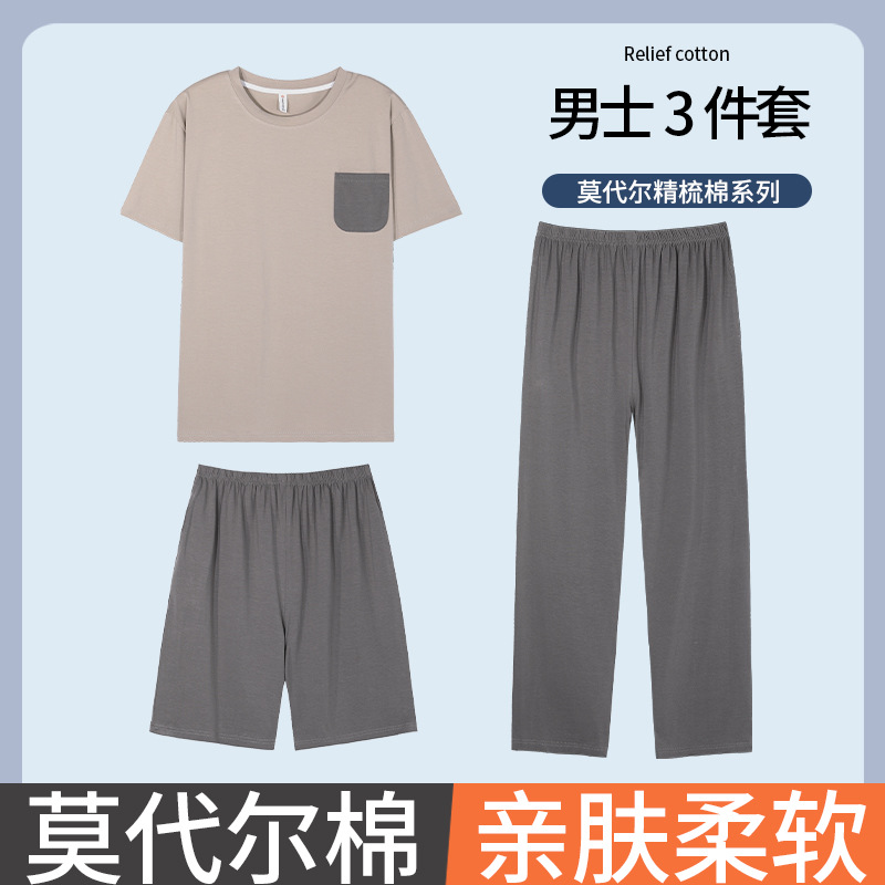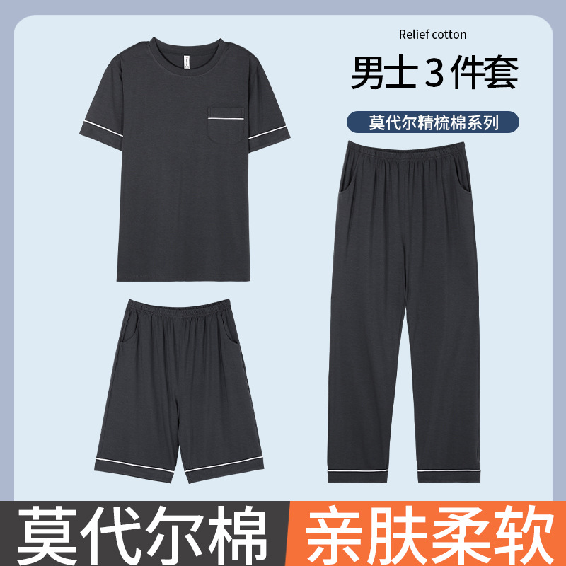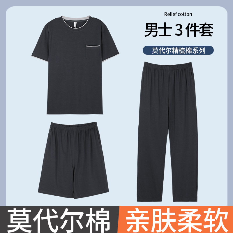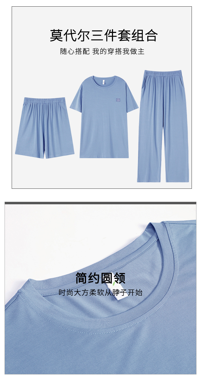 남성용 잠옷 여름용 얇은 아이스 실크 면 반팔 반바지 긴바지 3종 세트 여름용 아이스 실크 시원한 느낌의 홈웨어 남성용