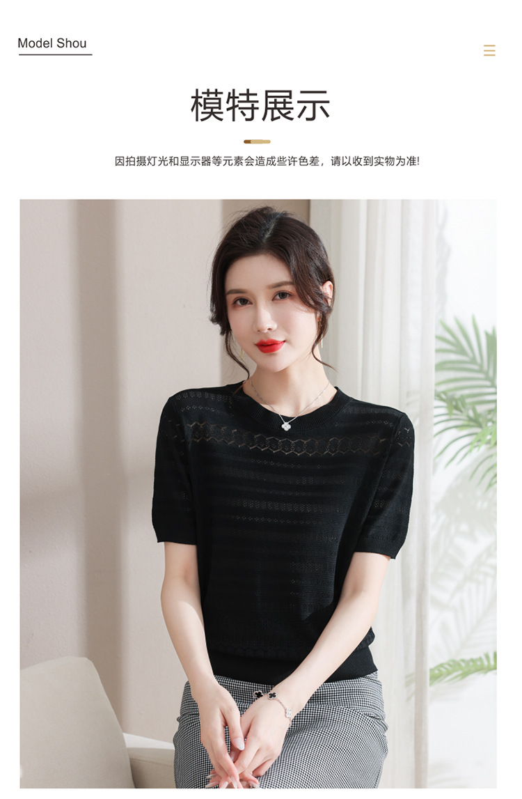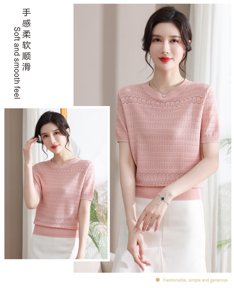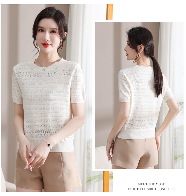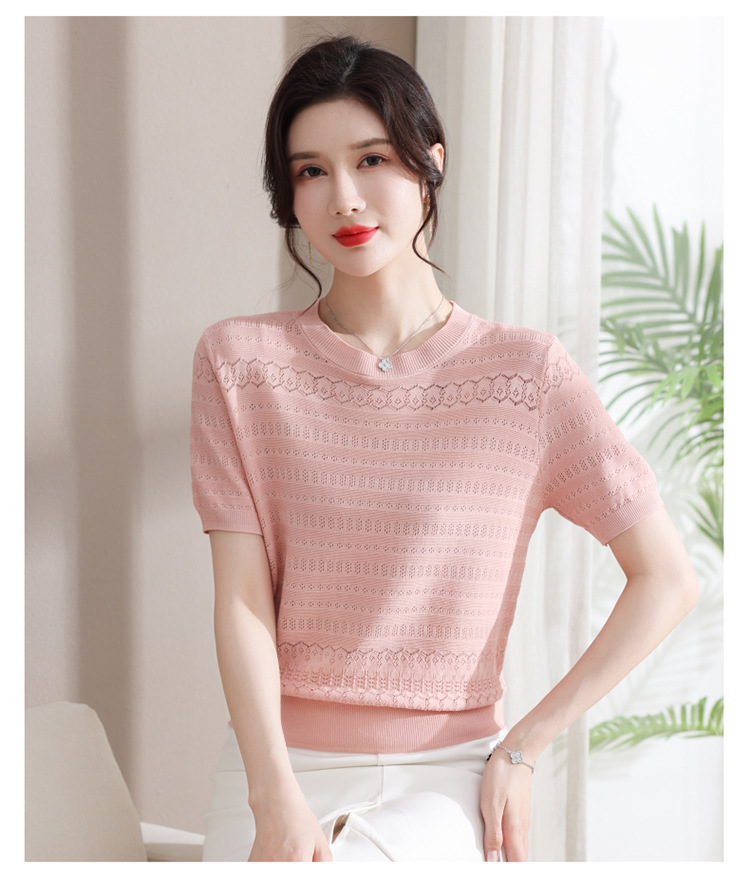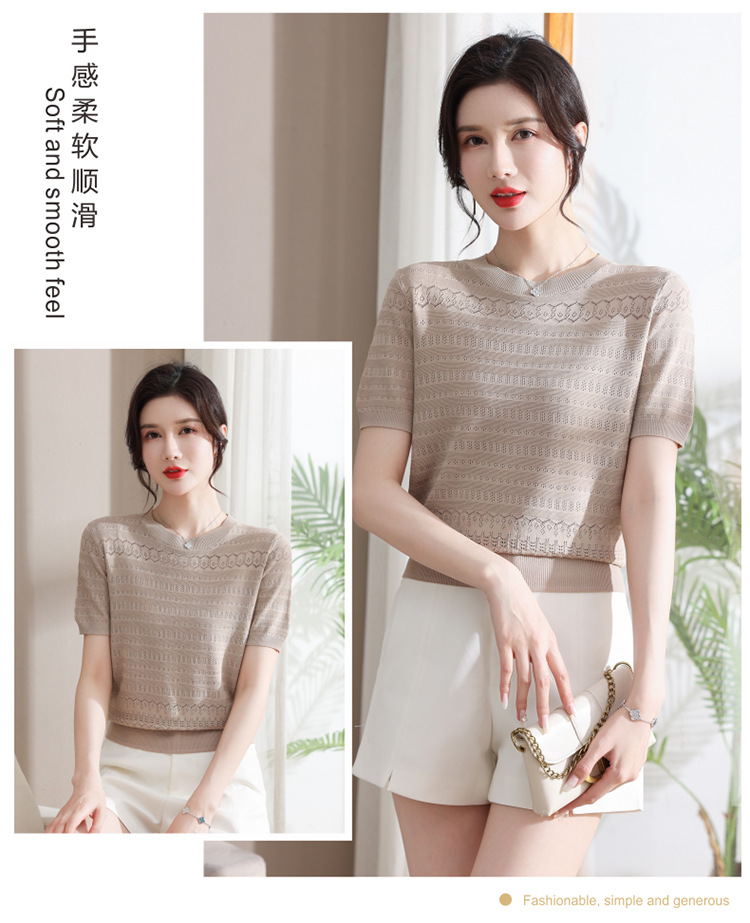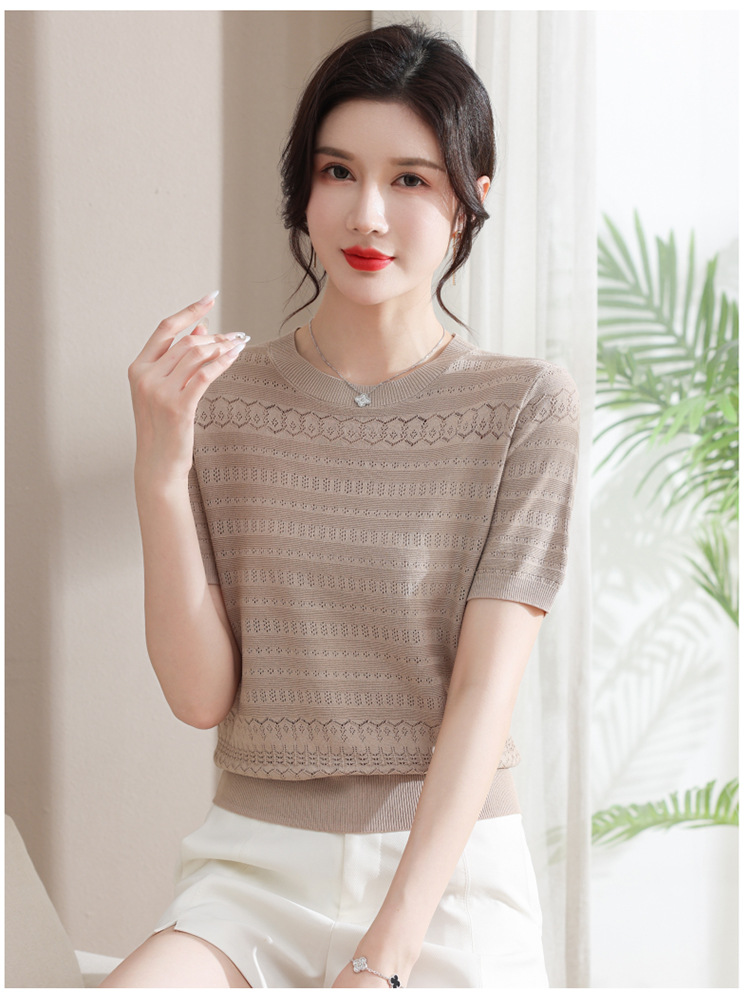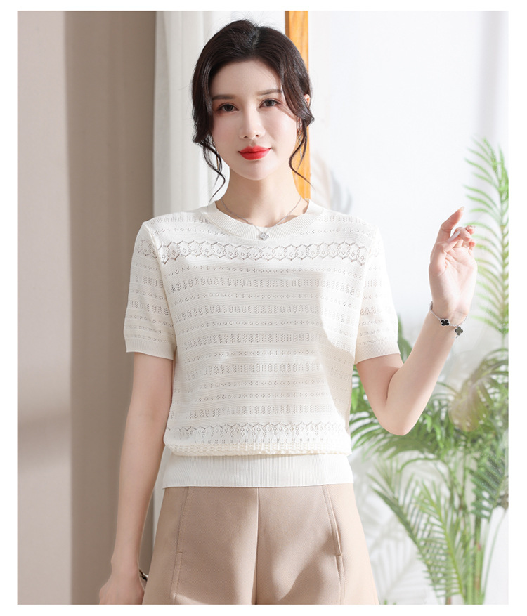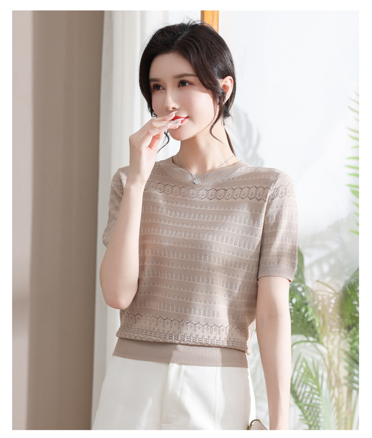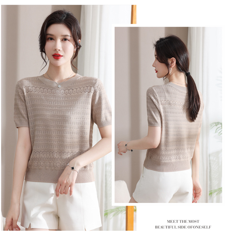 아이스 실크 반팔 니트 셔츠 여성용 여름 2024 새로운 라운드 넥 얇은 디자인 센스 짧은 자카드 탑 티셔츠스토어 가기