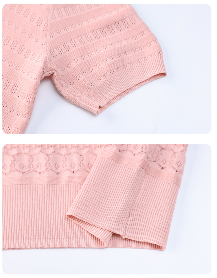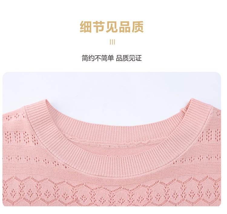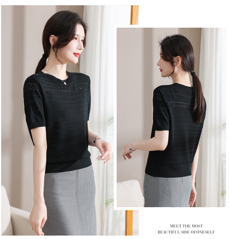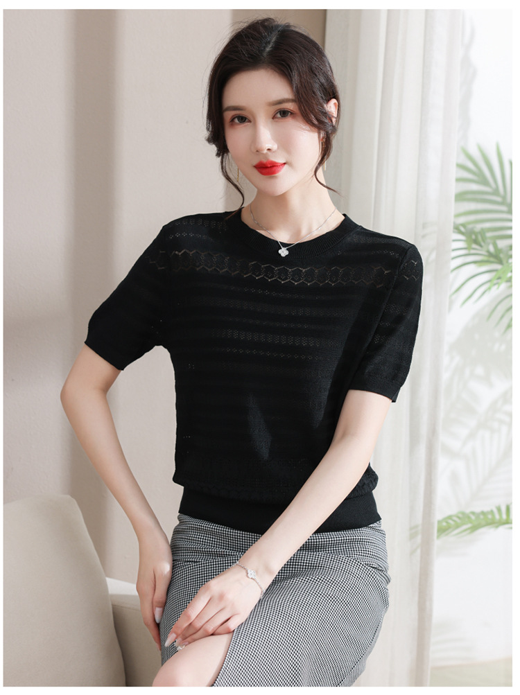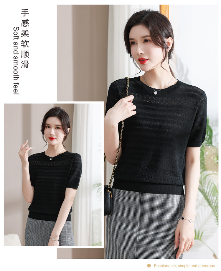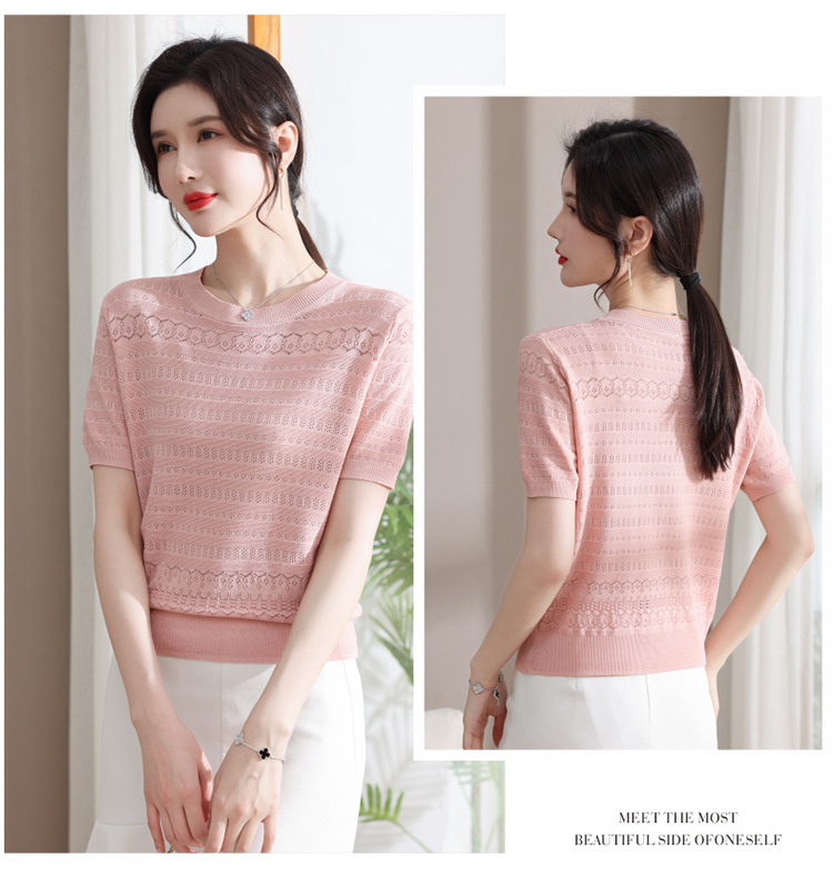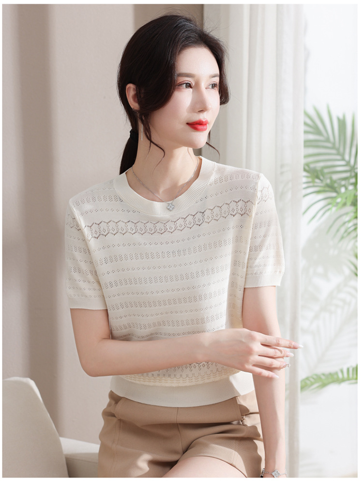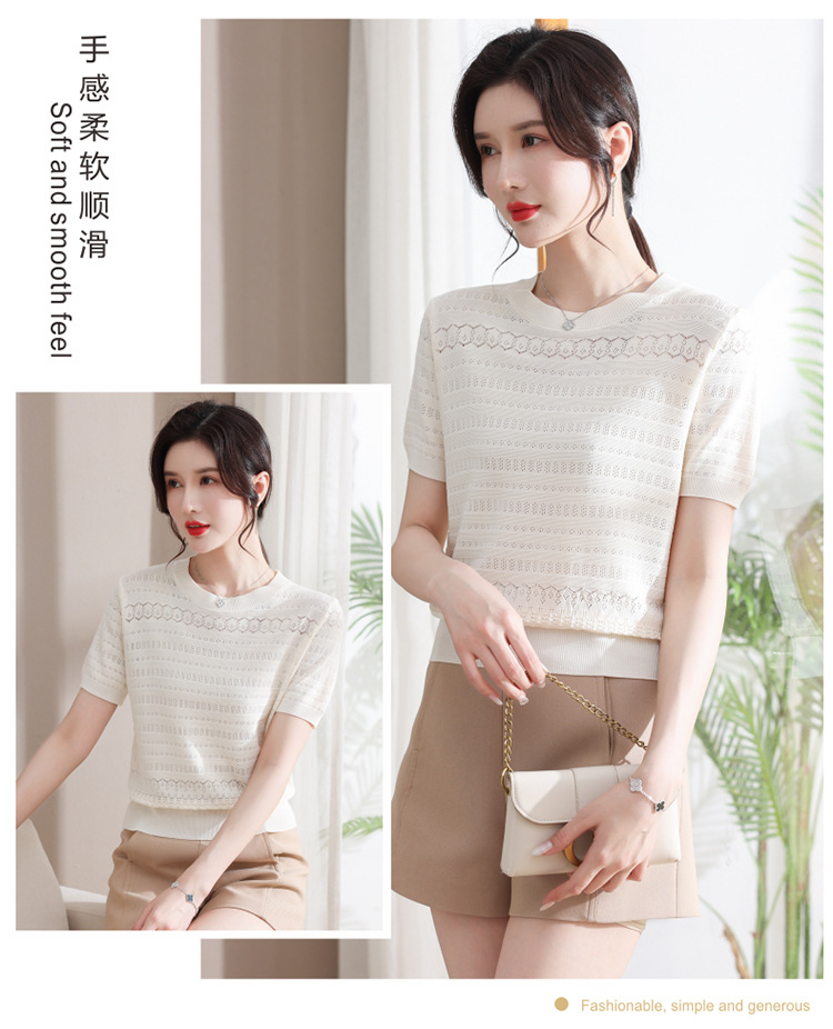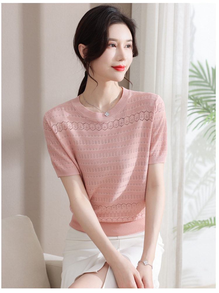 아이스 실크 반팔 니트 셔츠 여성용 여름 2024 새로운 라운드 넥 얇은 디자인 센스 짧은 자카드 탑 티셔츠