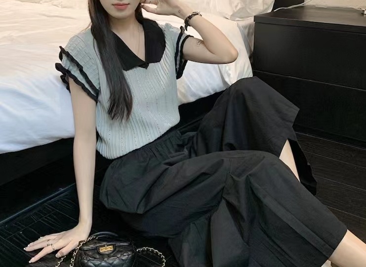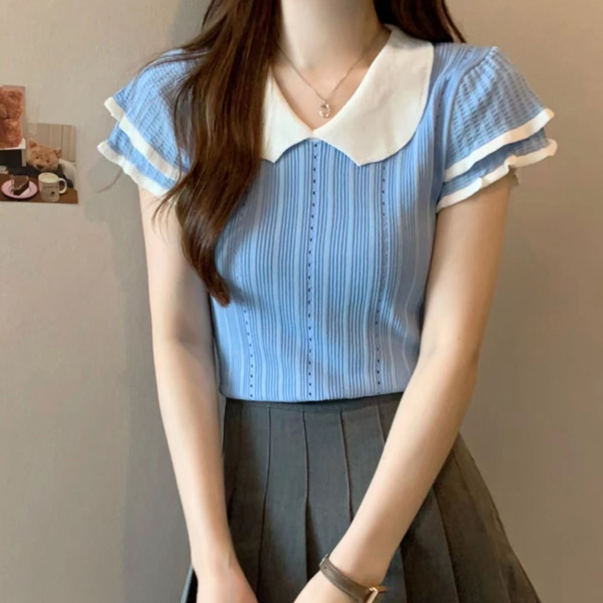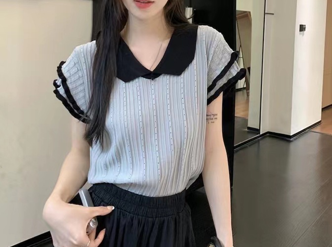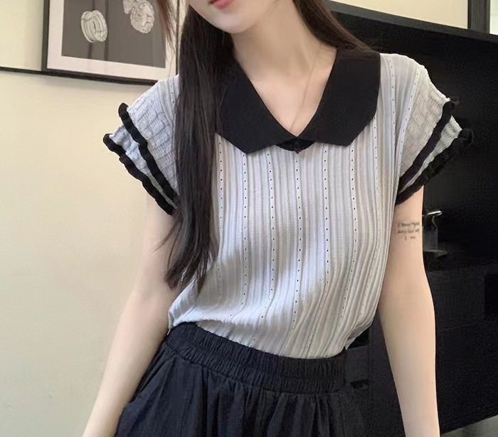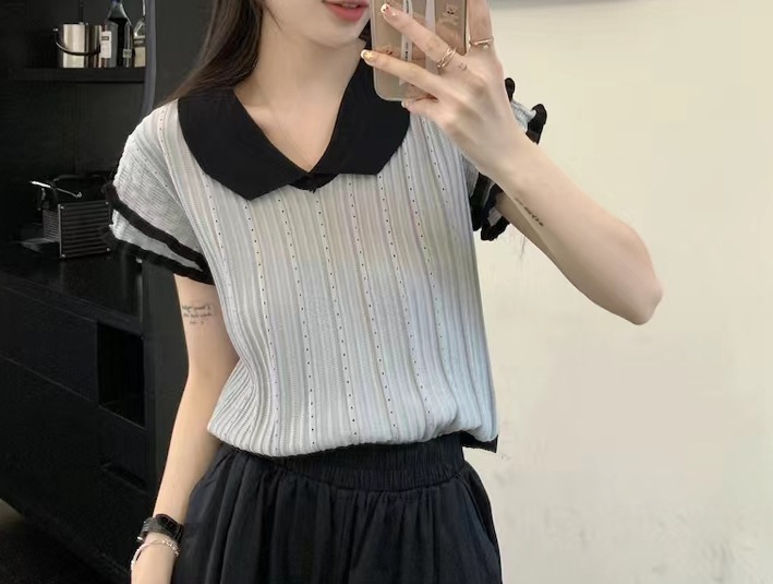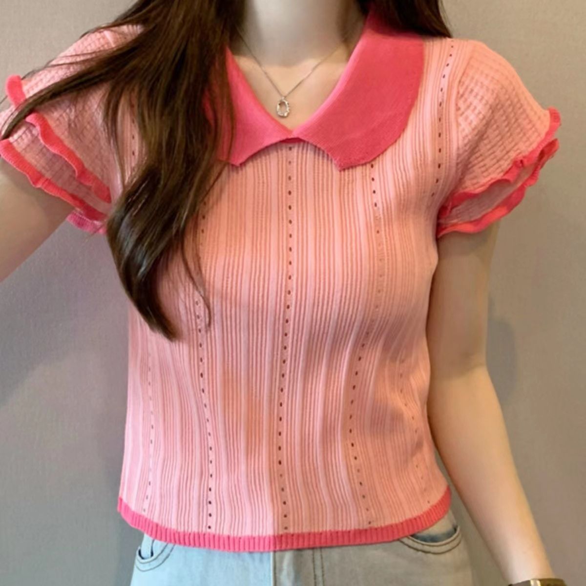 디자인 센스 틈새 POLO 칼라 대비 반팔 스웨터 여성용 여름 새로운 유니크 시크 캐주얼 올매치 탑