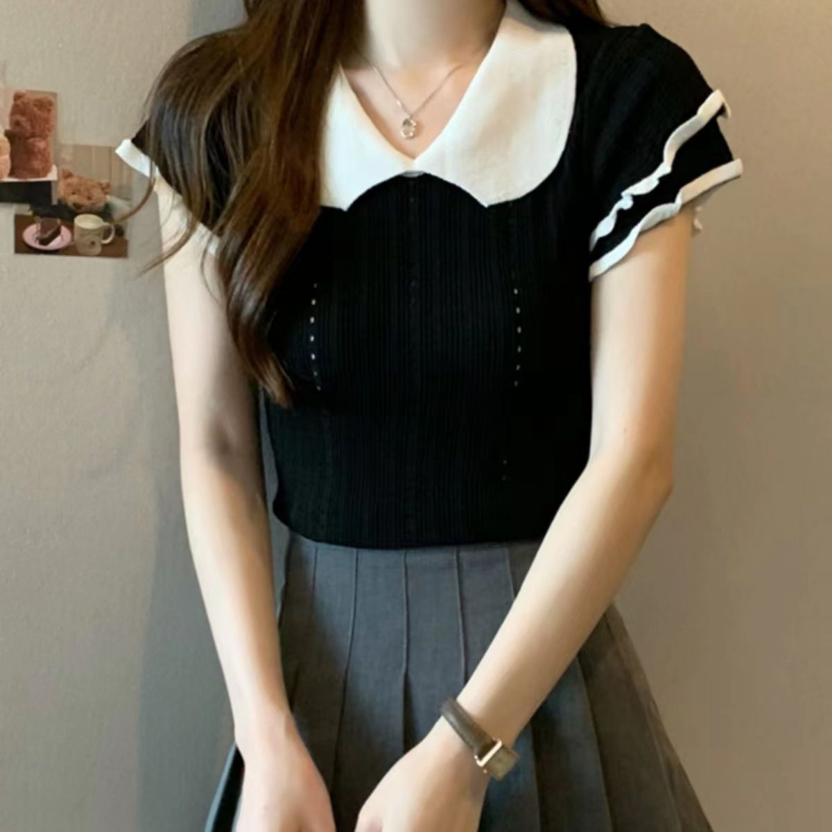 디자인 센스 틈새 POLO 칼라 대비 반팔 스웨터 여성용 여름 새로운 유니크 시크 캐주얼 올매치 탑스토어 가기