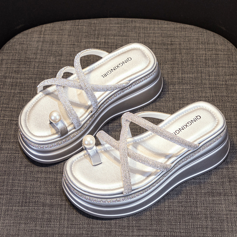 슬리퍼 아우터 2023 새로운 여름 두꺼운 단독 샌들 여성용 라인 석 크로스 스트랩 머핀 여름 요정 바람 해변