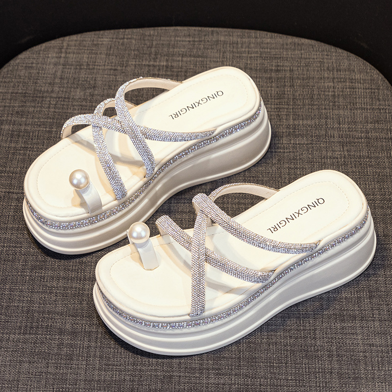 슬리퍼 아우터 2023 새로운 여름 두꺼운 단독 샌들 여성용 라인 석 크로스 스트랩 머핀 여름 요정 바람 해변스토어 가기