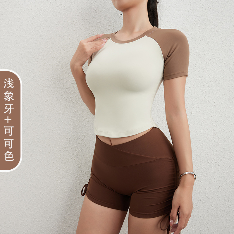 요가 의류 반팔 여성용 타이트 컬러 매칭 스포츠 탑 반팔 러닝 슬리밍 단색 조끼 새로운 피트니스 의류스토어 가기