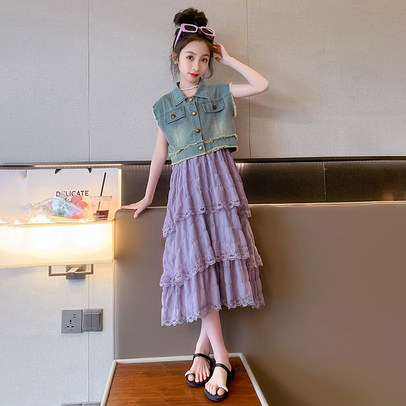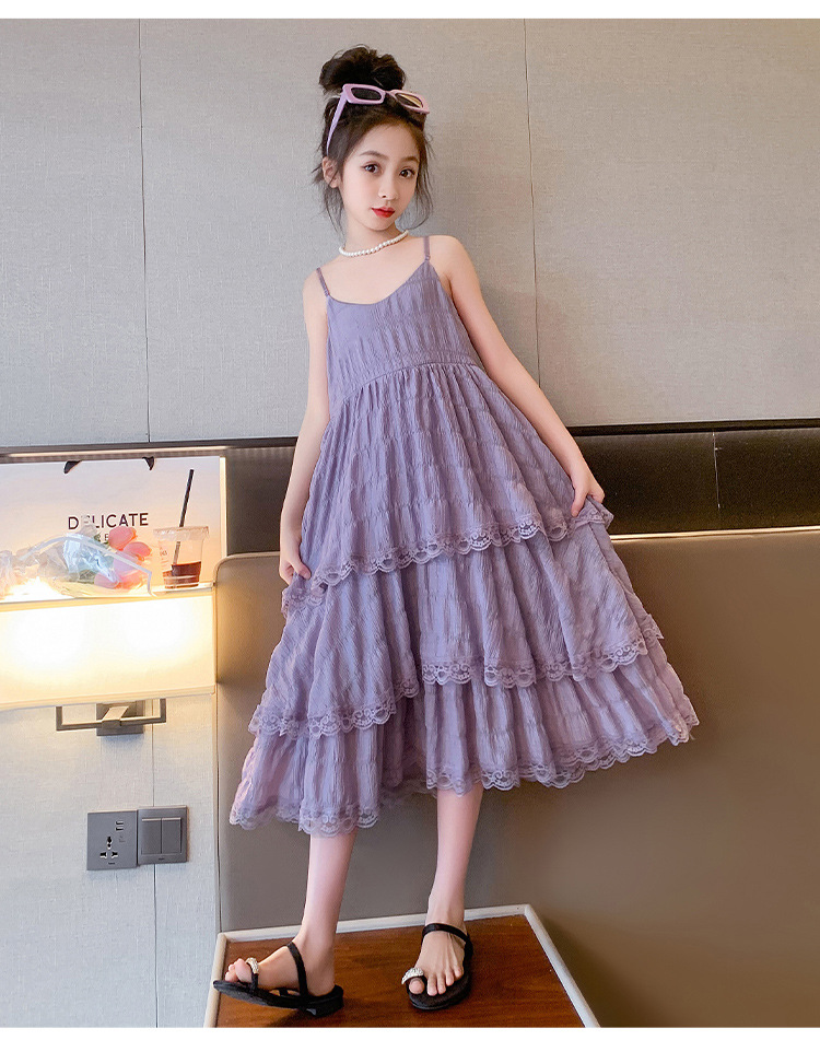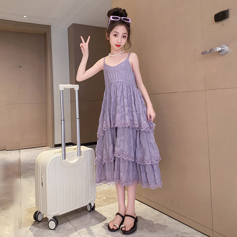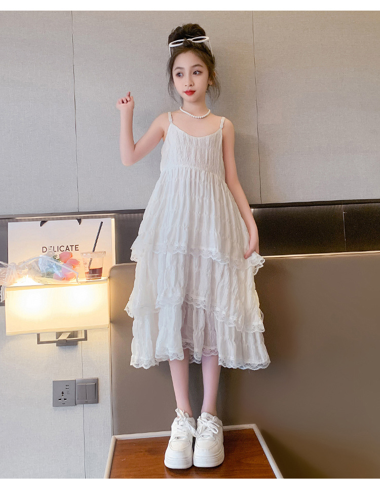 여아용 멜빵 원피스 여름 신상 어린이용 세련된 케이크 롱 드레스 중대형 어린이용 패셔너블한 민소매 원피스