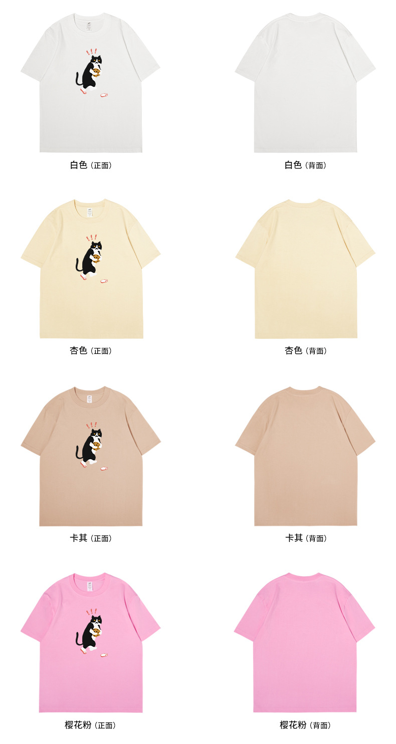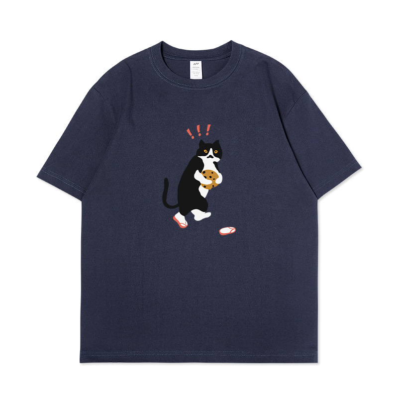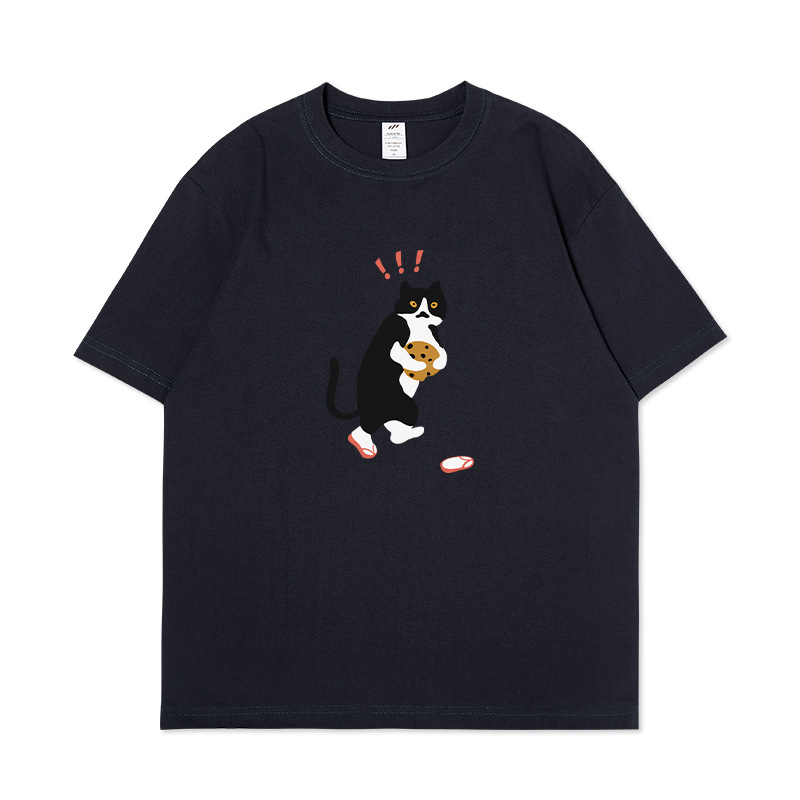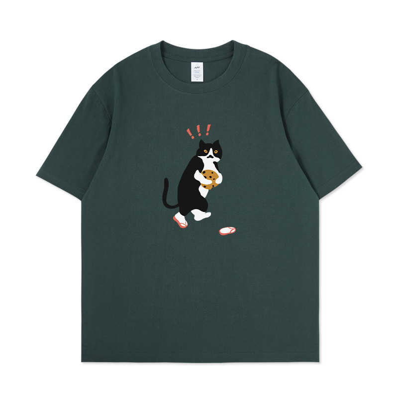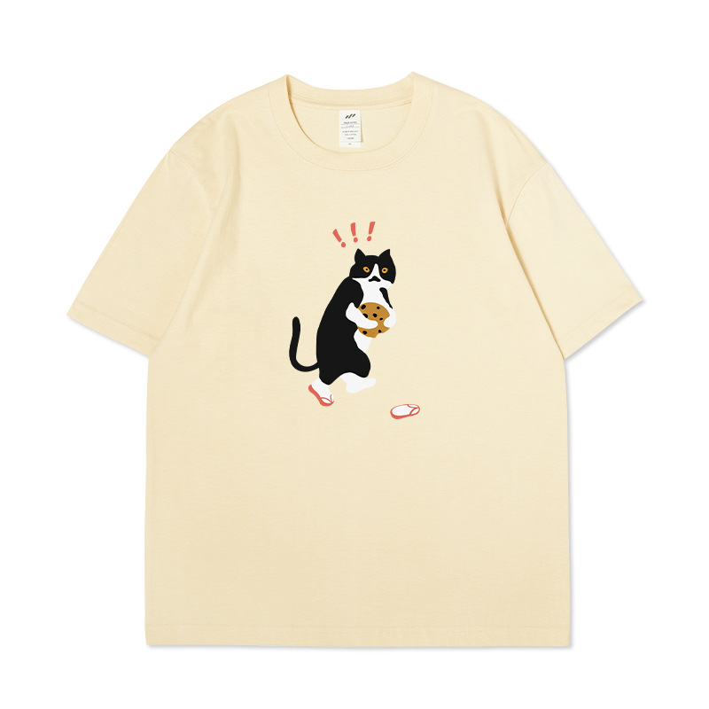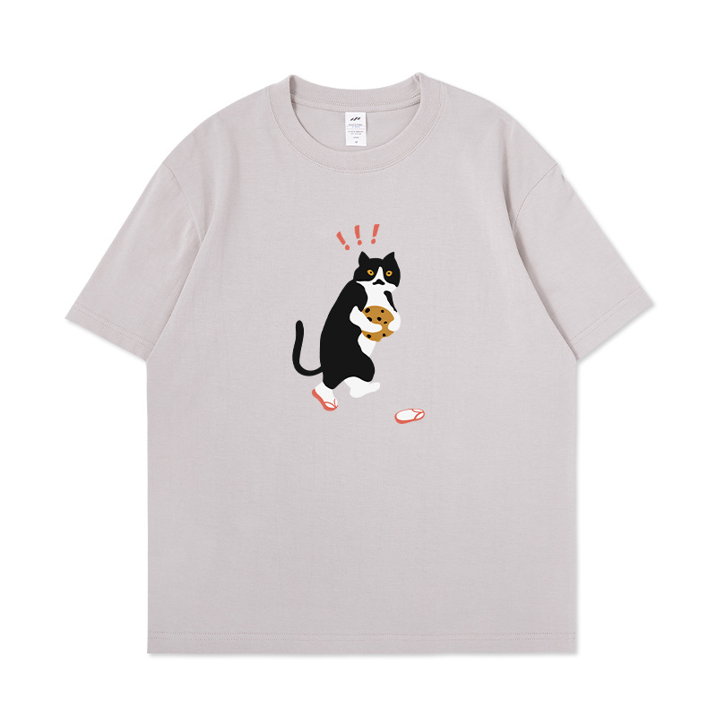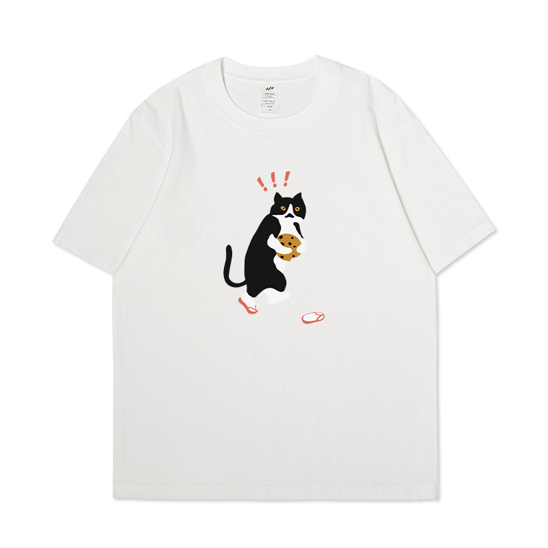 쿠키 고양이 반팔 남성용 헤비 코튼 여름 남성용 올매치 루즈한 화이트 캐주얼 반팔 베이스 셔츠 남성용 티셔츠스토어 가기