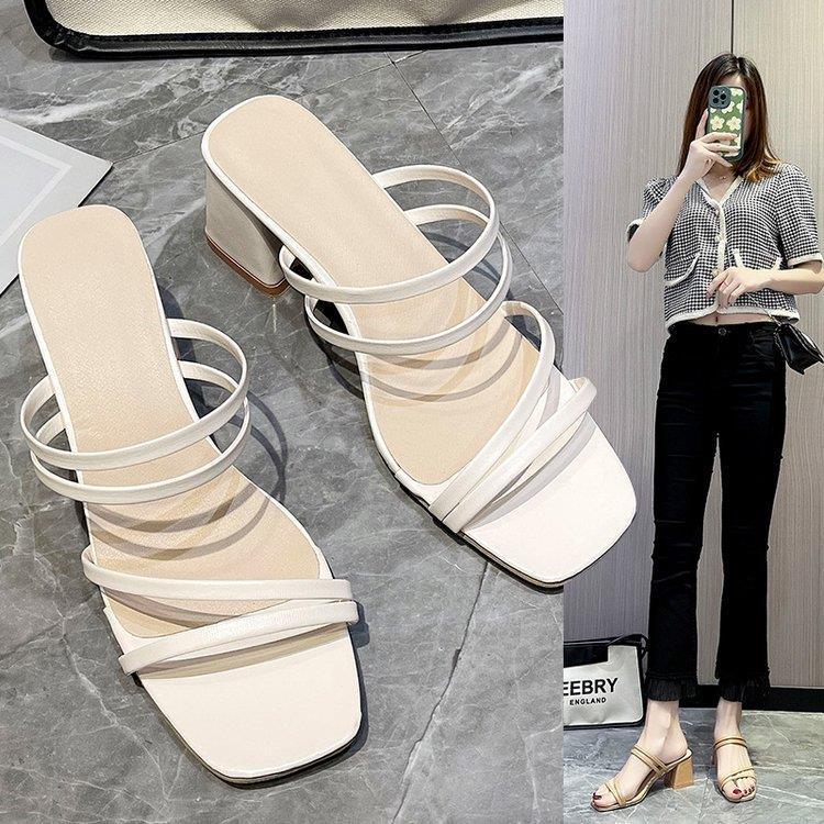 2023 여름 새로운 캐주얼 하이힐 샌들 여성용 스퀘어 토 우아한 청키 힐 슬리퍼 투웨어 샌들스토어 가기