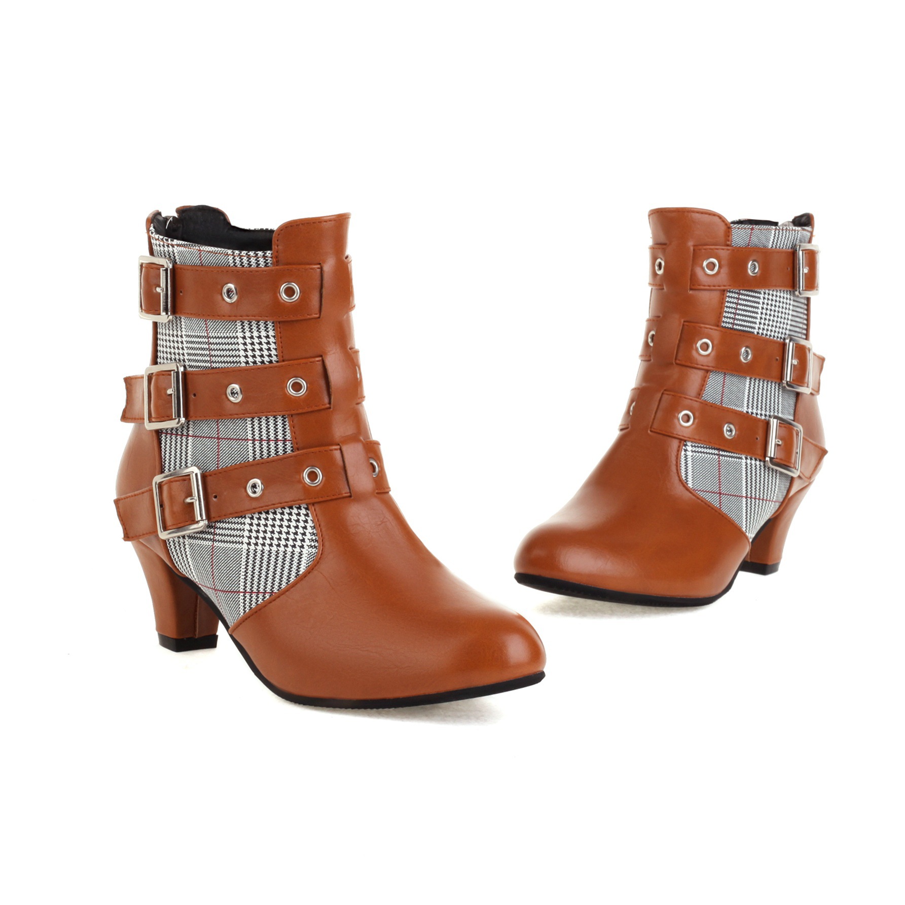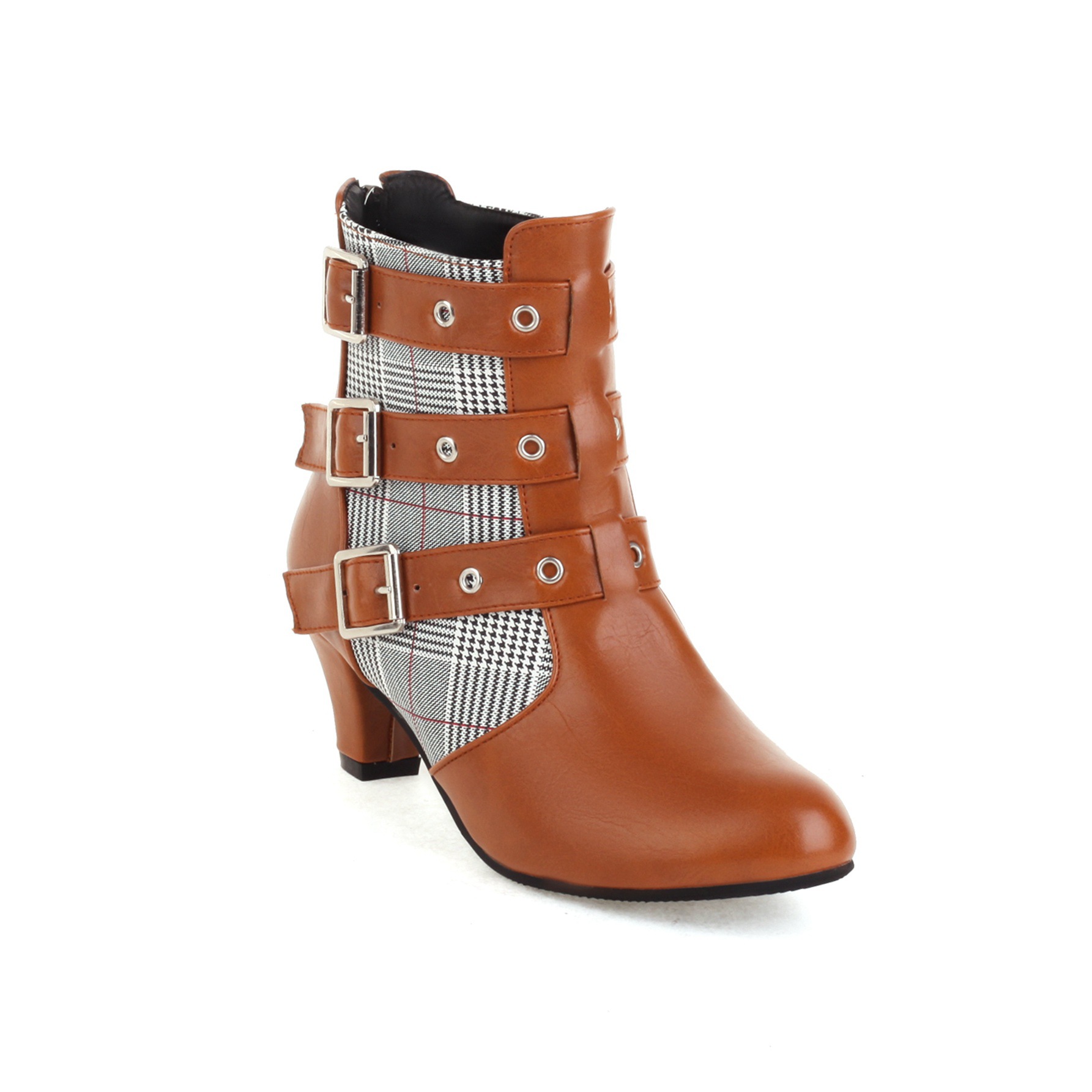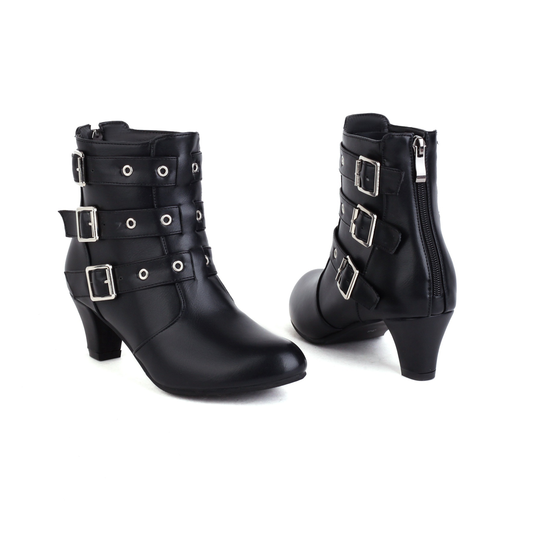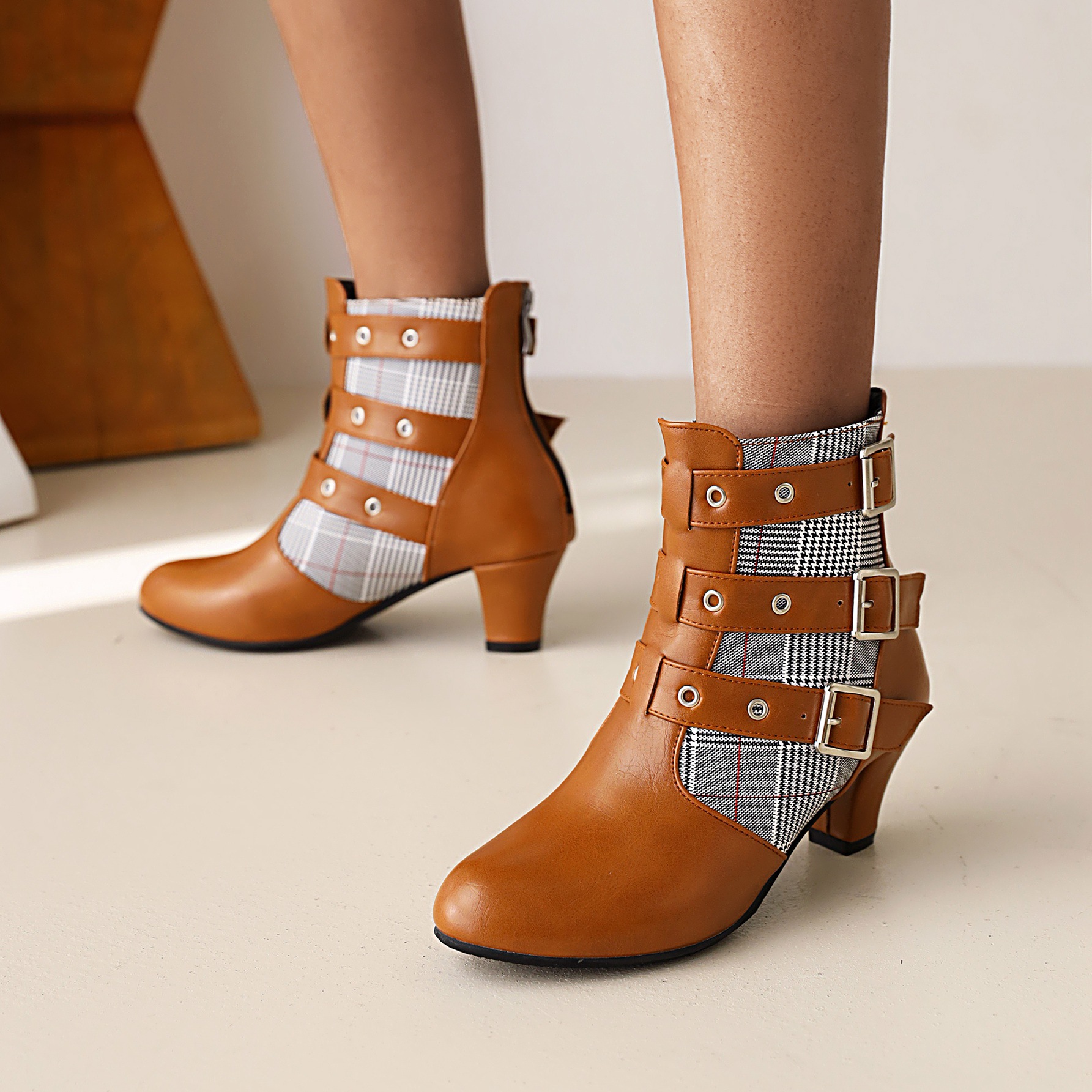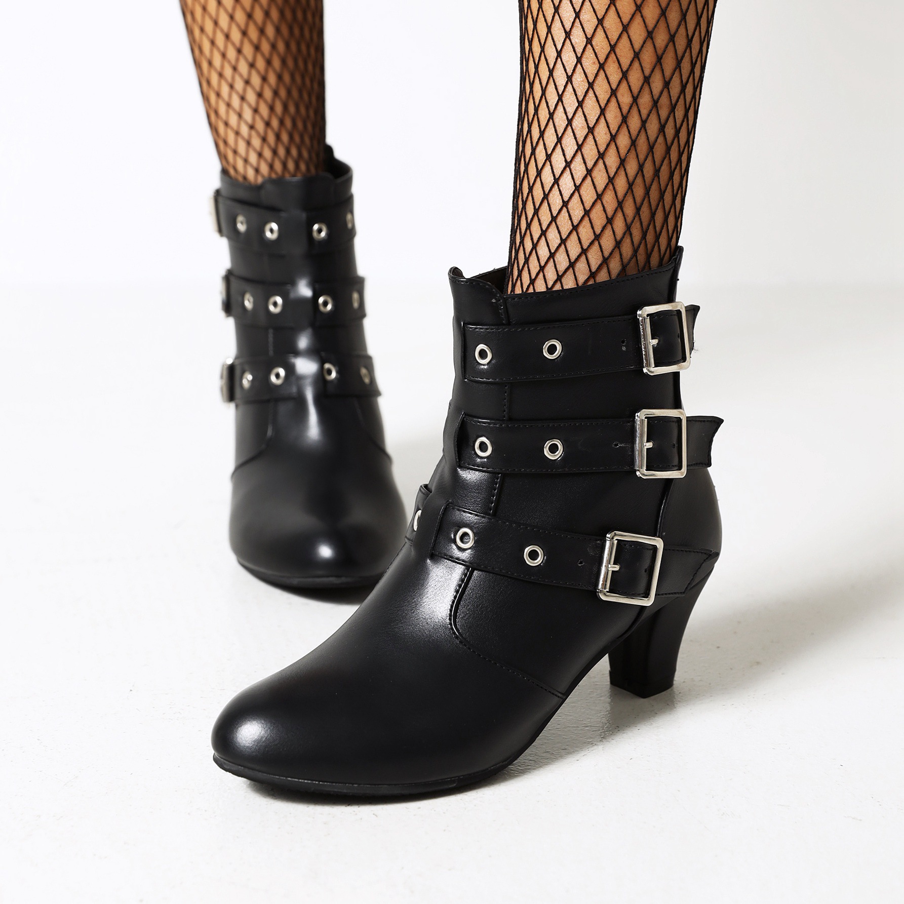 해외 무역 부츠 새로운 유럽과 미국 봄과 가을 부츠 복고풍 벨트 버클 로마 부츠 짧은 배럴 마틴 부츠 두꺼운 굽 하이힐 부츠