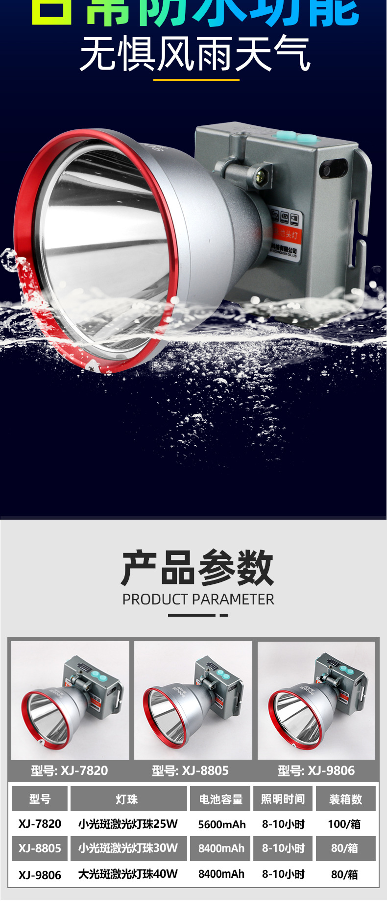 • J821 폴리머 방수 유도 헤드 라이트 배터리 10-20 시간