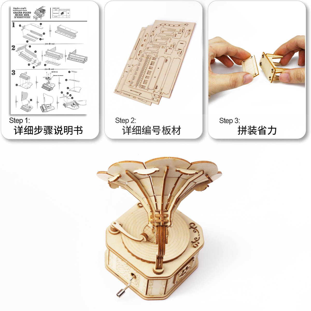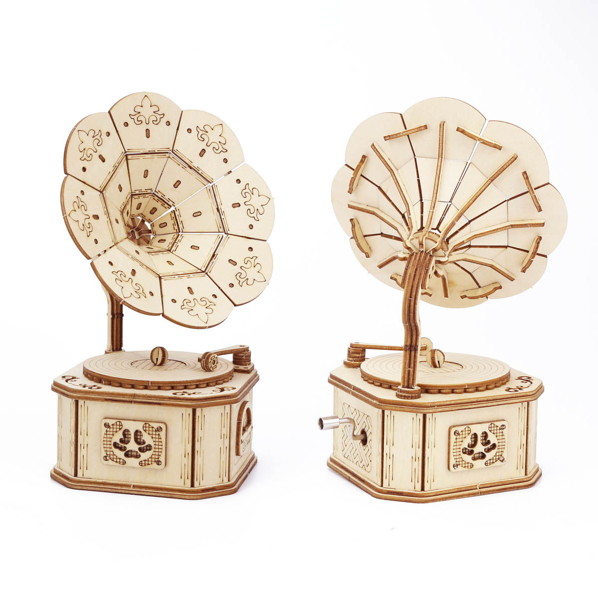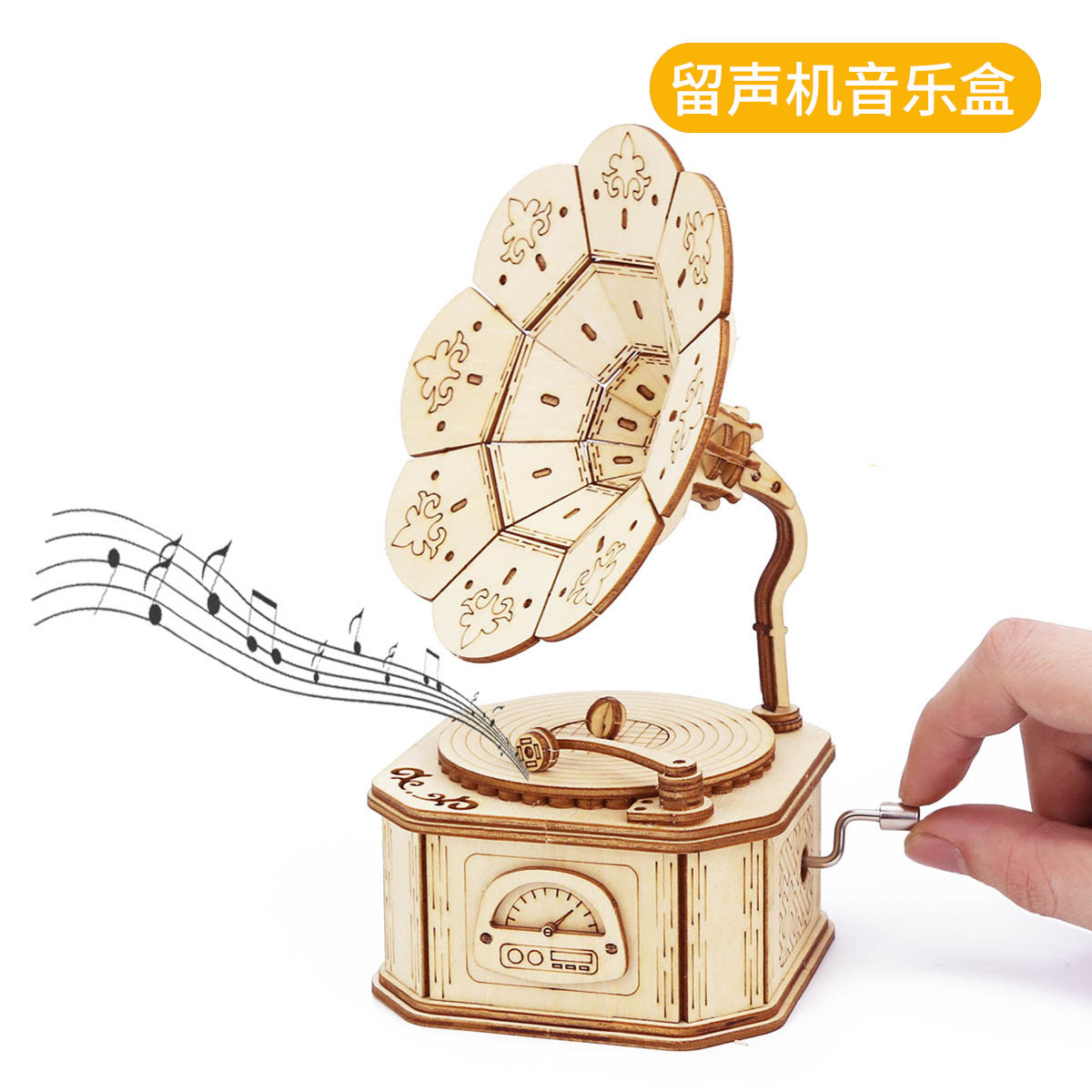 Phonograph 뮤직 박스 3D 빌딩 블록 퍼즐 수제 장난감 데스크탑 장식 휴일 선물 나무 공예스토어 가기