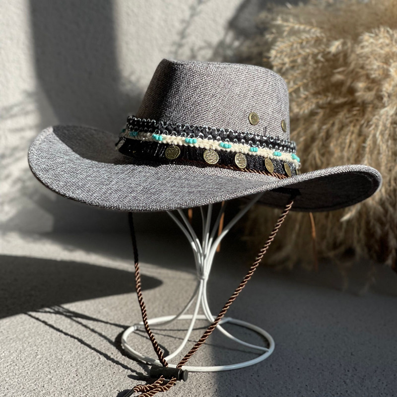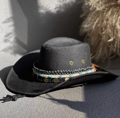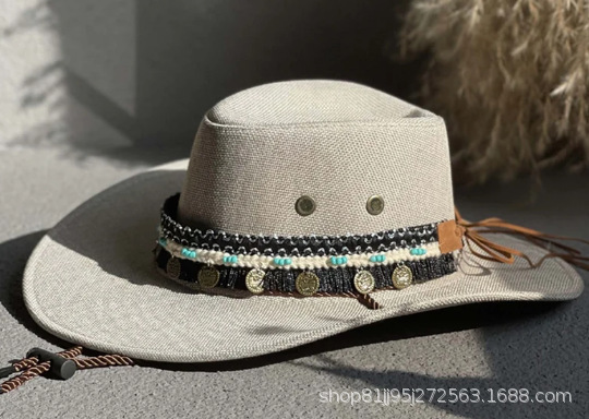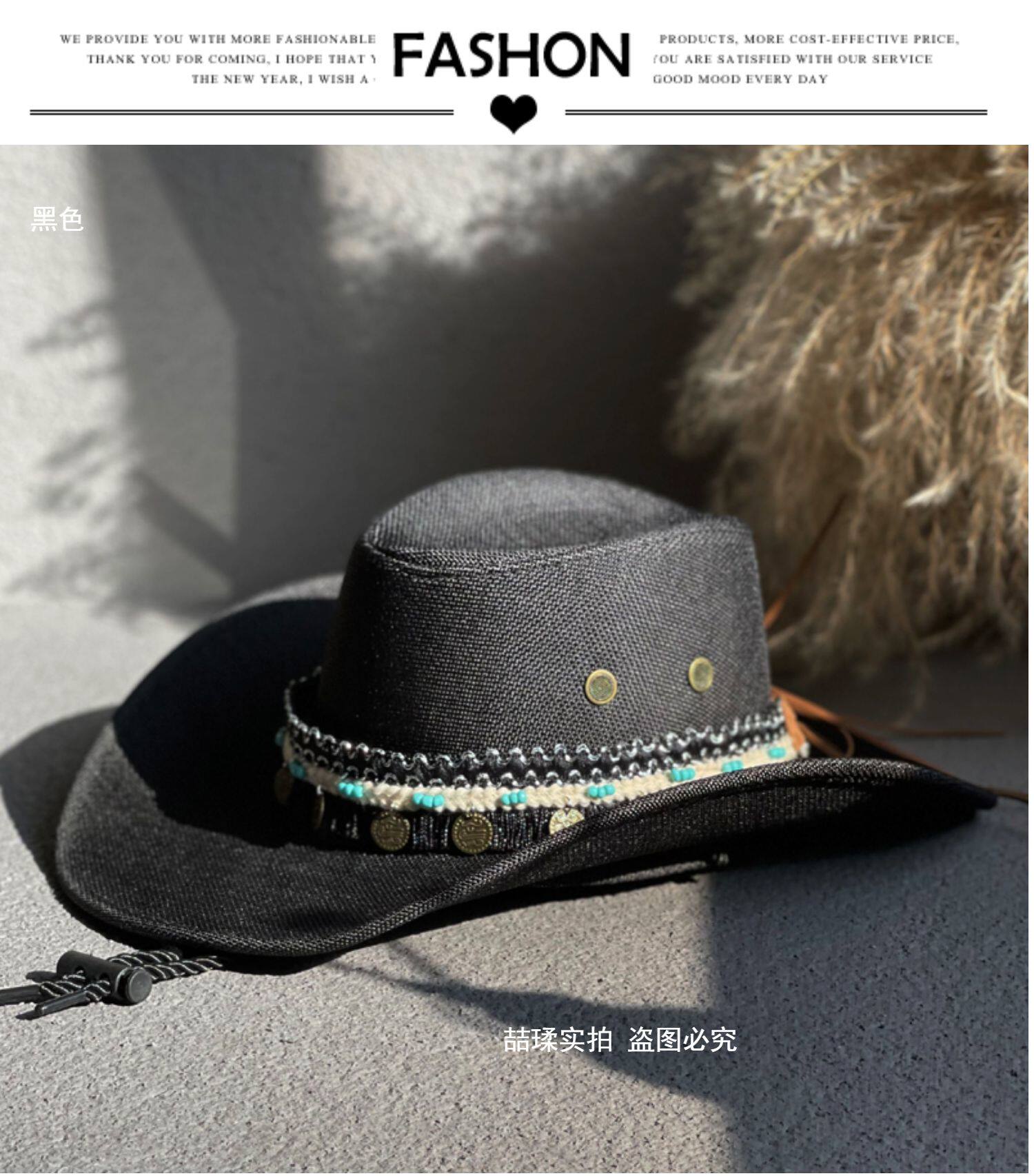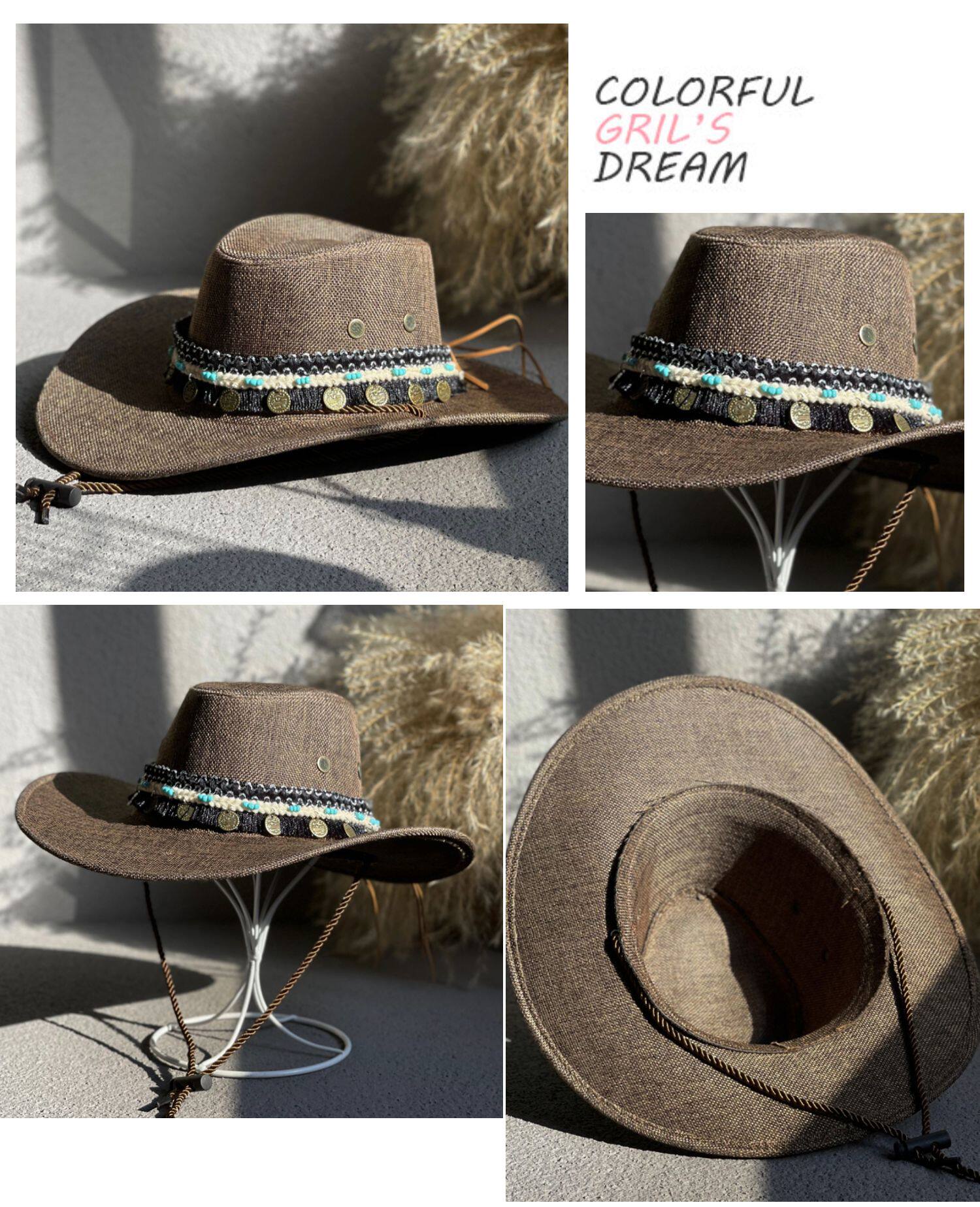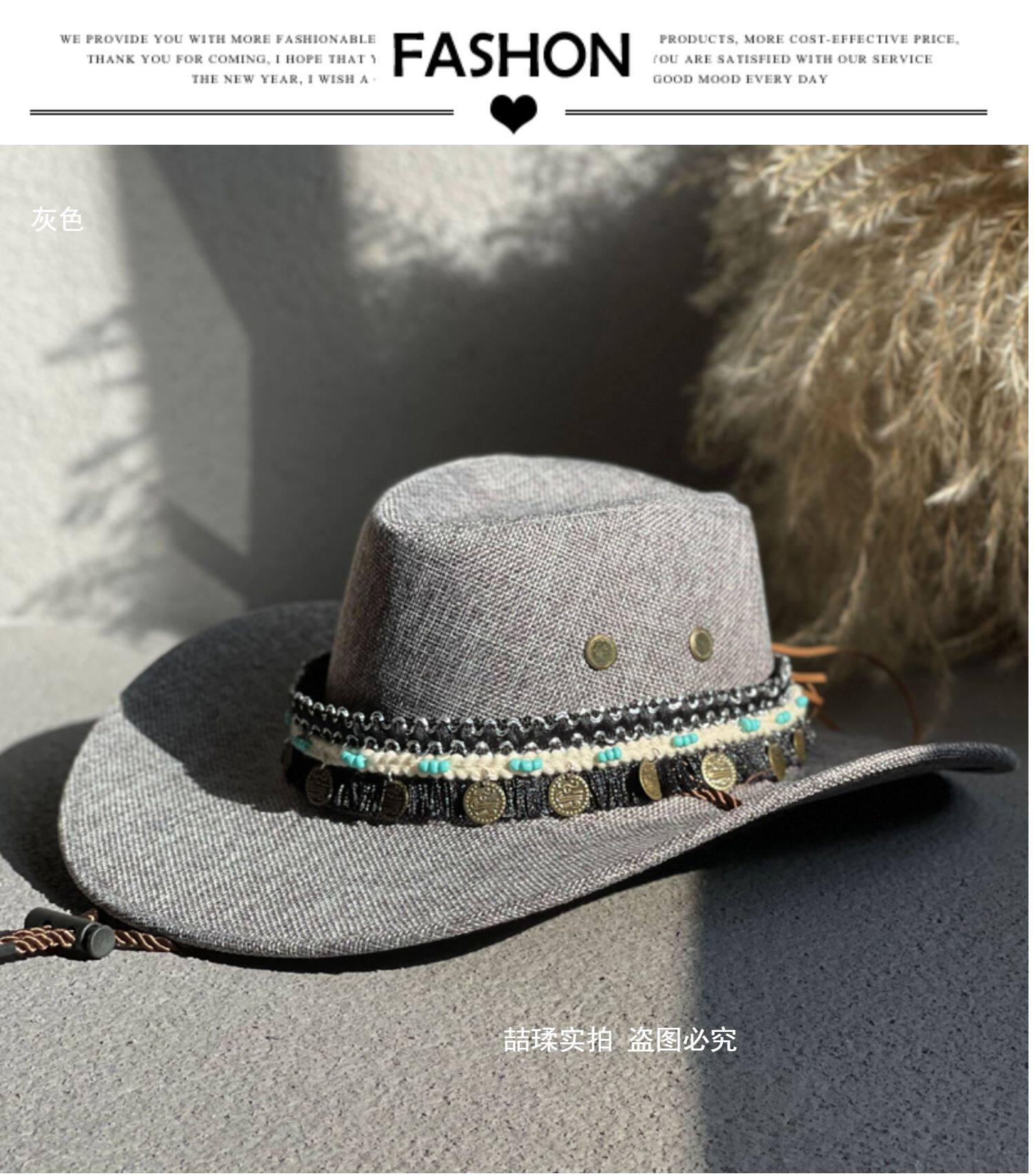 에스닉 스타일 재즈 밀짚 모자 여자의 봄과 여름 야외 자외선 차단제 모자 웨스턴 데님 모자 남자의 등산 태양 모자
