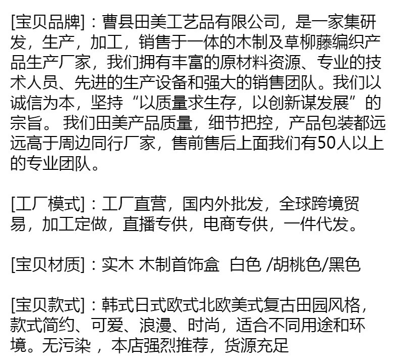 发货之前店主每个首饰盒和木制品都会检查,但是咱们每个首饰盒都是纯纯的手工制作的。 木材本身的缺口、虫洞、裂纹、深色、白色色差、气味、毛边、白痕、轻微划痕、胶痕等不属于质量问题,不影响宝子们的使用哦,这也是所有木制品不可避免的问题呢! 但是本店价格已经是市面上价格很低的了,而且材质用料上并未偷工减料哦。 本店的首饰盒都是实木的,不是便宜的塑料和密度板制造的,小问题希望宝子们理解, 店主脾气很好,有问题都可以沟通,本店拒绝显微镜女孩。