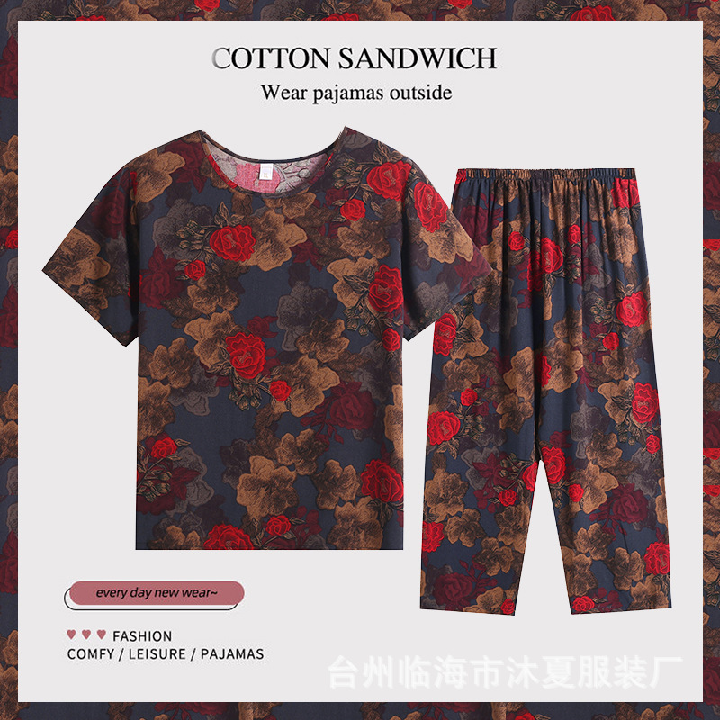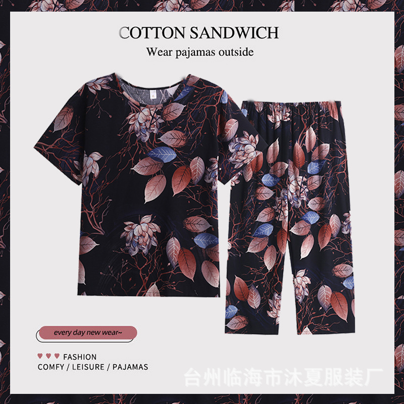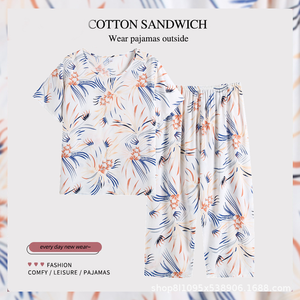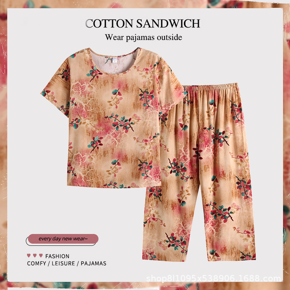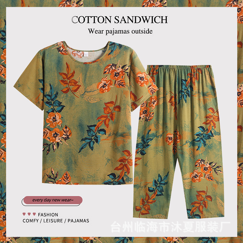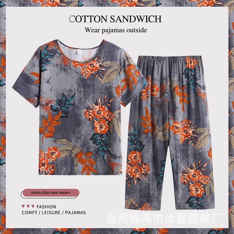 여름 중년의 어머니와 할머니는 느슨한 플러스 사이즈 반팔 가정복 잠옷 여자의 면 실크 세트 얇은 입을 수 있습니다스토어 가기