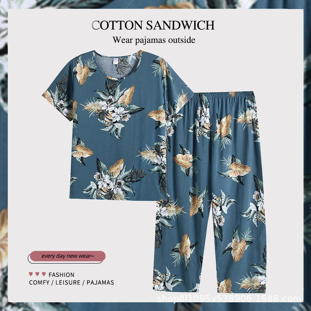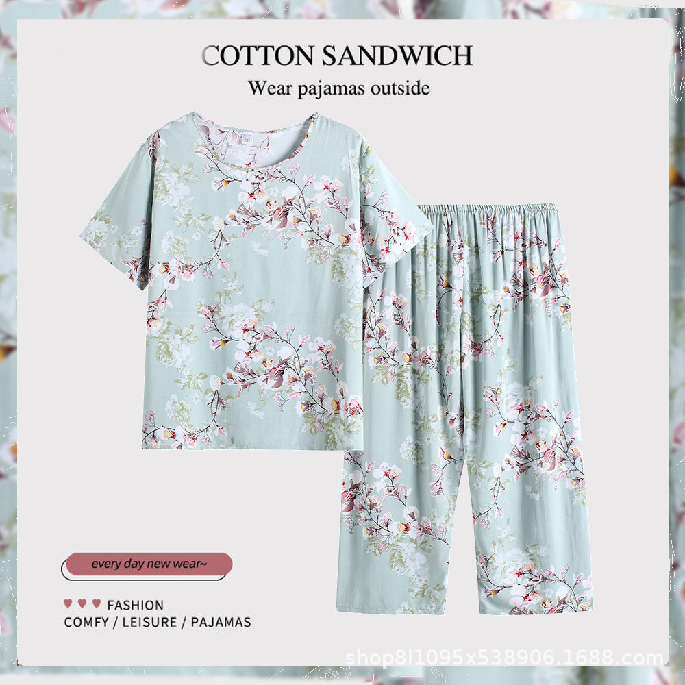 여름 중년의 어머니와 할머니는 느슨한 플러스 사이즈 반팔 가정복 잠옷 여자의 면 실크 세트 얇은 입을 수 있습니다