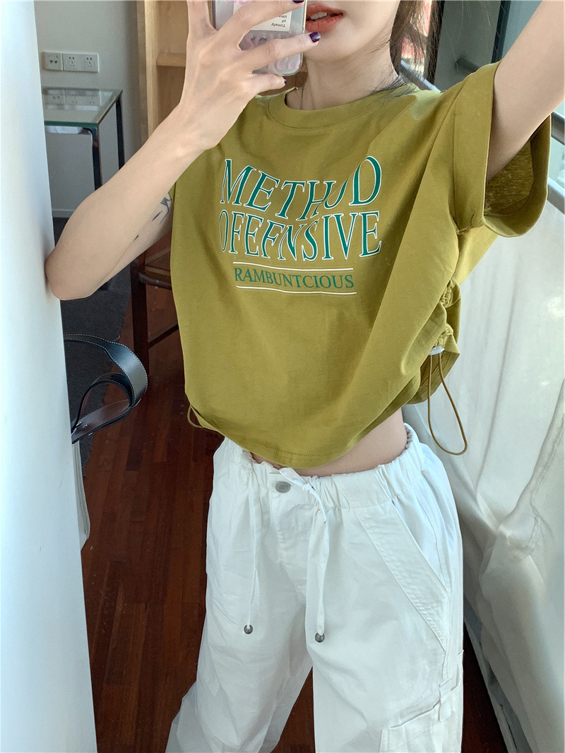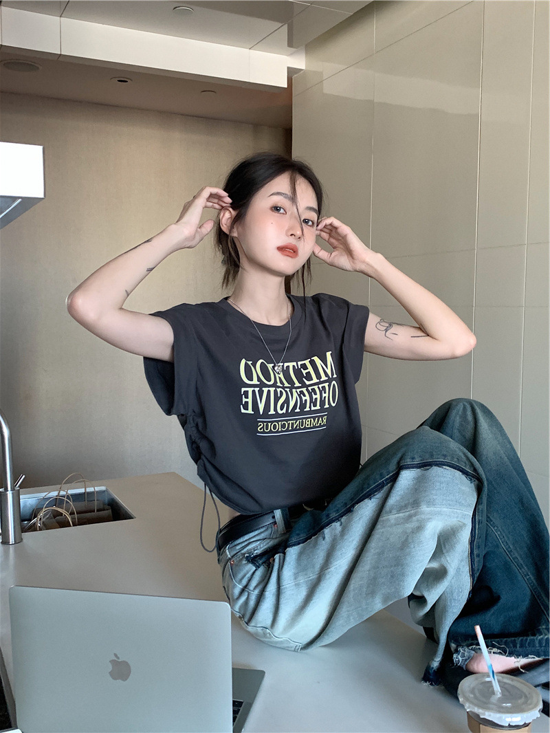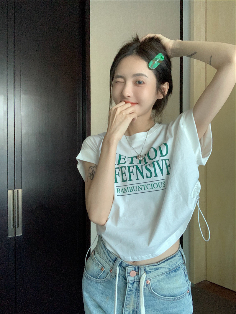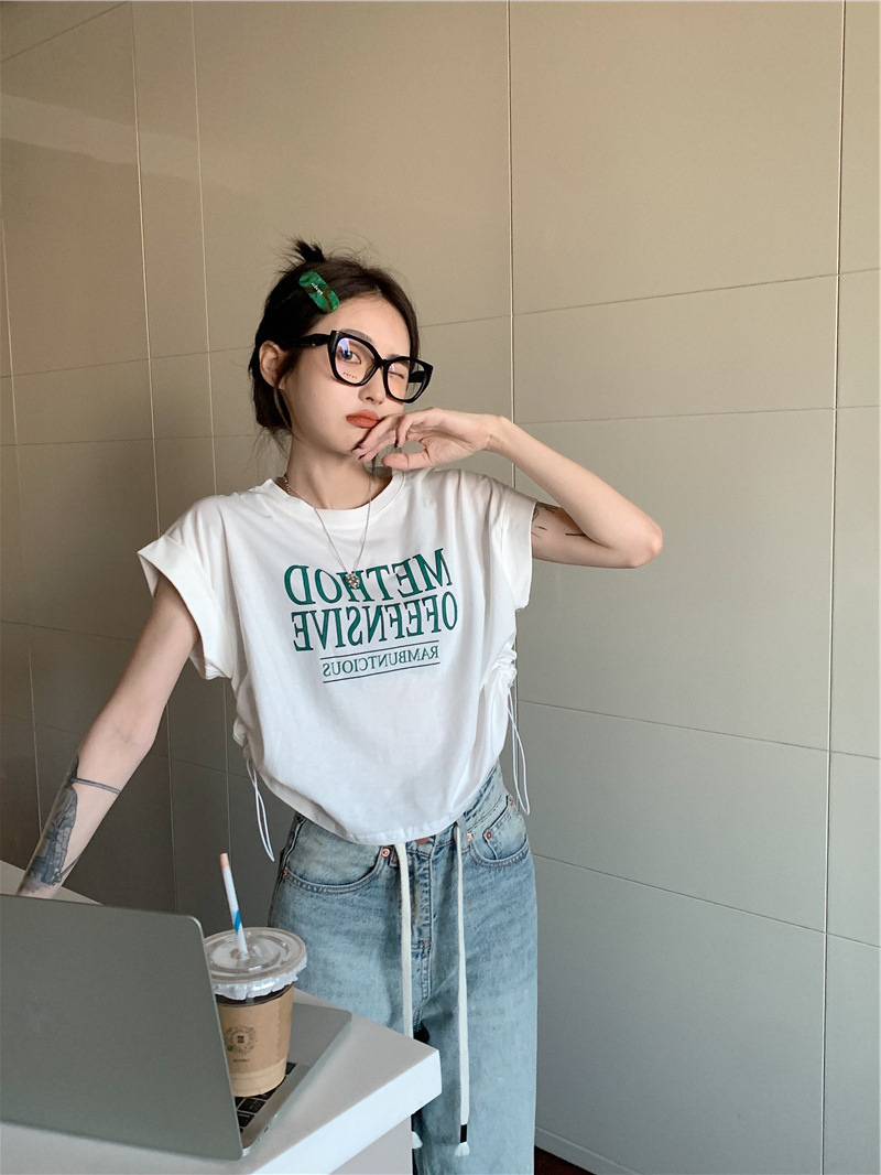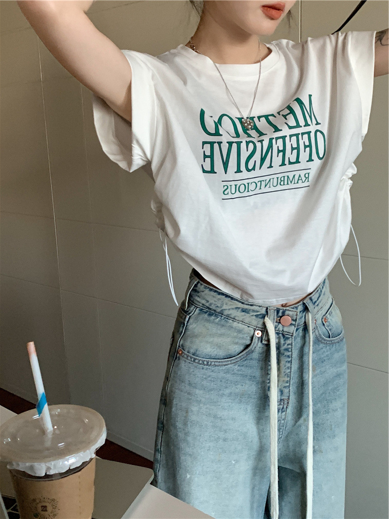 디자인 센스 반팔 티셔츠 여성 여름 불규칙한 틈새 새로운 한국 스타일 세련된 드로스트링 루즈 쇼트 탑 Ins스토어 가기
