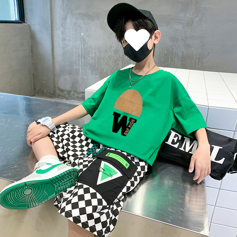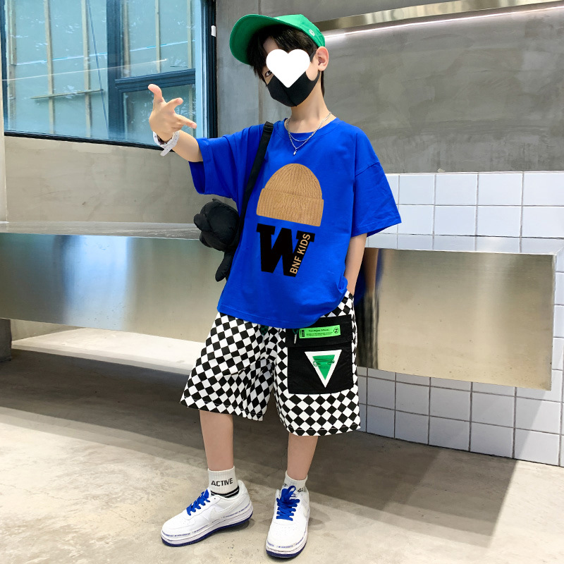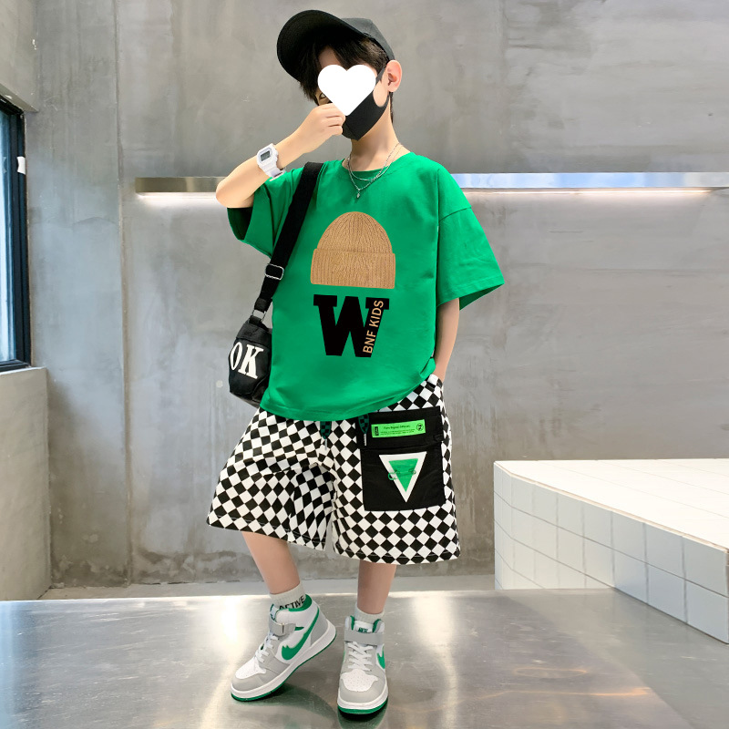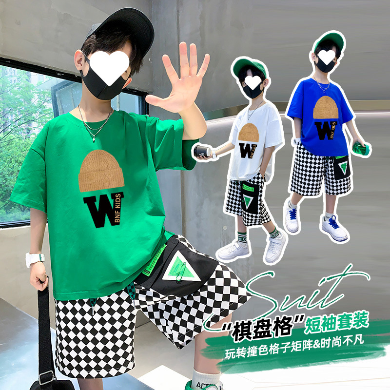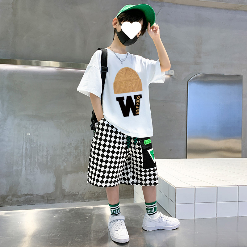 남아 여름 바지 스포츠 세트 2023 새로운 어린이 만화 티셔츠 바둑판 반바지 투피스 세트