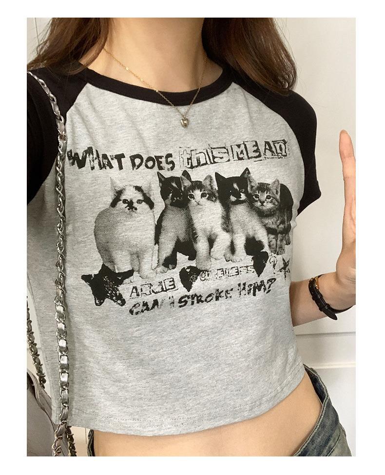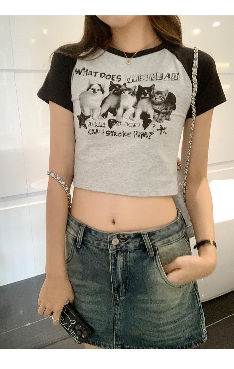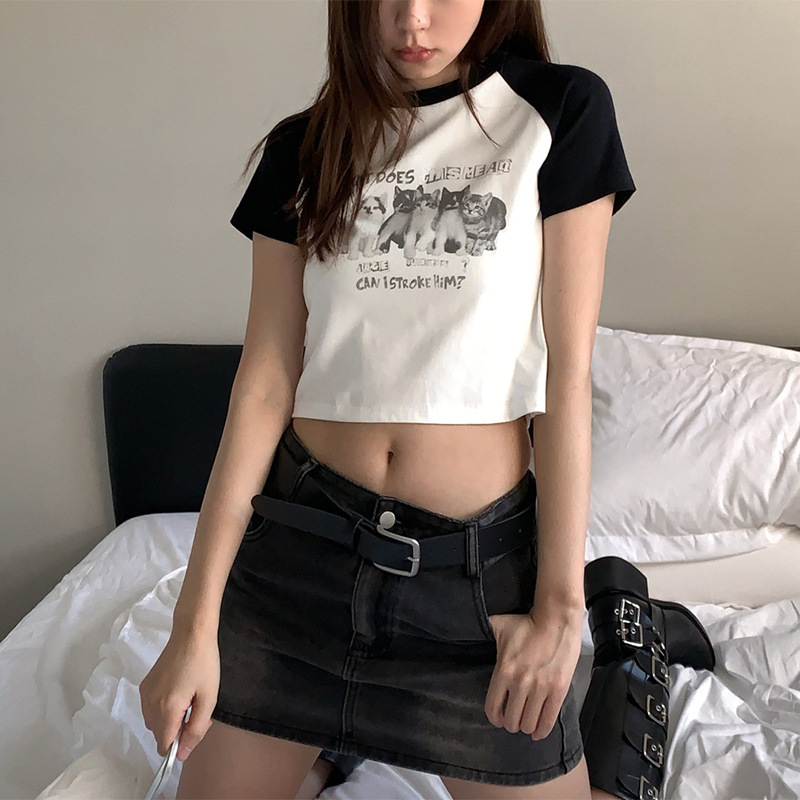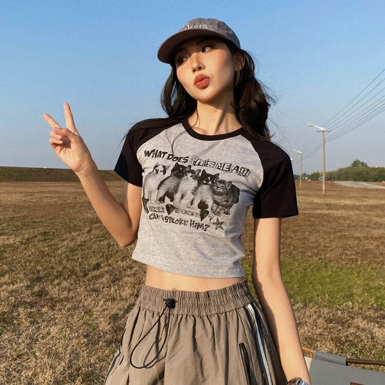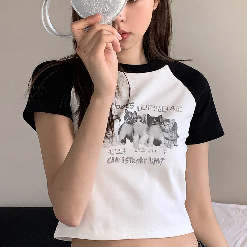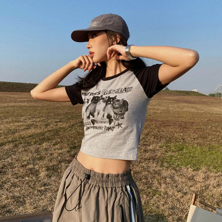 아메리칸 스타일 레트로 스파이스 소녀 라글란 슬리브 콘트라스트 프린트 티셔츠 여성용 2024 년 새 여름 짧은 어깨 라운드 넥 탑스토어 가기