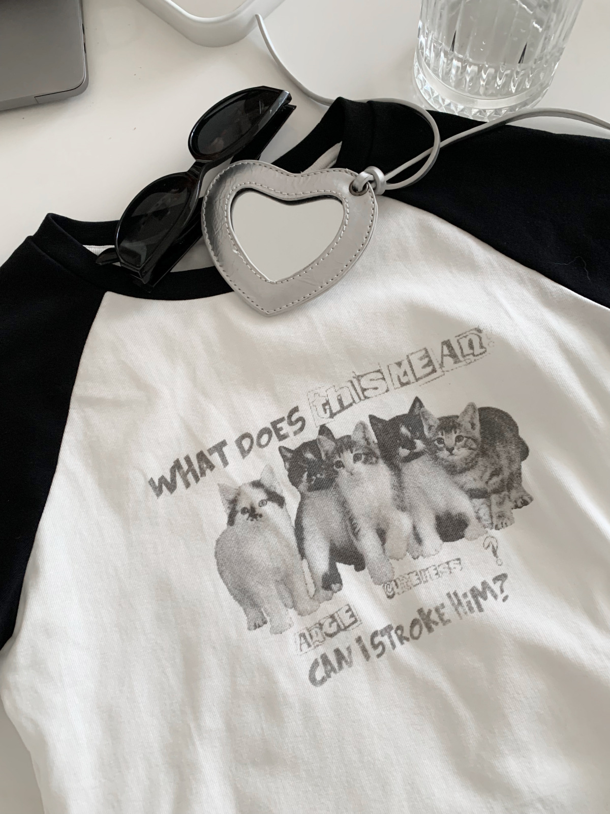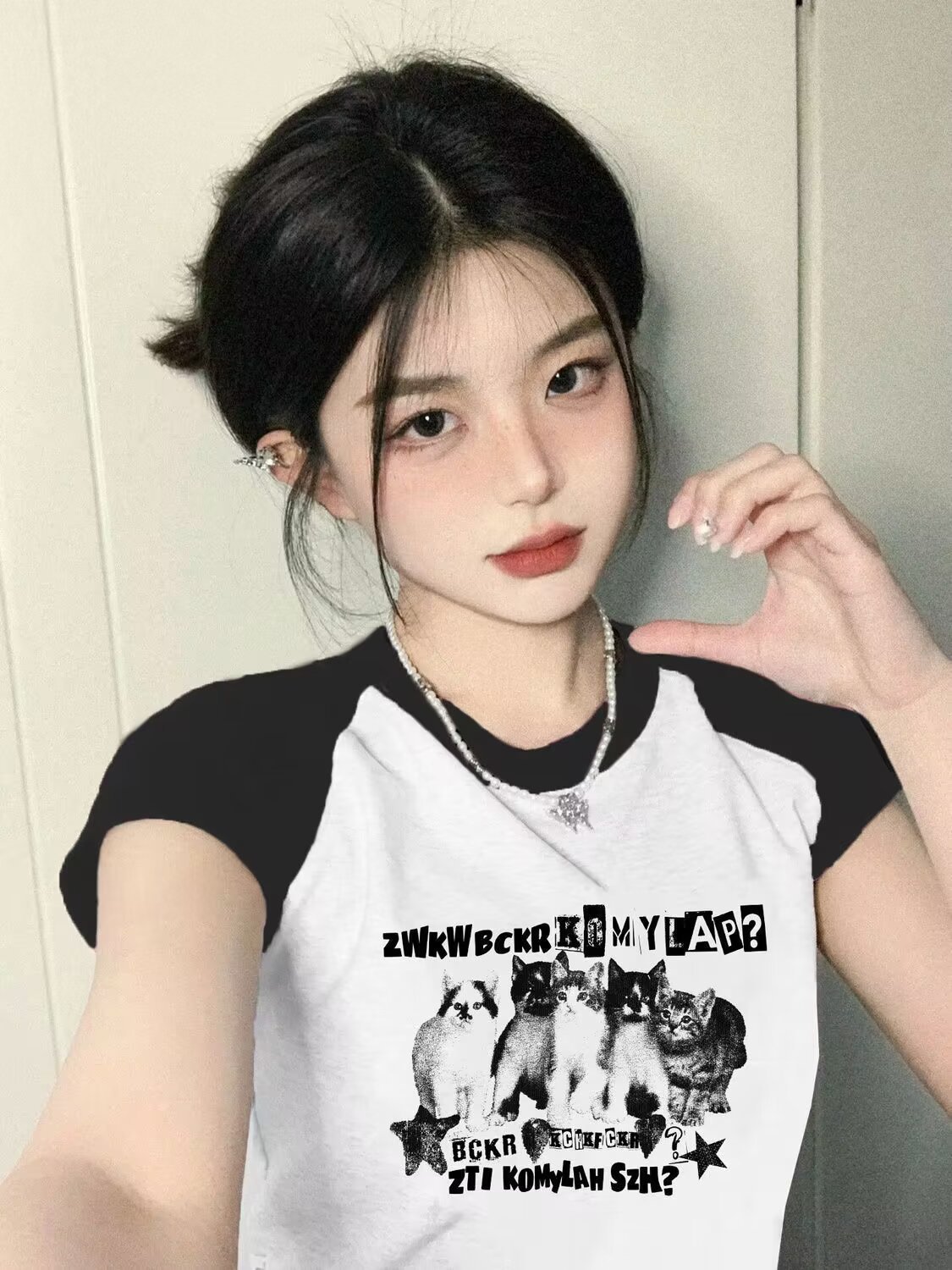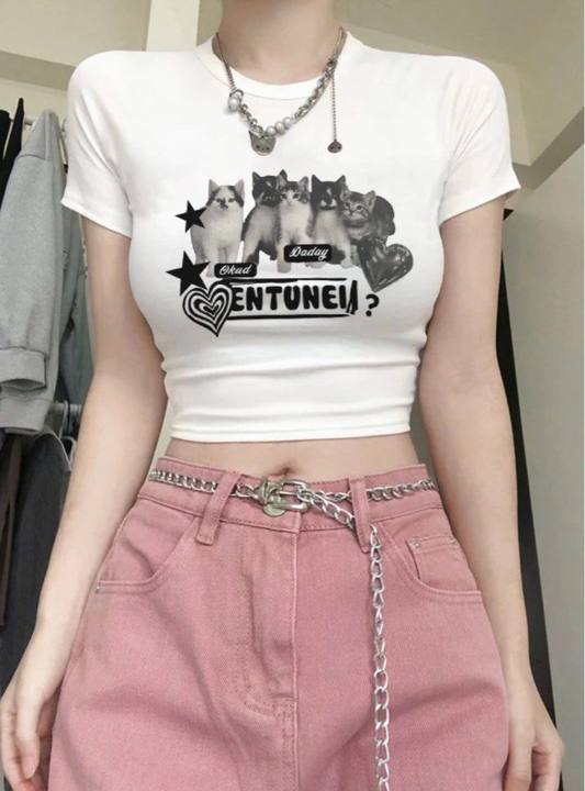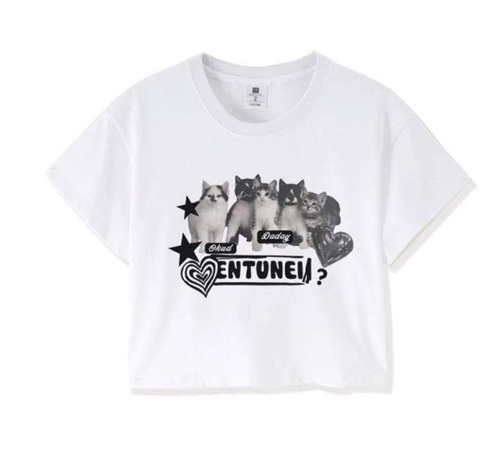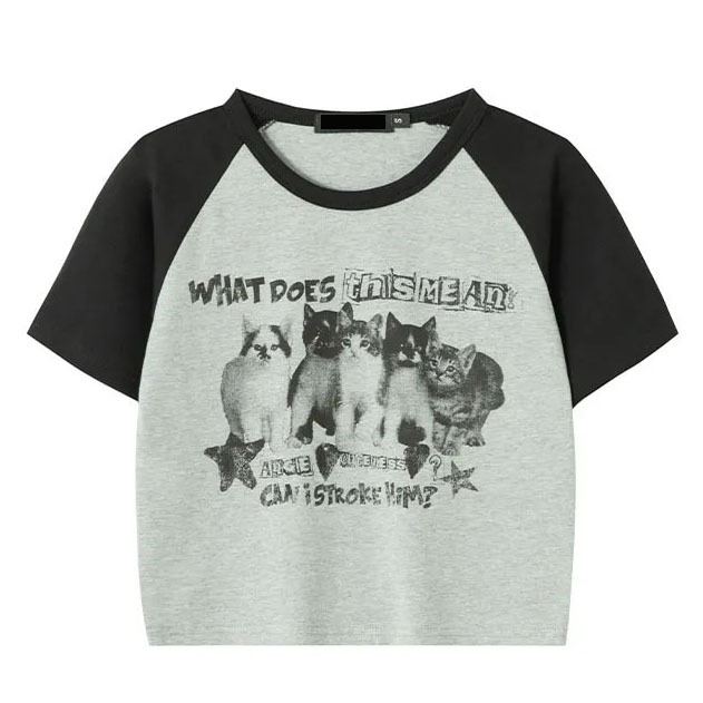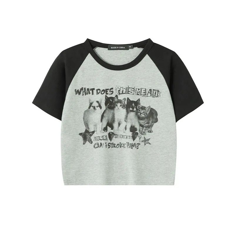 아메리칸 스타일 레트로 스파이스 소녀 라글란 슬리브 콘트라스트 프린트 티셔츠 여성용 2024 년 새 여름 짧은 어깨 라운드 넥 탑스토어 가기