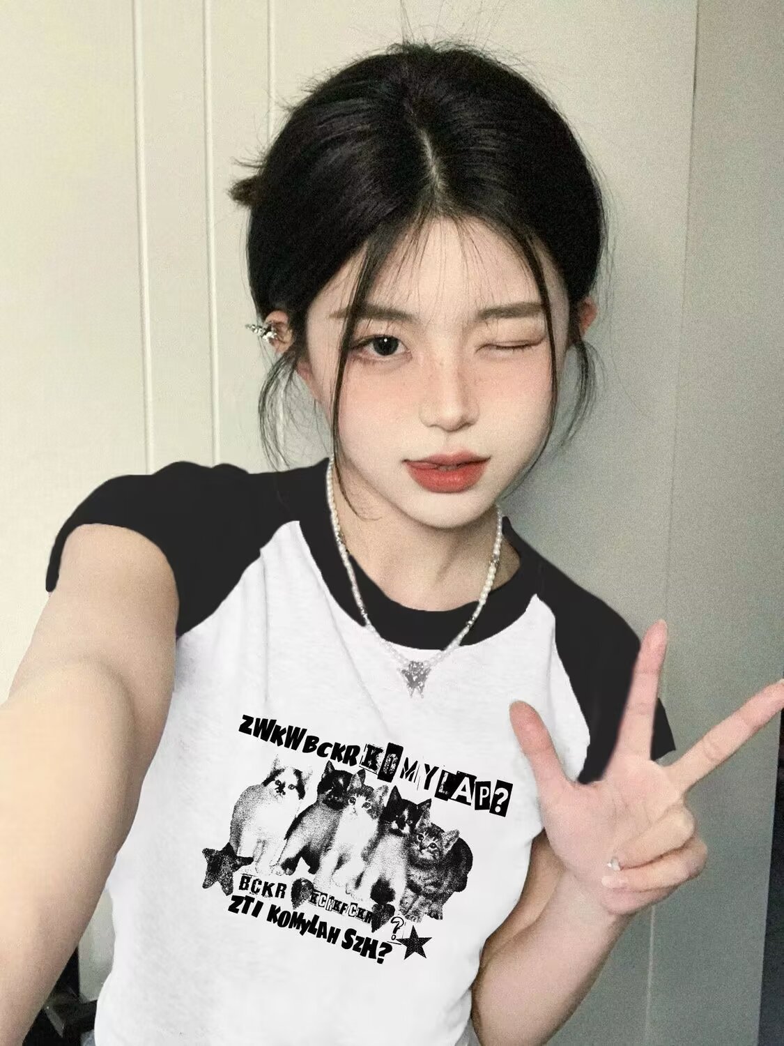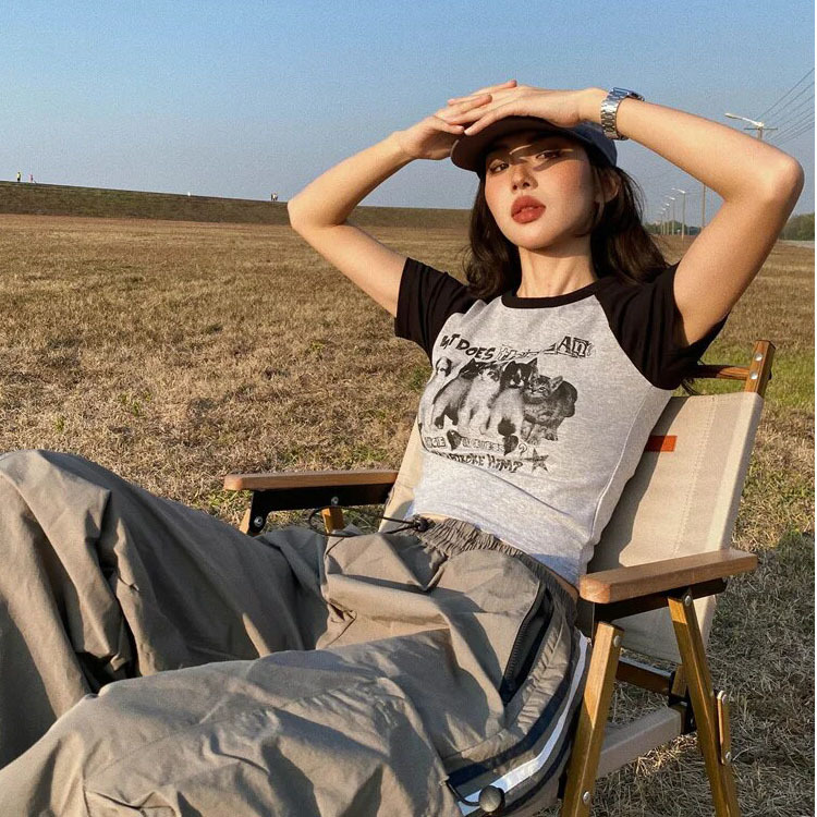아메리칸 스타일 레트로 스파이스 소녀 라글란 슬리브 콘트라스트 프린트 티셔츠 여성용 2024 년 새 여름 짧은 어깨 라운드 넥 탑