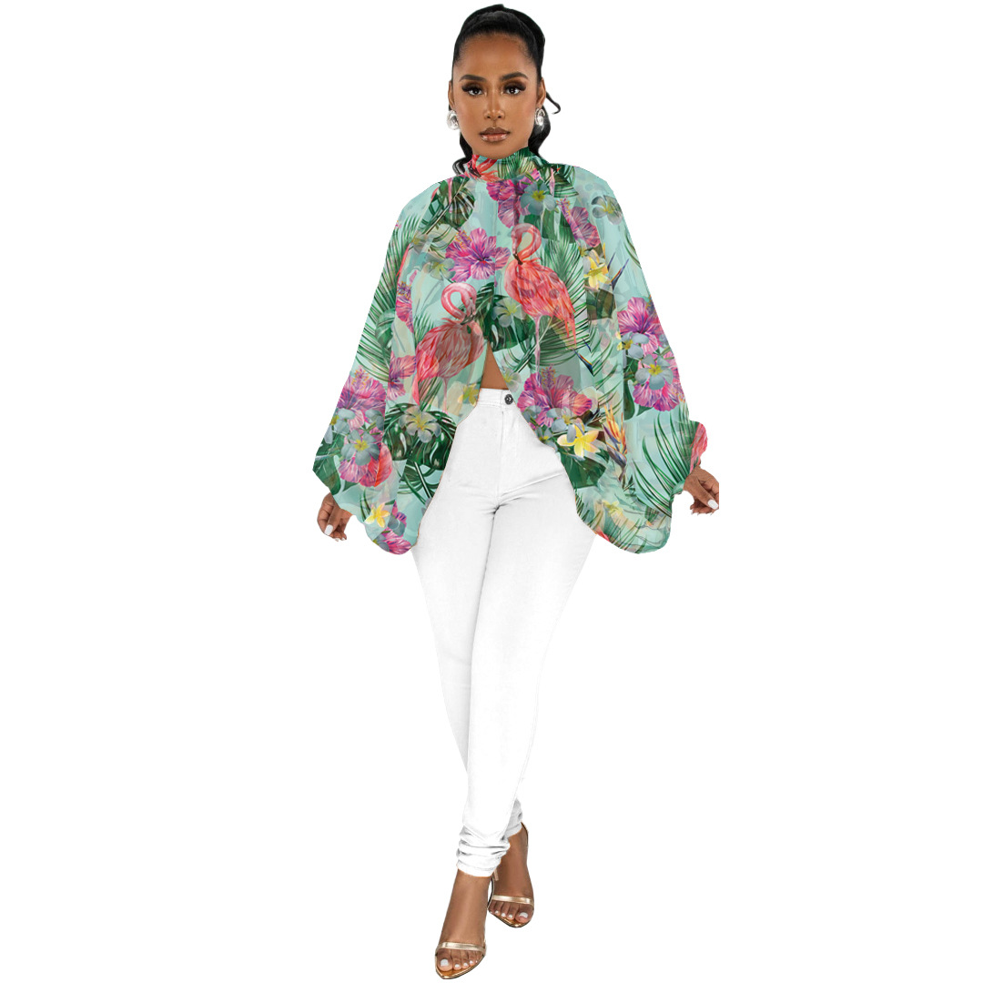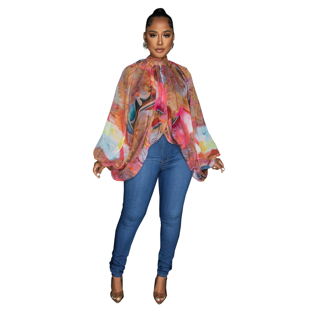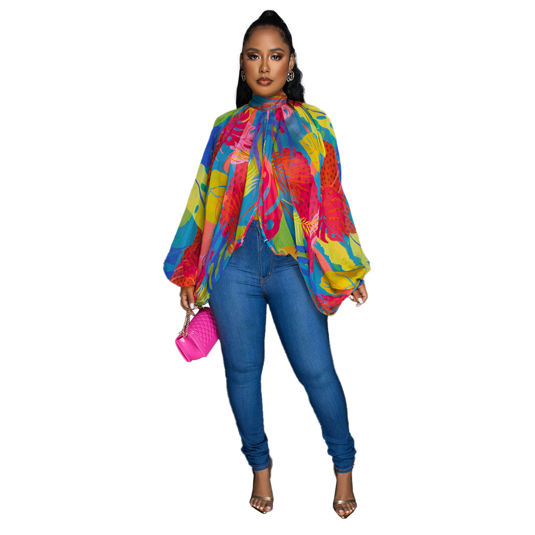 GL6690 아마존 유럽 및 미국 여성 크로스 보더 공급 패션 레이스 업 프린트 쉬폰 셔츠 배트 슬리브 탑