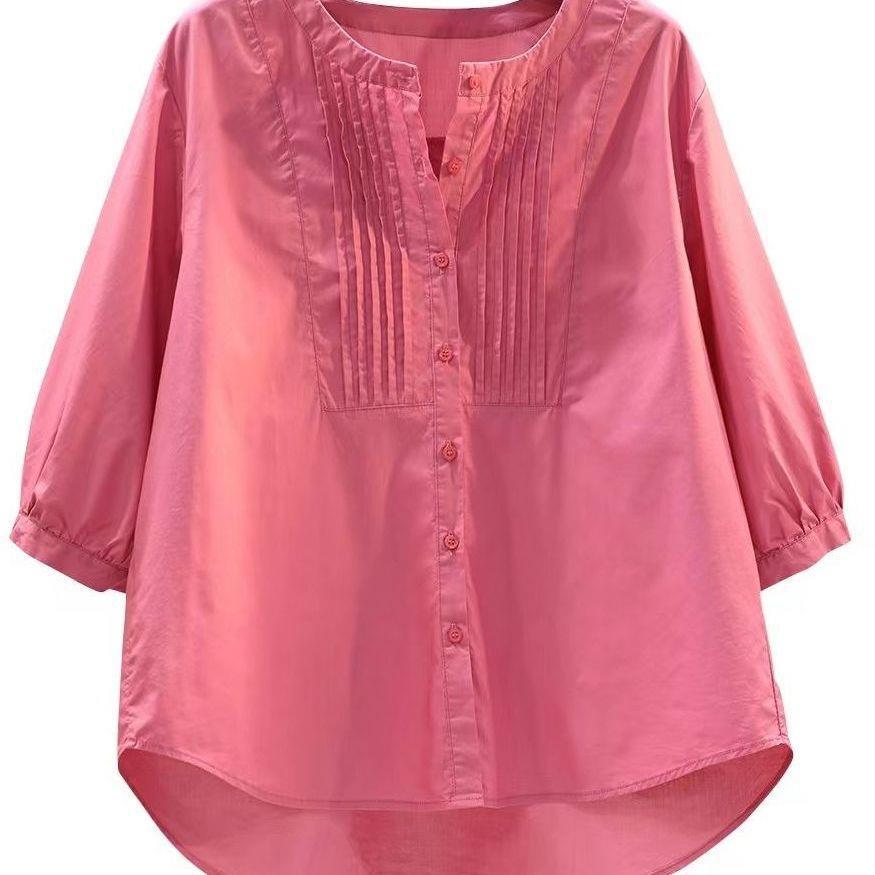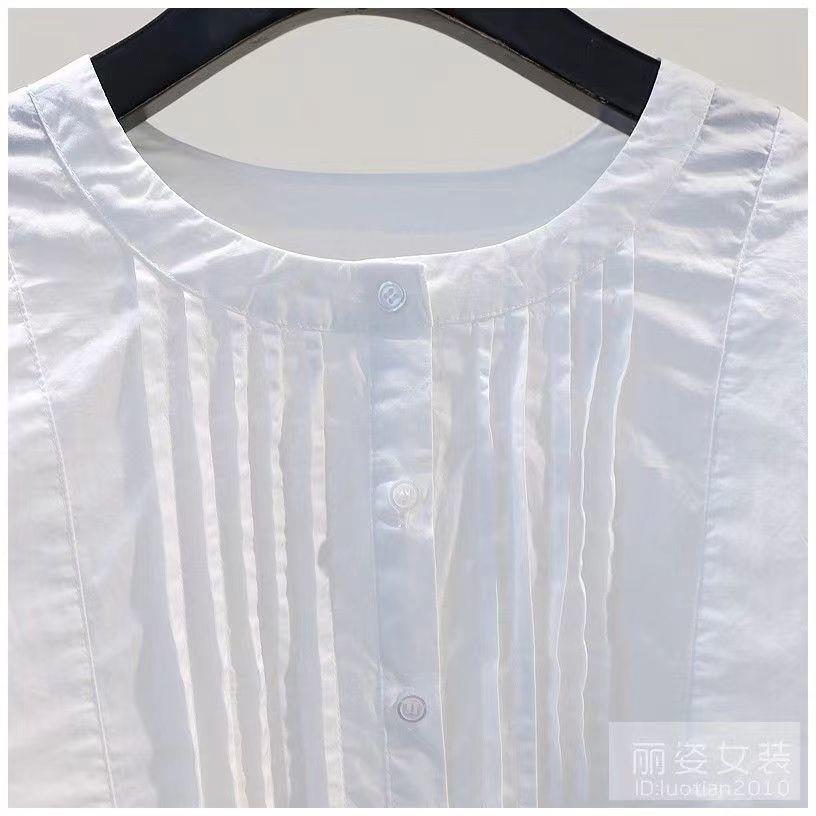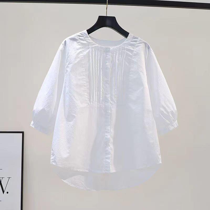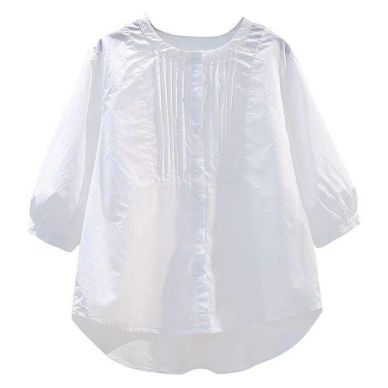 화이트 셔츠 여성용 2023 년 여름 새로운 디자인 플리츠 라운드 넥 7 점 슬리브 캐주얼 모든 매치 셔츠 탑