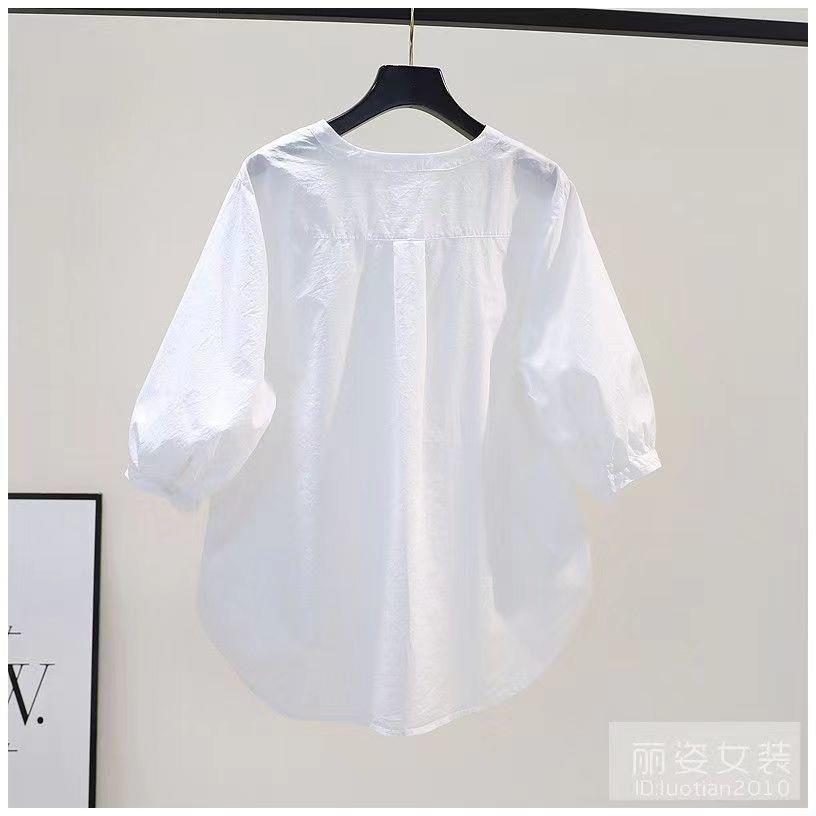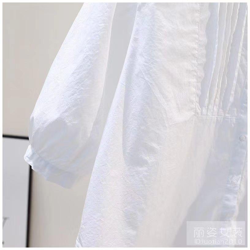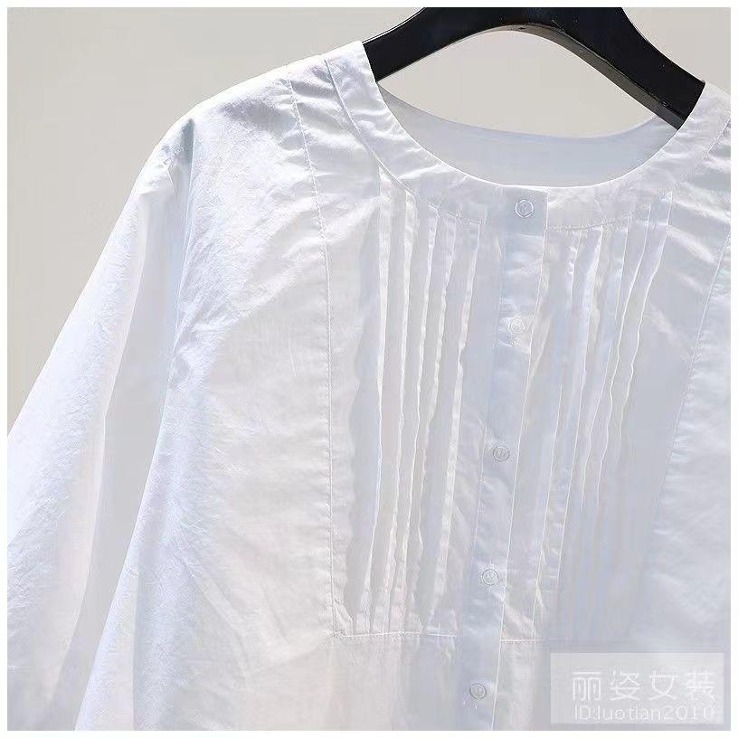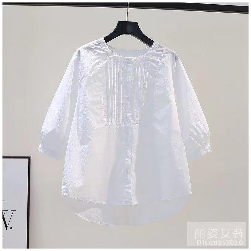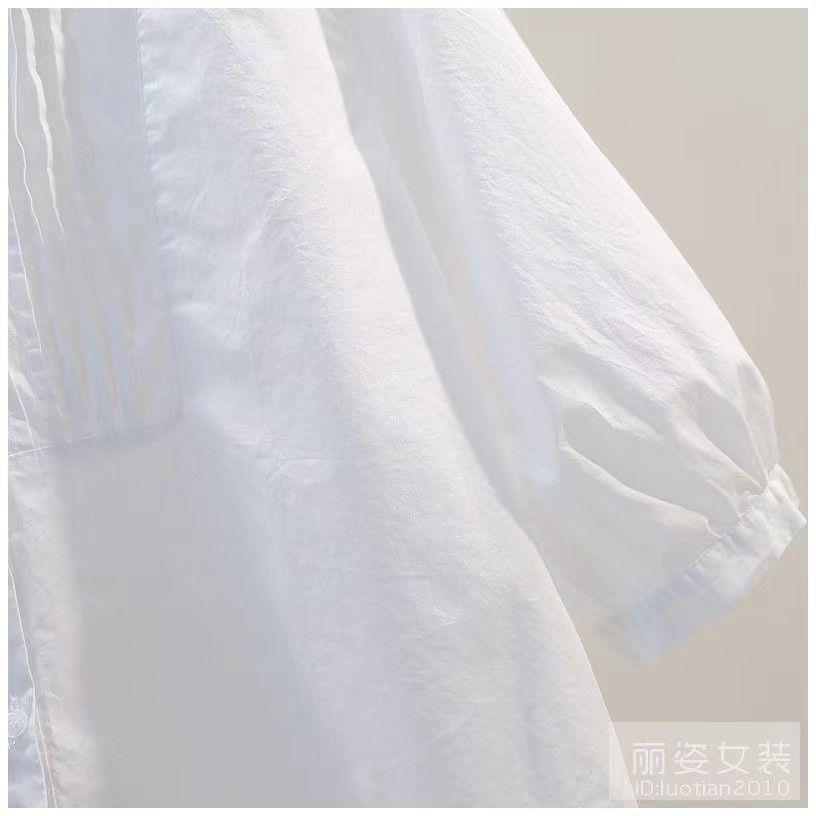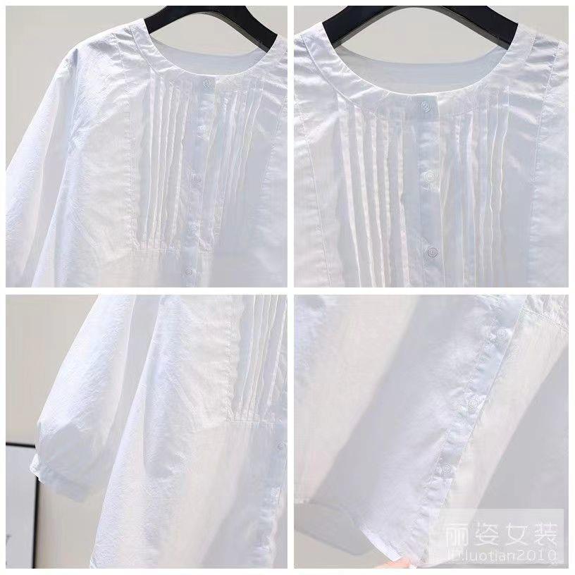 화이트 셔츠 여성용 2023 년 여름 새로운 디자인 플리츠 라운드 넥 7 점 슬리브 캐주얼 모든 매치 셔츠 탑스토어 가기