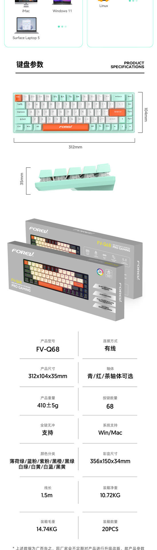유선 게임 e스포츠 RGB 러시아어 공동 브랜드 맞춤형 3모드 기계식 키보드 FV-Q68 컴퓨터 휴대용 키보드