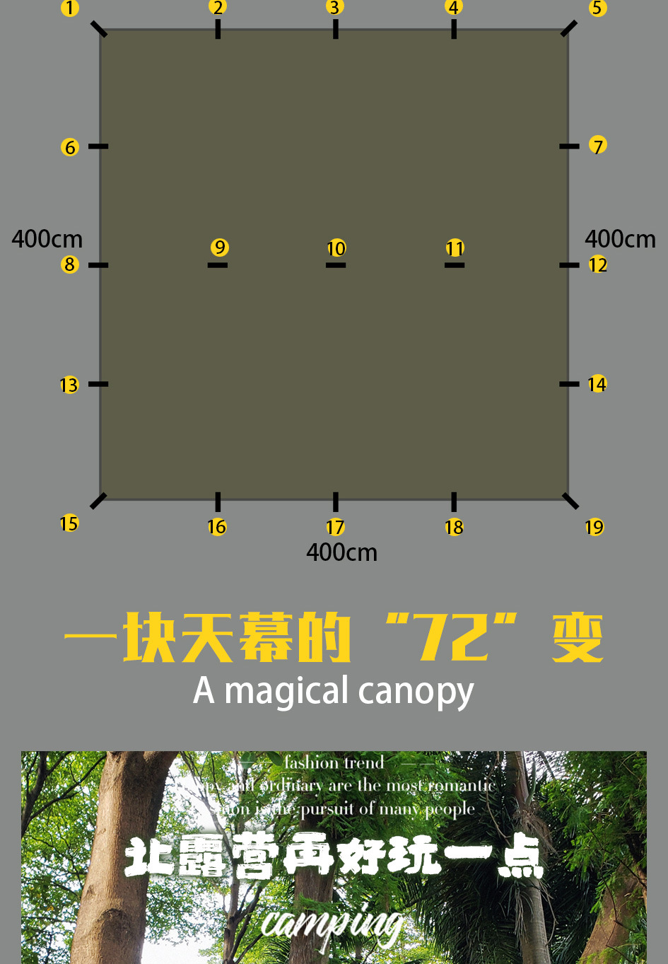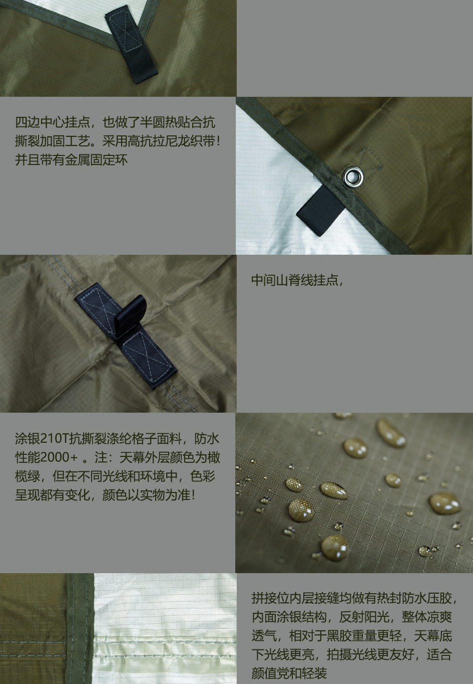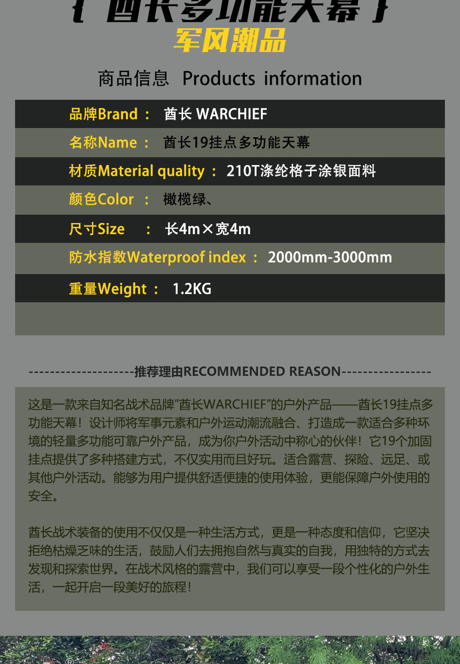 Chieftain 스포츠 야외 캠핑 210T 실버 코팅 캐노피 텐트 19 교수형 포인트 캠핑 장비 방수 및 자외선 차단제