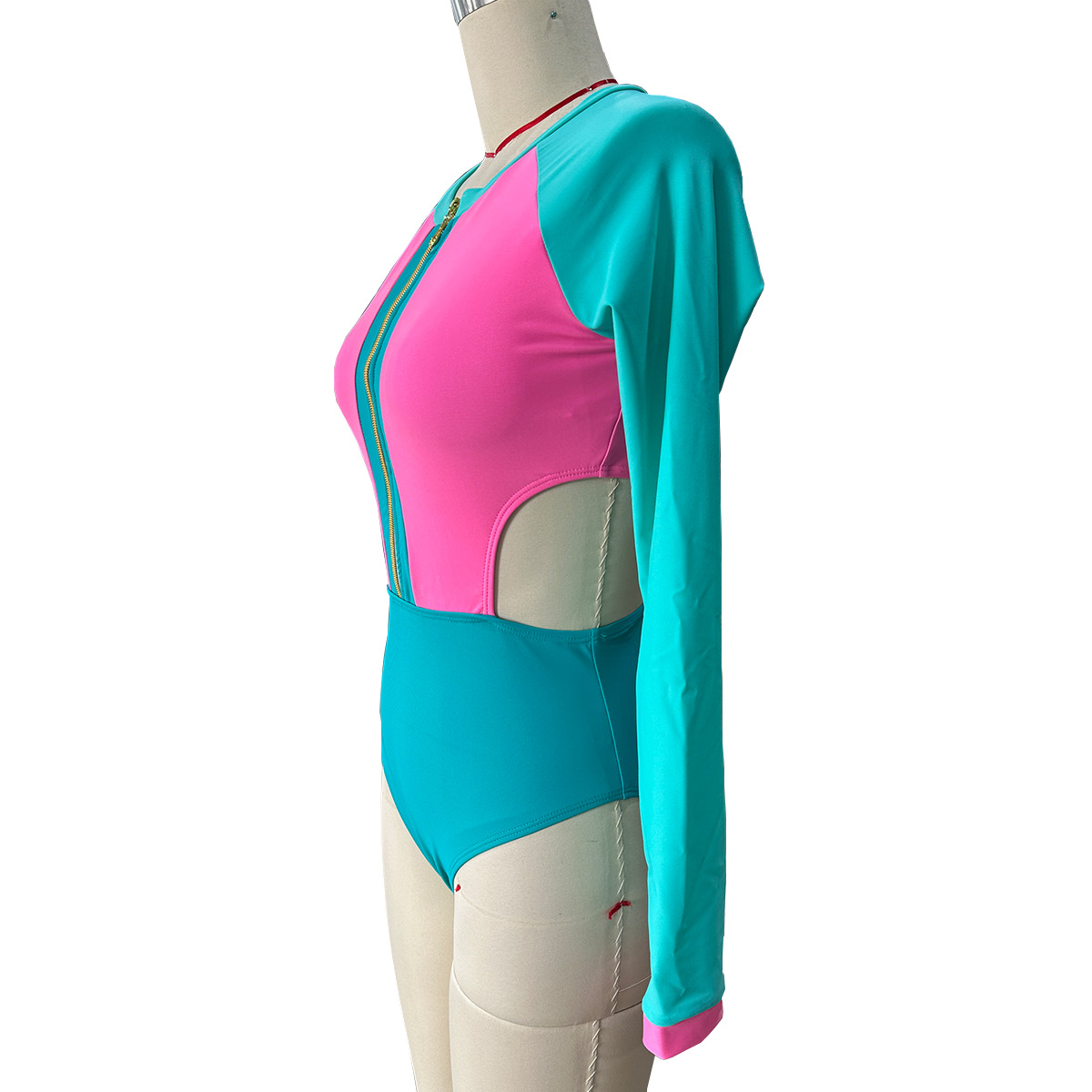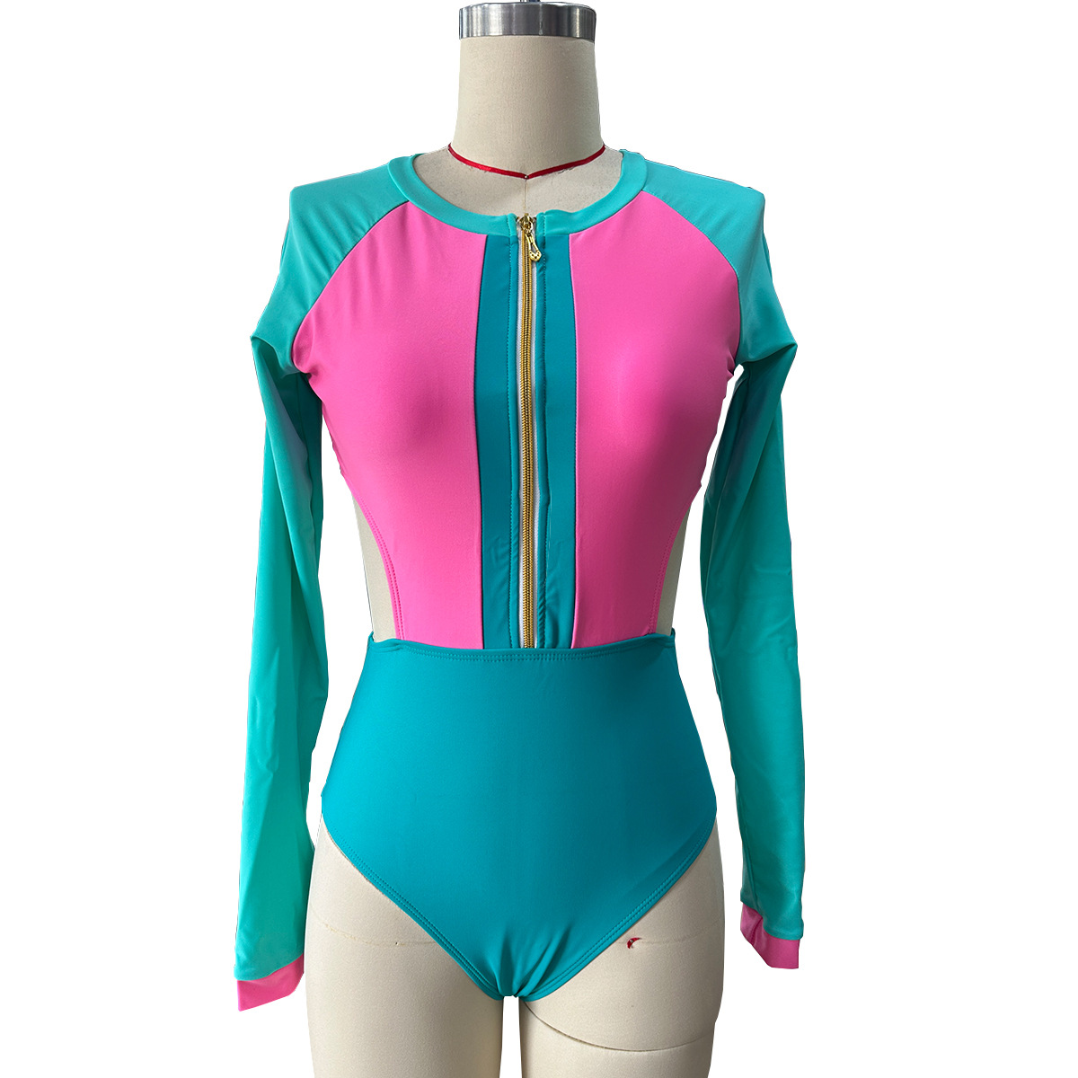 아마존 새로운 유럽과 미국의 패션 컬러 매칭 섹시 슬림 모양의 지퍼 수영복 여성용 꽉 긴팔 서핑 수트
