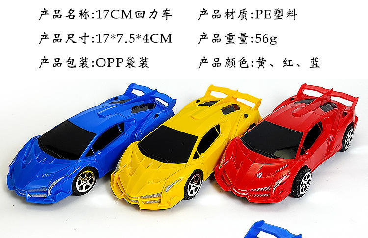 产品特点:回力车,小汽车放地上用手把向后拖动,然后松手,小汽车就会向前跑,仿真造型,外观帅气。
