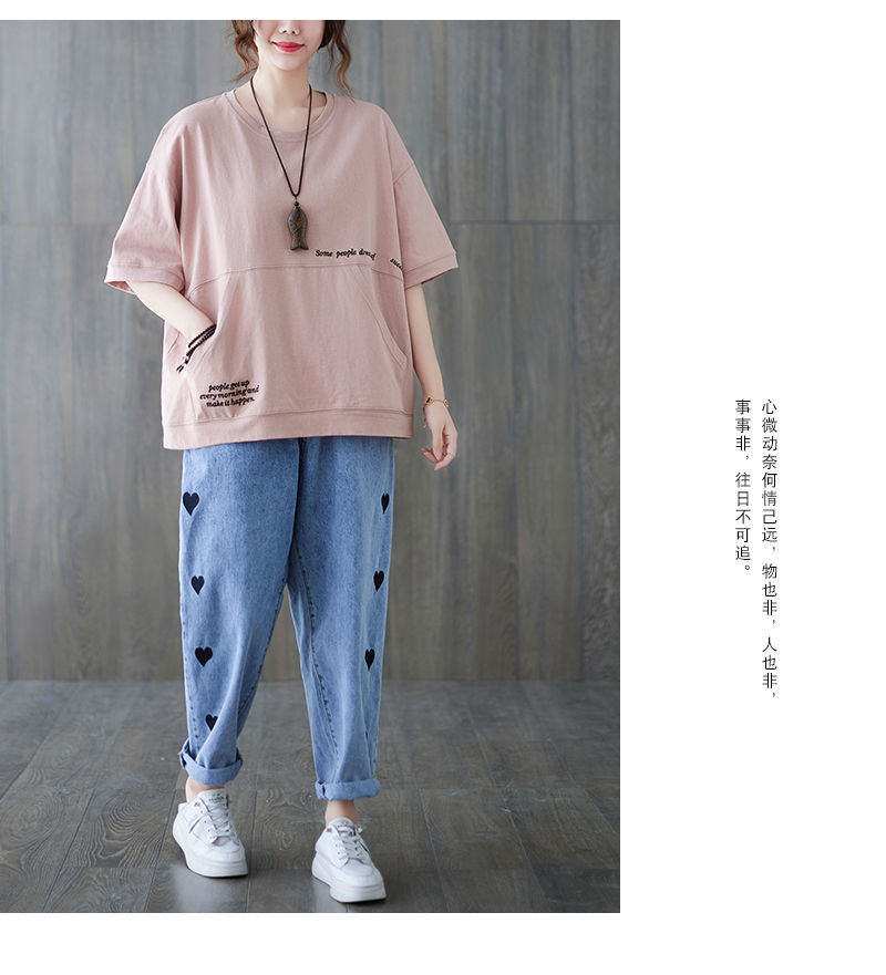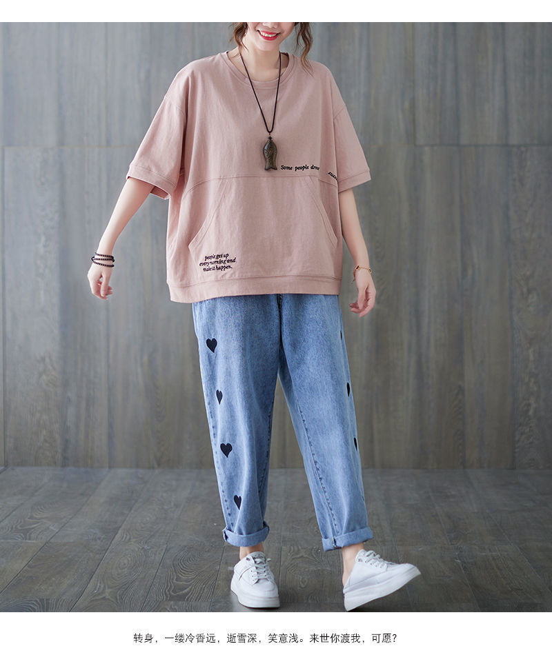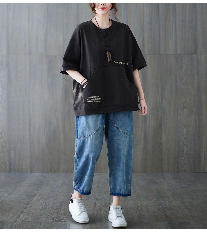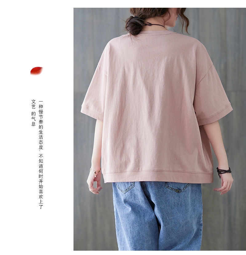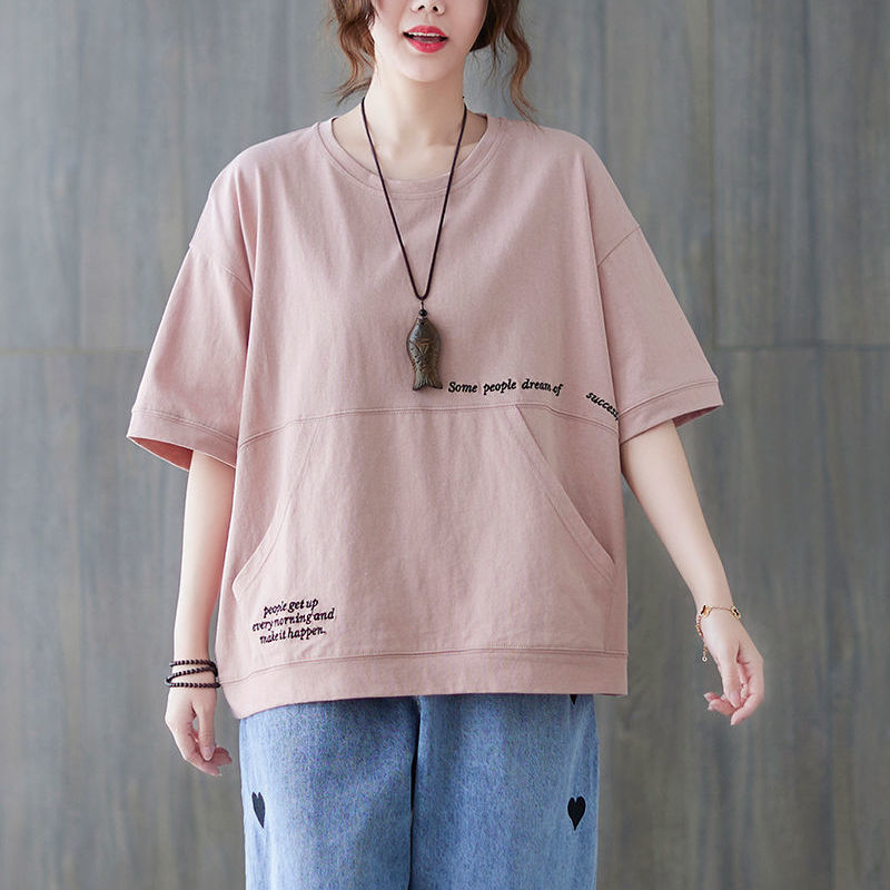 순면 포켓 풀오버 반팔 탑 느슨한 고기 덮음 플러스 사이즈 예술적인 심플한 서양식 디자인 감각 여성 여름 티셔츠