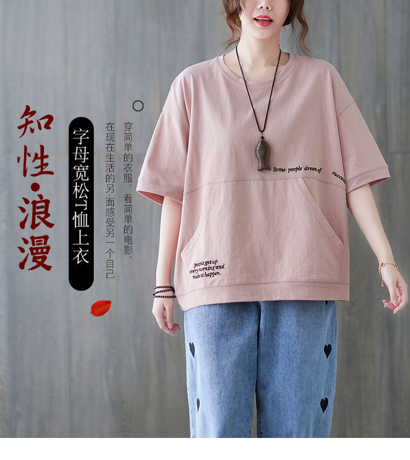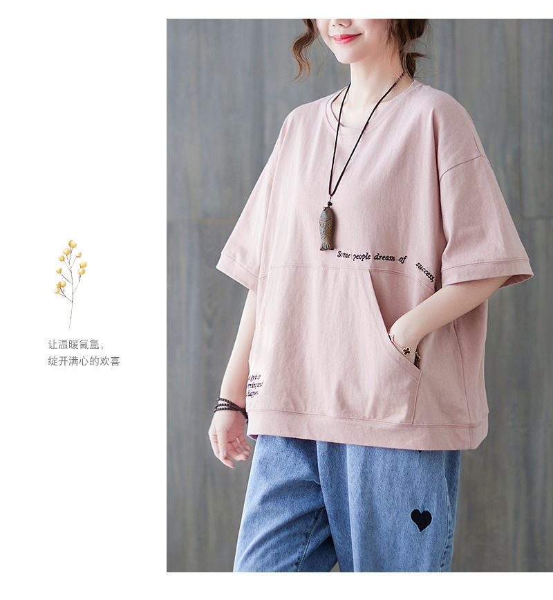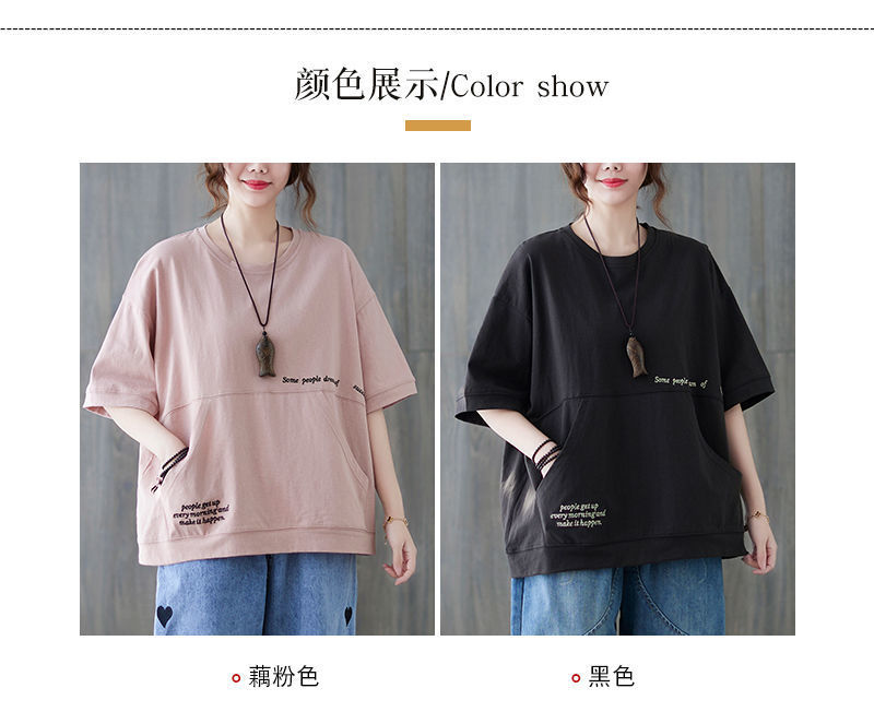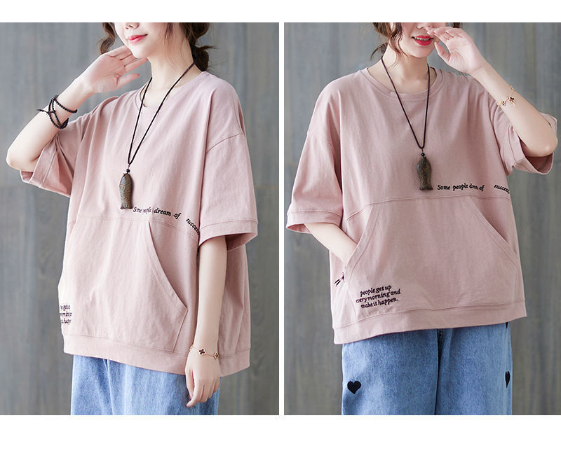 순면 포켓 풀오버 반팔 탑 느슨한 고기 덮음 플러스 사이즈 예술적인 심플한 서양식 디자인 감각 여성 여름 티셔츠스토어 가기