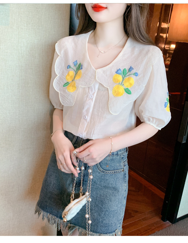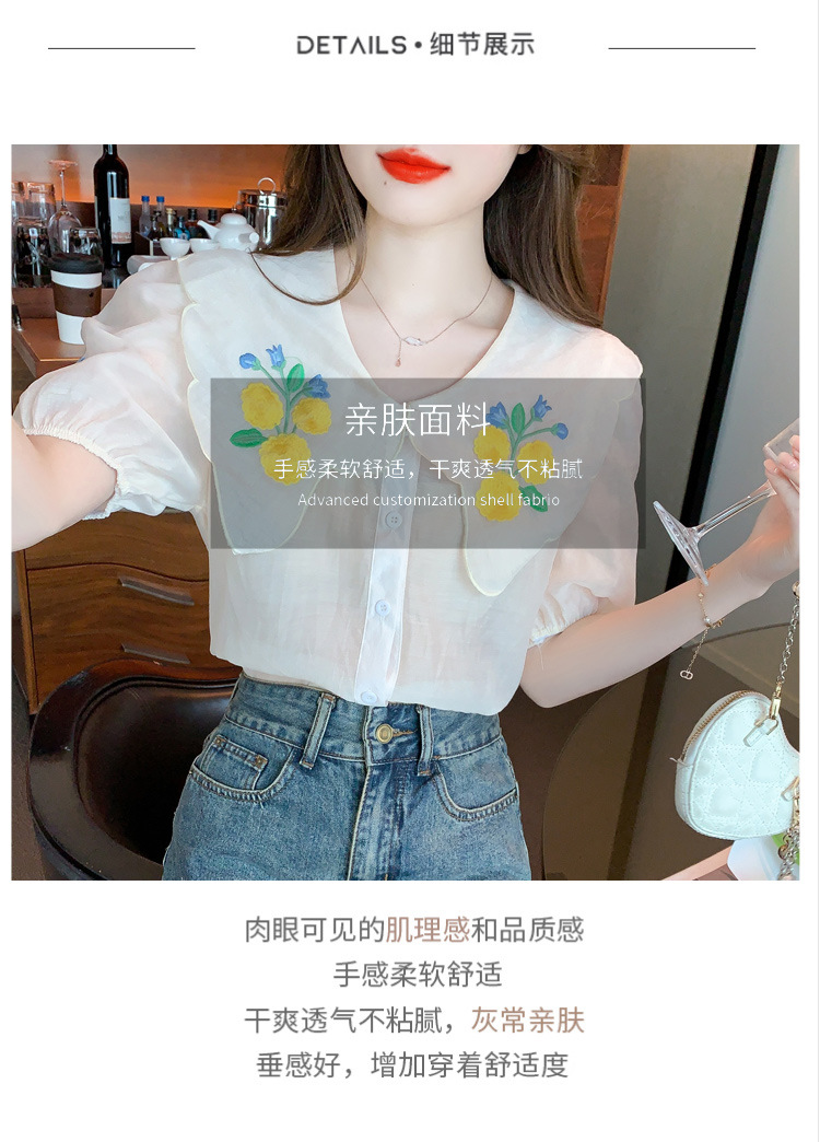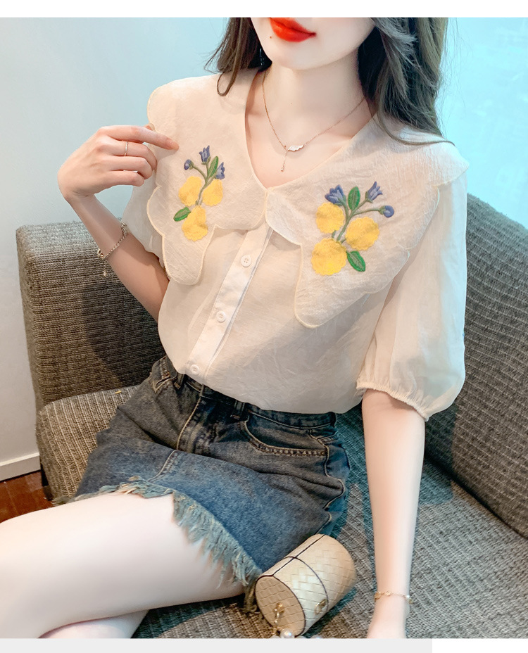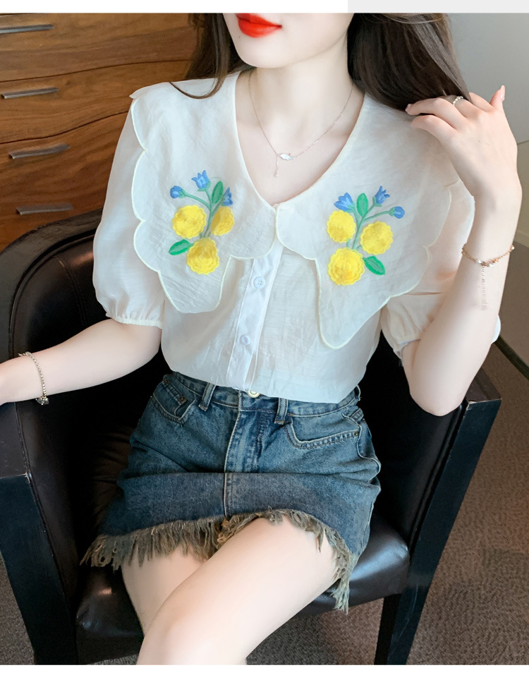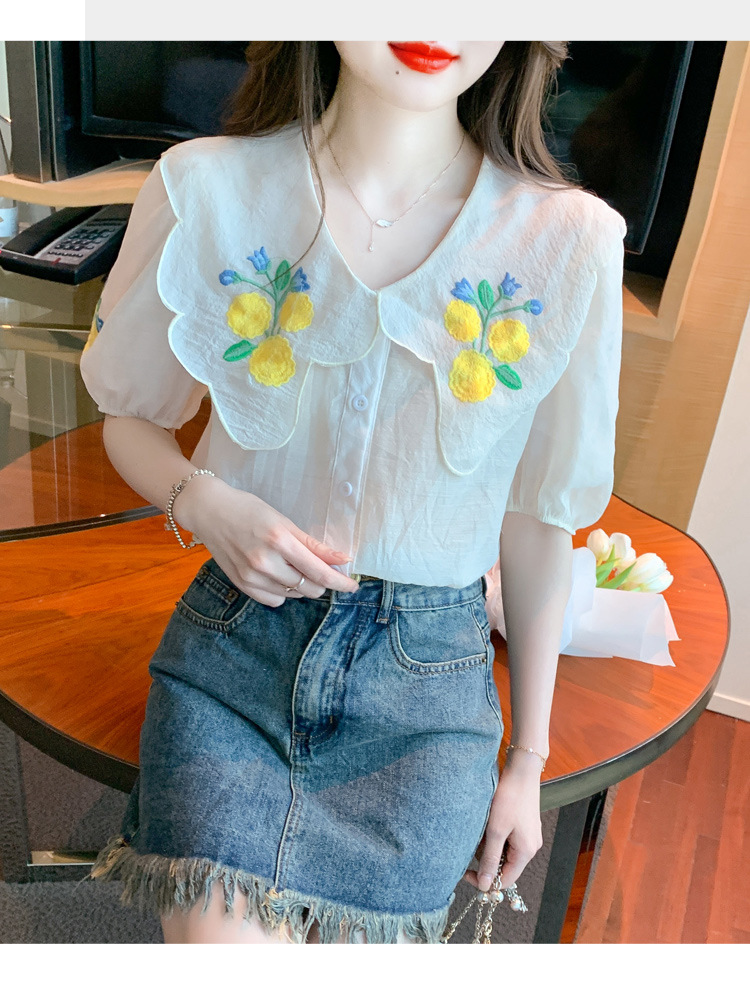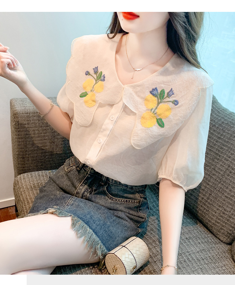 모리 스타일 옐로우 작은 꽃 큰 옷깃 쉬폰 셔츠 프랑스 로맨틱 달콤한 세련된 스타일 퍼프 슬리브 탑